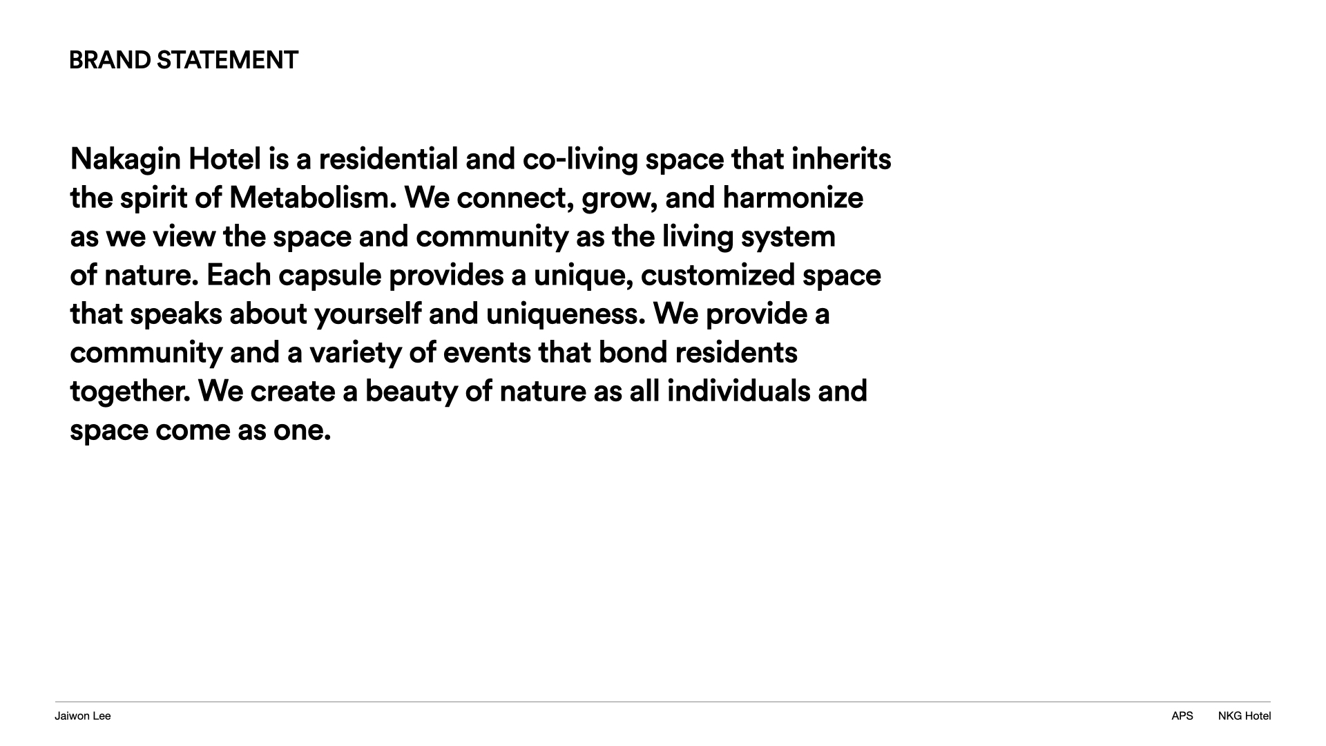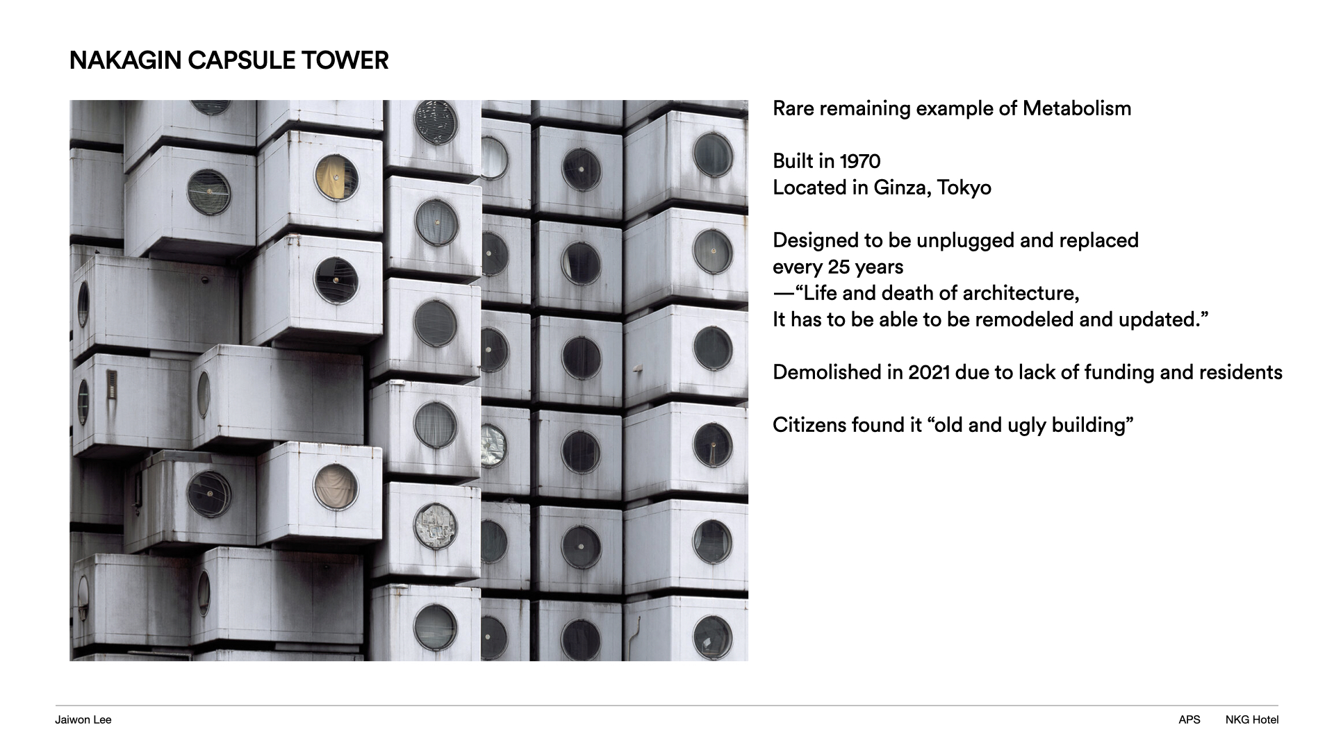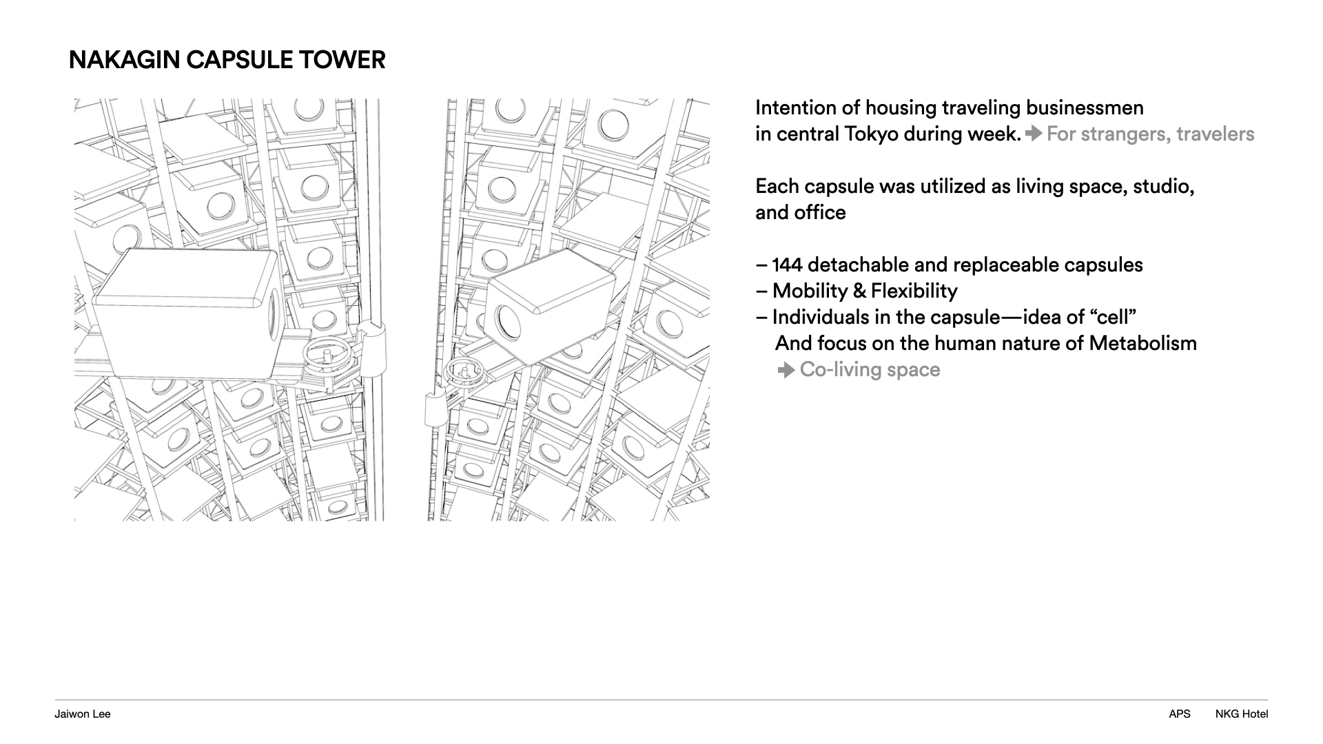 NKG Hotel is a rebranding project for Nakagin Capsule Tower in Japan. The tower is one of the last building to remain as Japanese Metabolism movement symbol, and was demolished. This project honors the idea of Metabolism—viewing people in the architecture as "cells" and "organism"—and rebrands the building as a hotel and co-living space.
