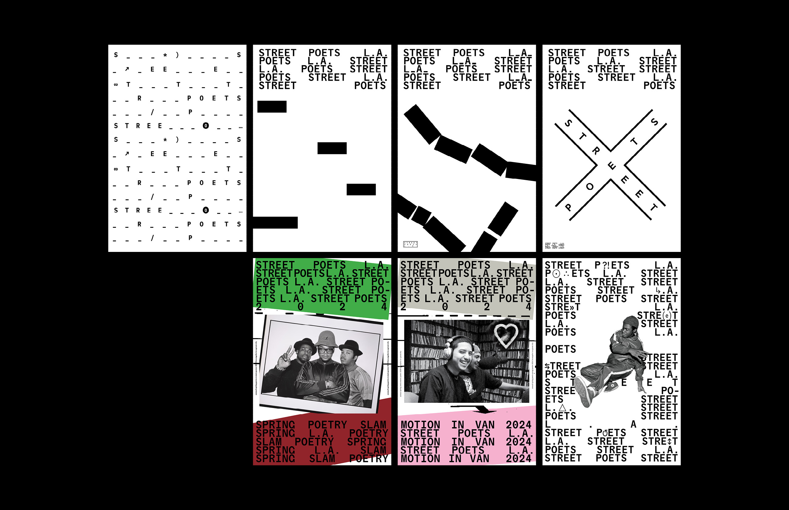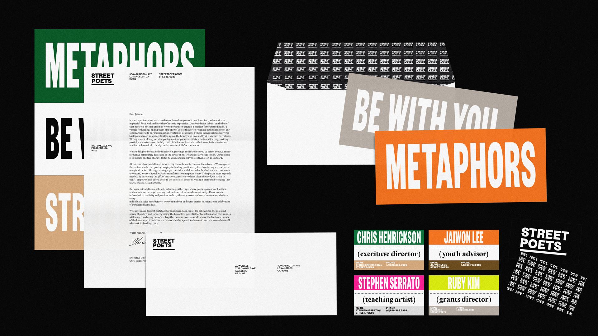 Street Poets is a non-profit organization in L.A. that invites schools, youths in probations, and adults to make and share poetry & music to build community and express themselves. The identity system inspired by street signs in L.A. streets in a diverse languages and typography.
