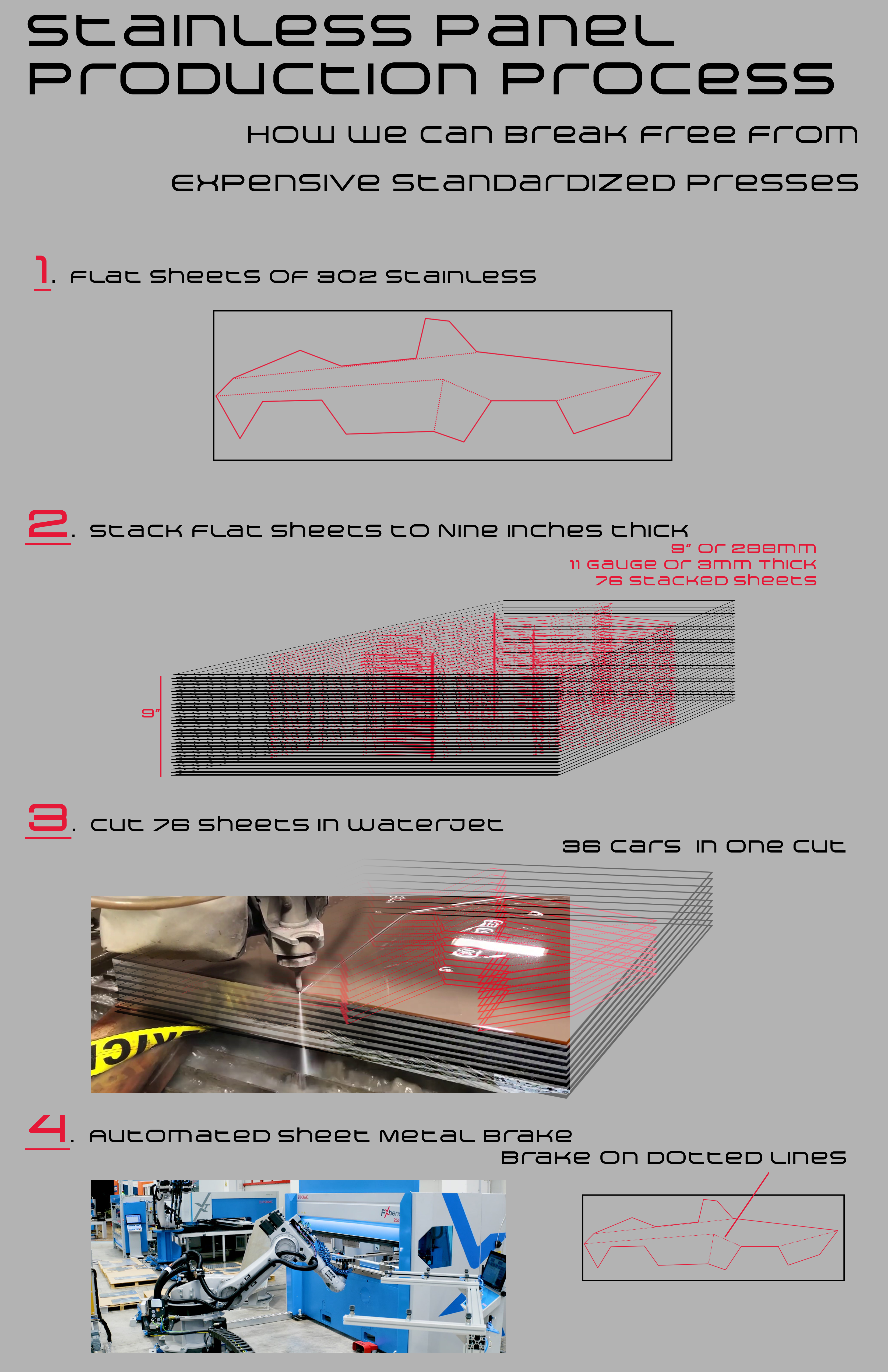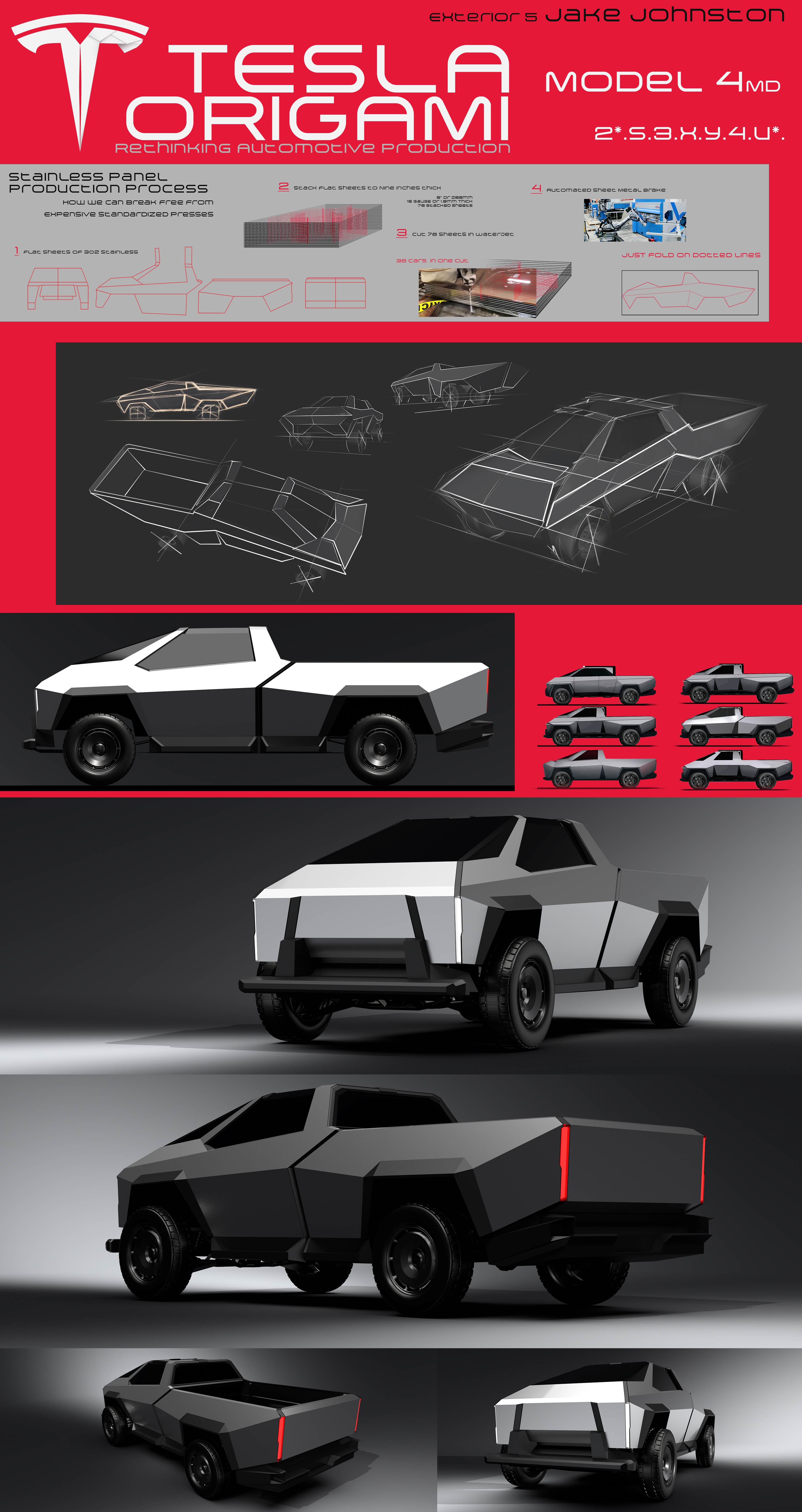 This small pickup truck takes a look at Tesla and their Cybertruck, and shows how their method of production using stainless steel can be expanded. Using the Japanese arts & crafts style of origami and kirigami, the Model 4MD (4 Motor Drive), six outer panels are cut with a laser cutter, and folded to shape. This package and design offers consumers a more standard truck shape, and would receive a much warmer welcome from the public.