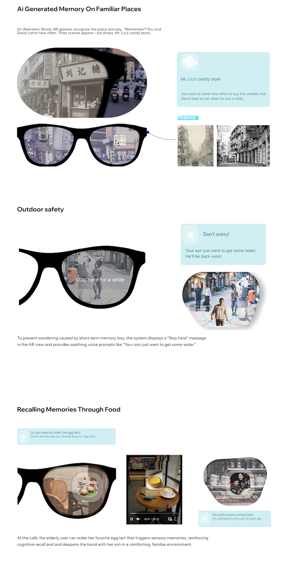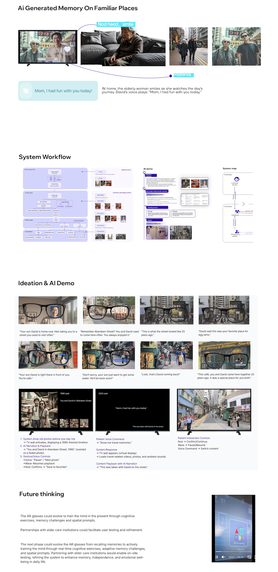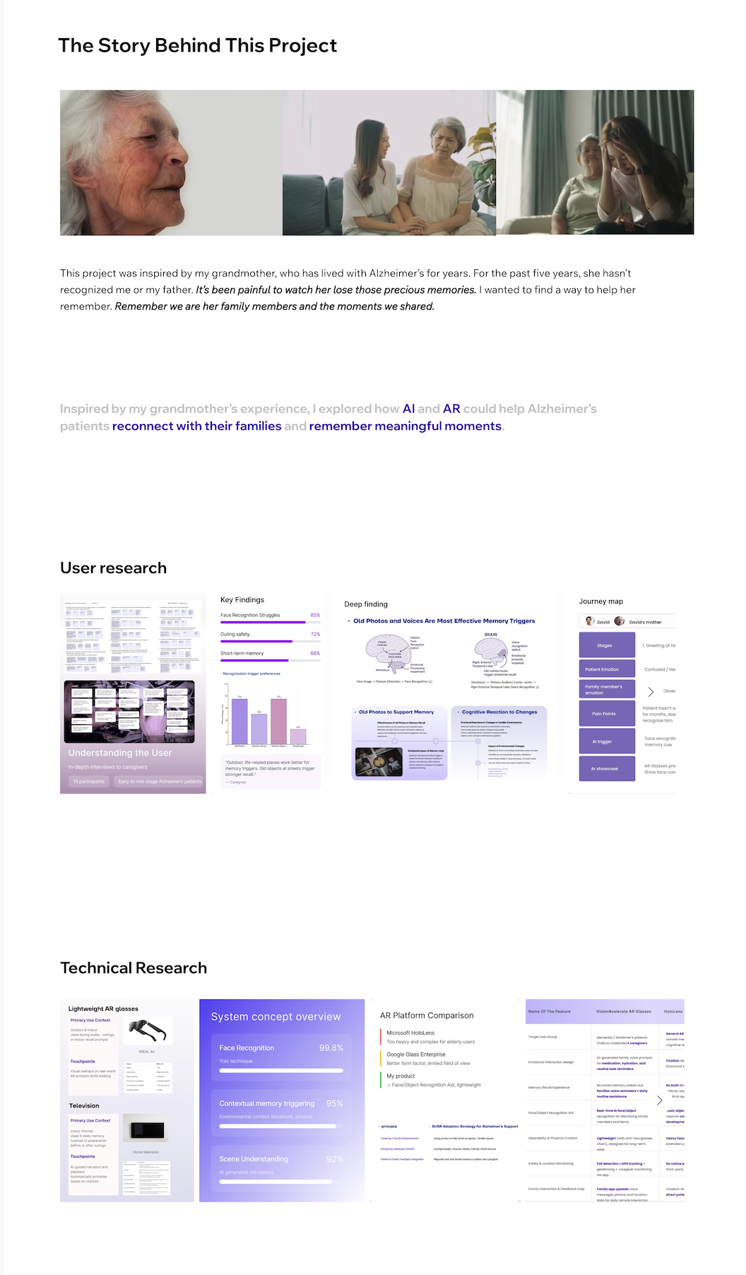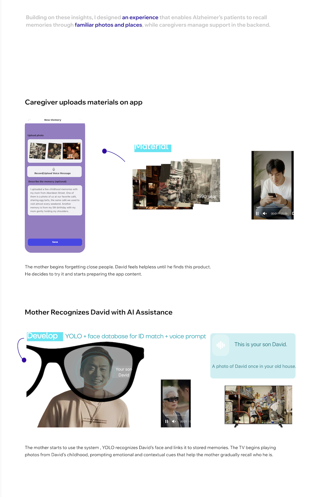 ReMind is an AR+AI cognitive support system designed to aid memory recall in people with Alzheimer’s disease. By integrating facial, image, and voice recognition, the system helps users reconnect with personal memories and meaningful relationships.