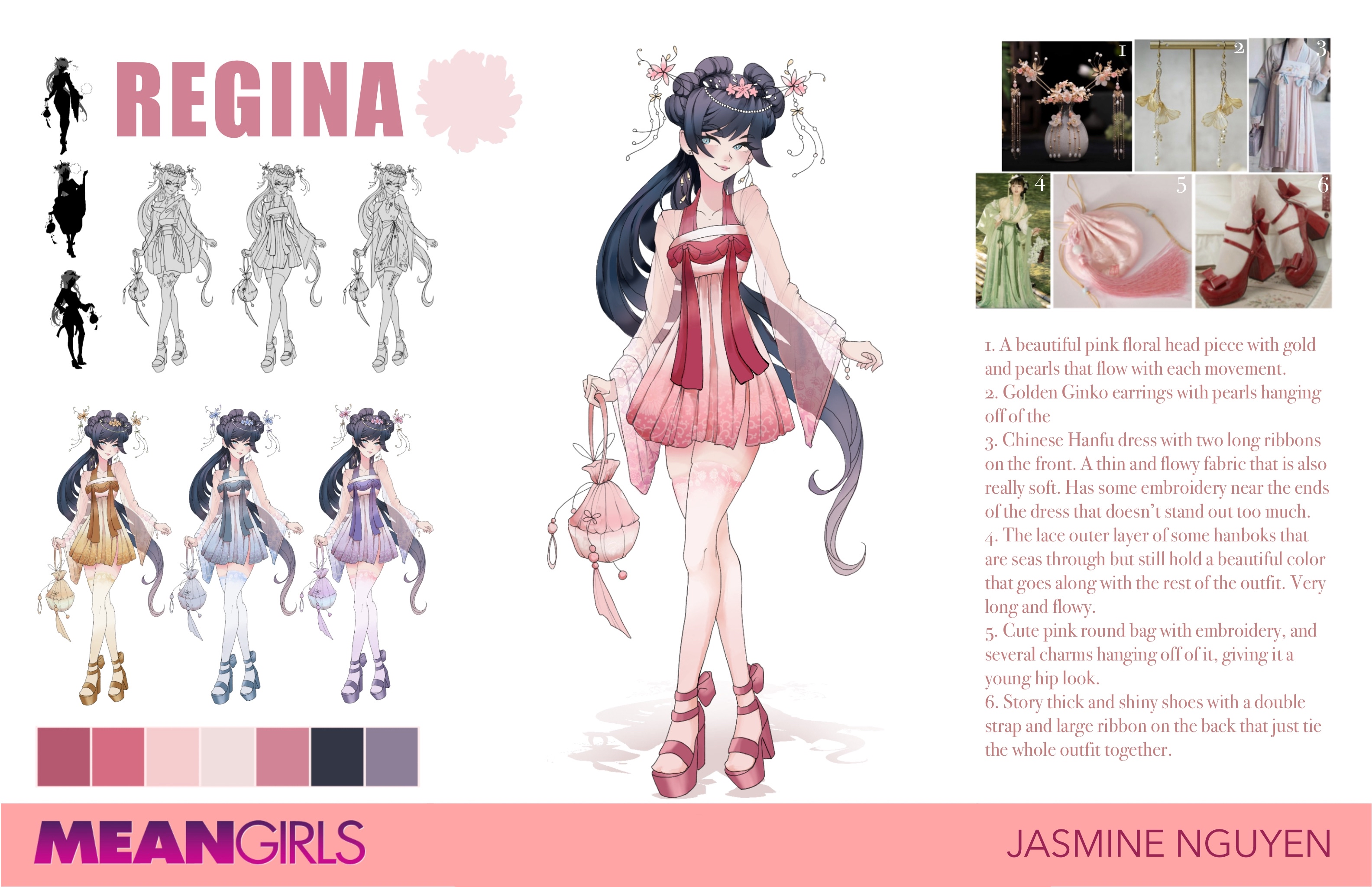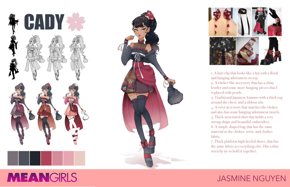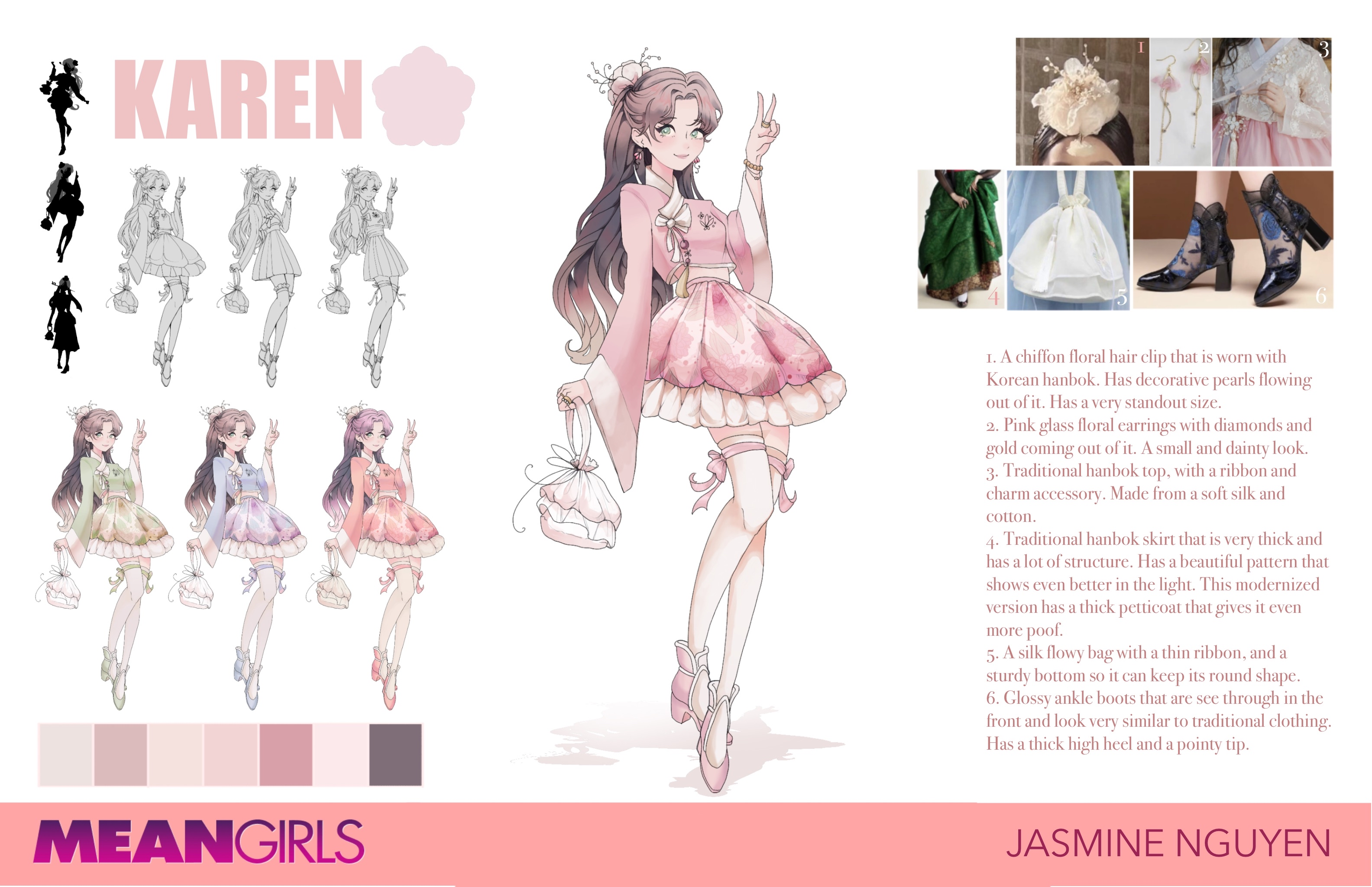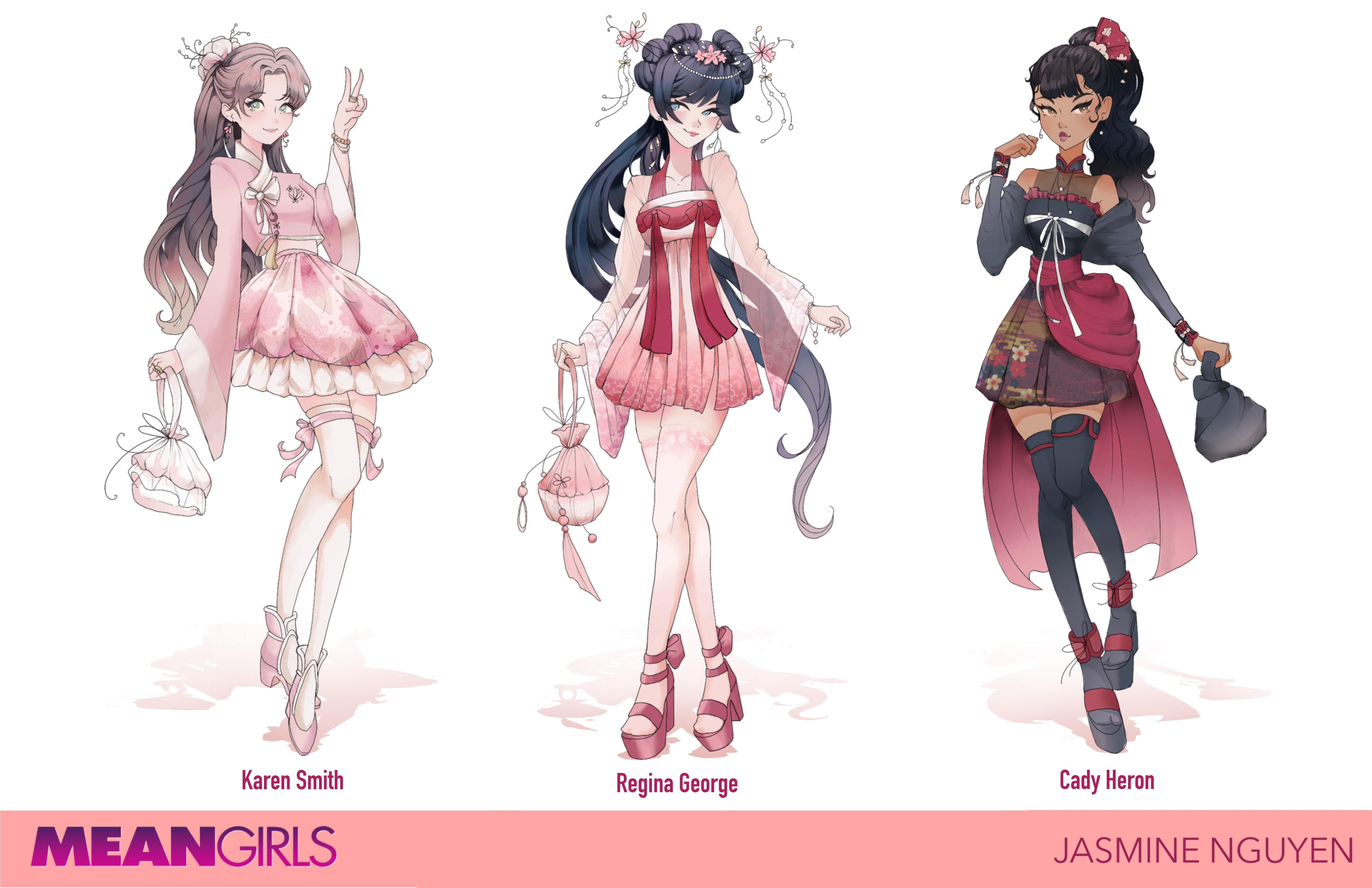 I picked three very different girls from the movie, and gave each one a different ethnicity. I gave Karen Korean, Regina Chinese, and Cady half Black and half Japanese. I gathered many photos of each traditional clothing, and accessories as well as modern clothing and combined the two.