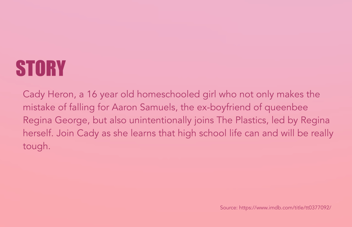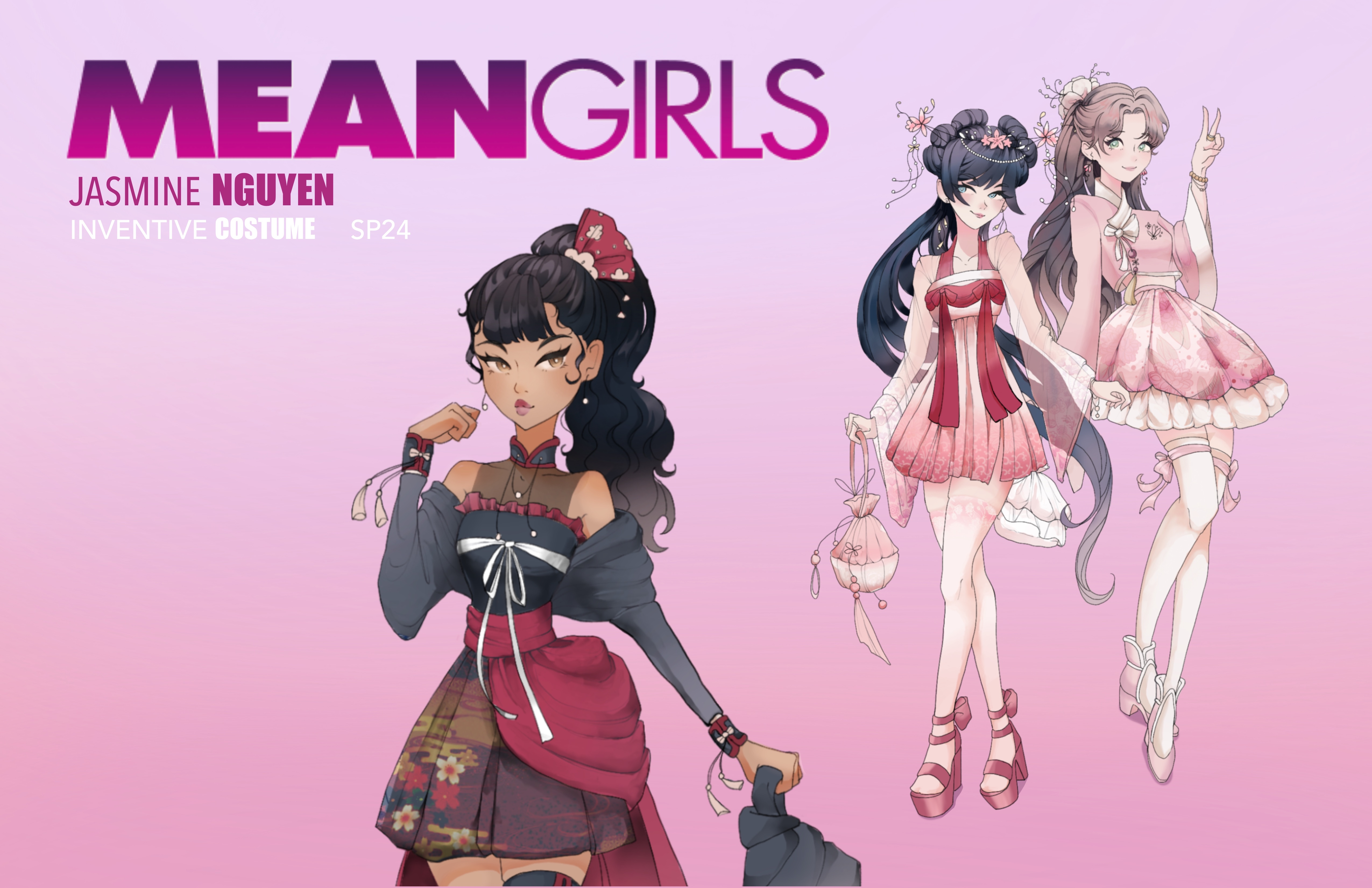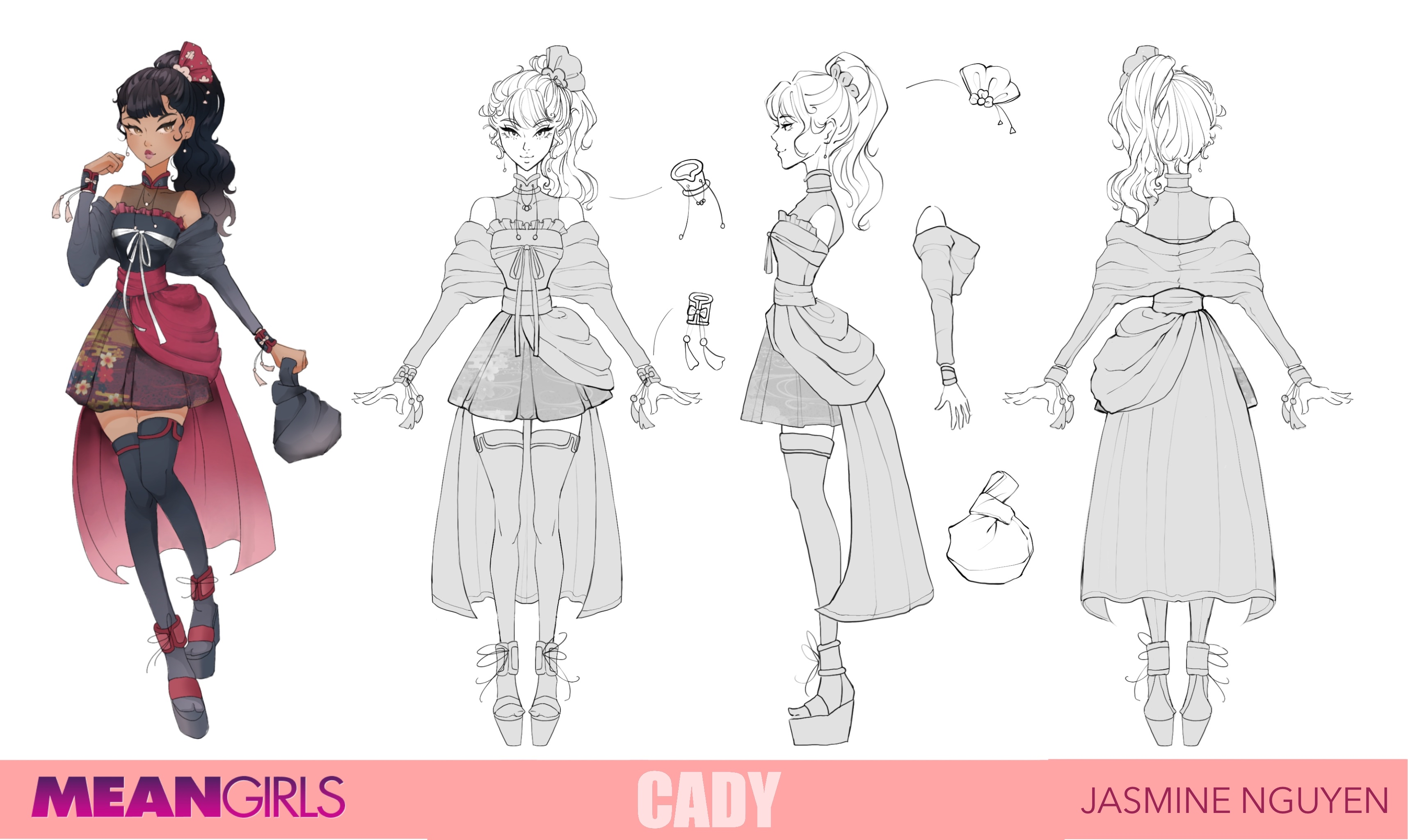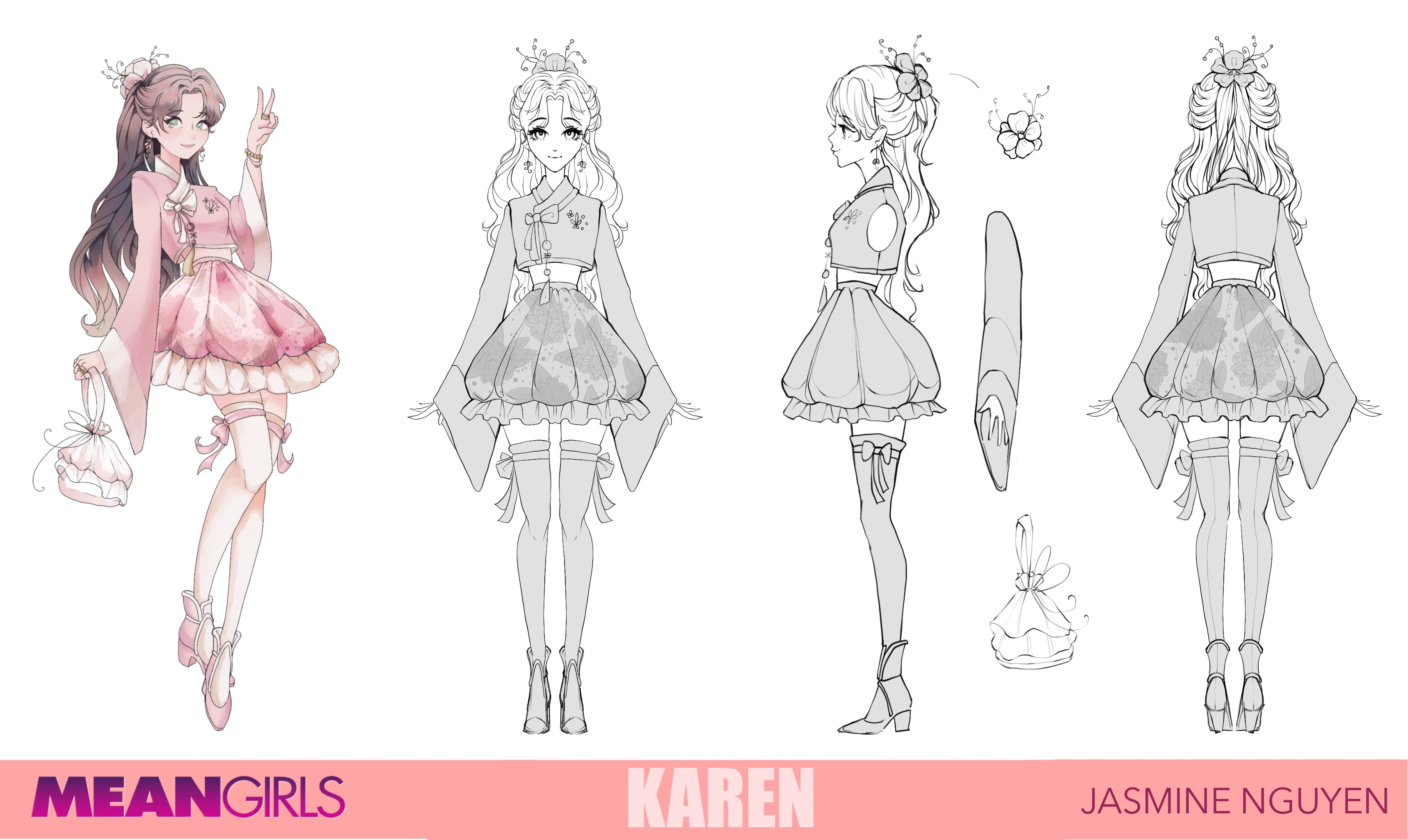 I picked three very different girls from the movie, and gave each one a different ethnicity. I gave Karen Korean, Regina Chinese, and Cady half Black and half Japanese. I gathered many photos of each traditional clothing, and accessories as well as modern clothing and combined the two.