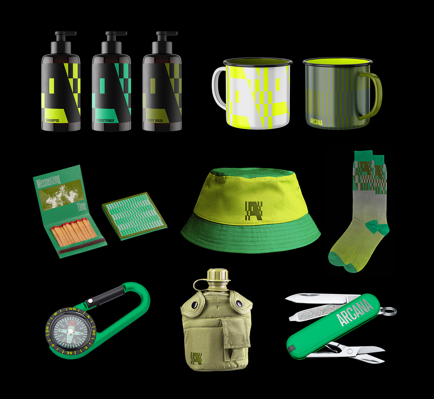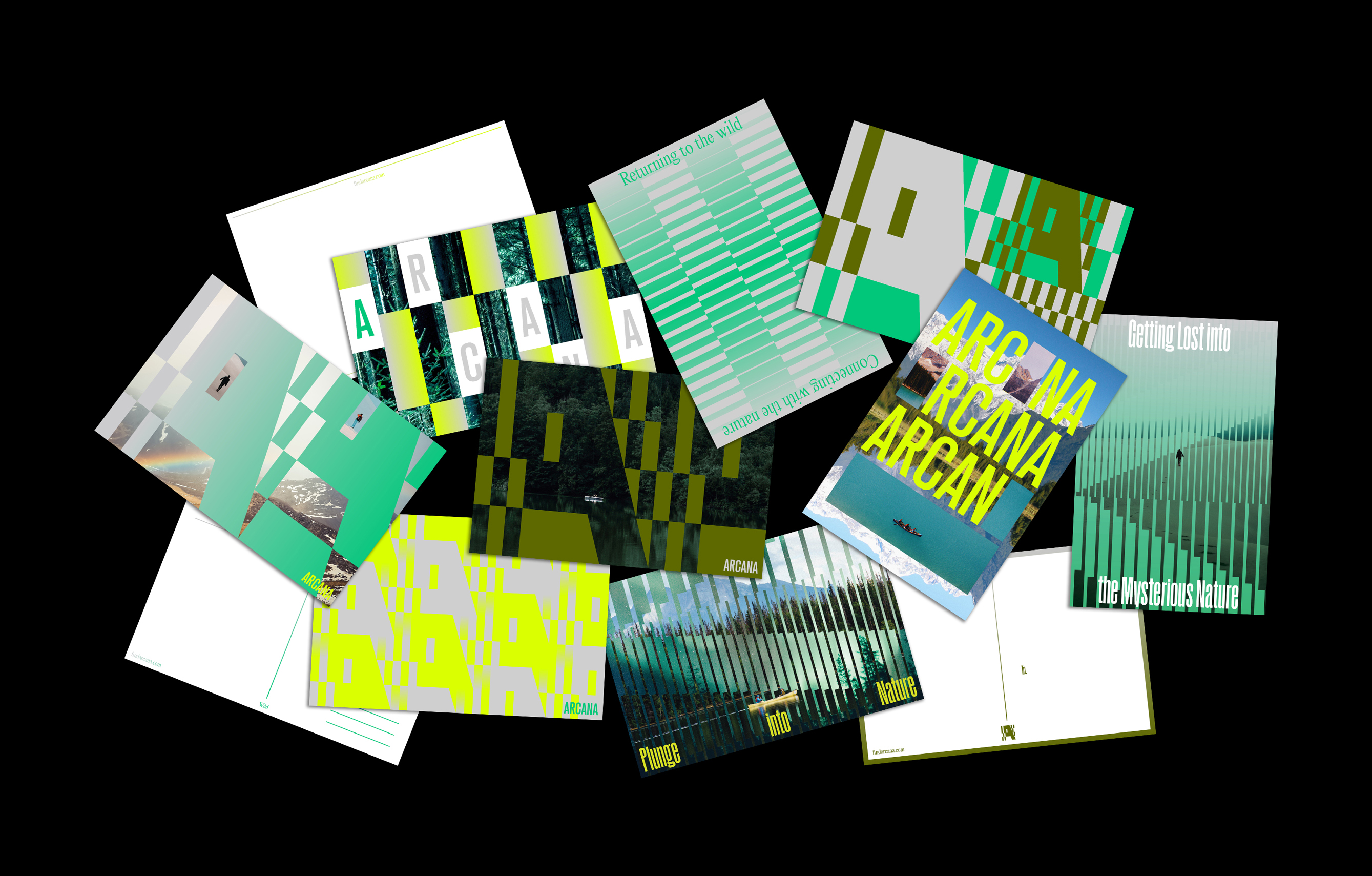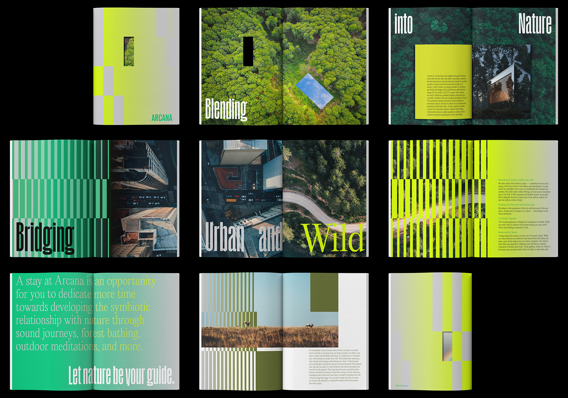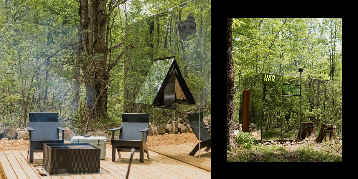 Immersive nature retreat Arcana is located in hidden forest, a few-hour drive away from the city. Arcana offers an exclusive stay and memorable experience connecting with the power of nature. The cabins are clad in reflective stainless steel and are virtually invisible in the surrounding nature. The identity system is rooted in the unique value of Arcana—bridging urban and wild, blending into nature.