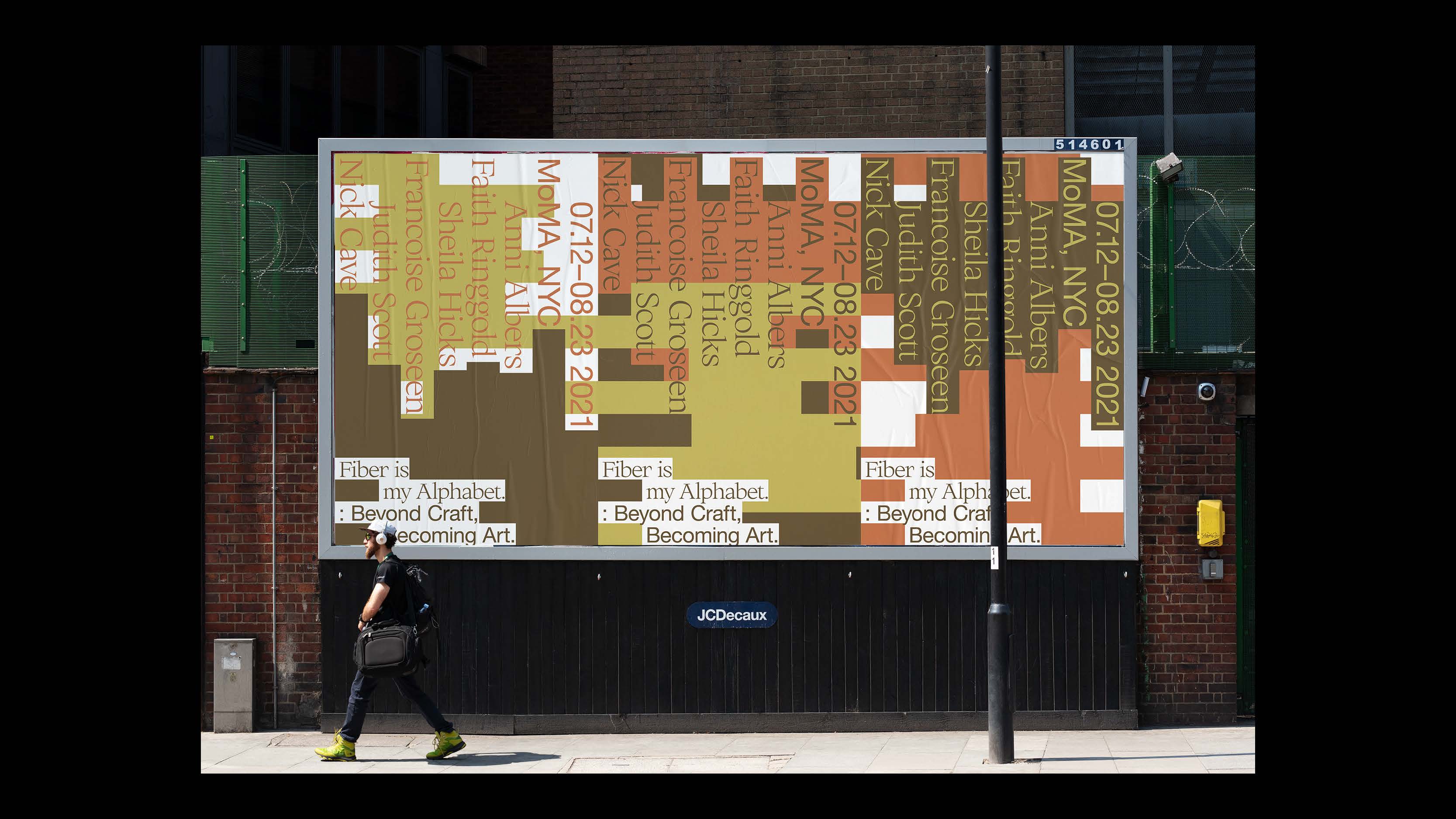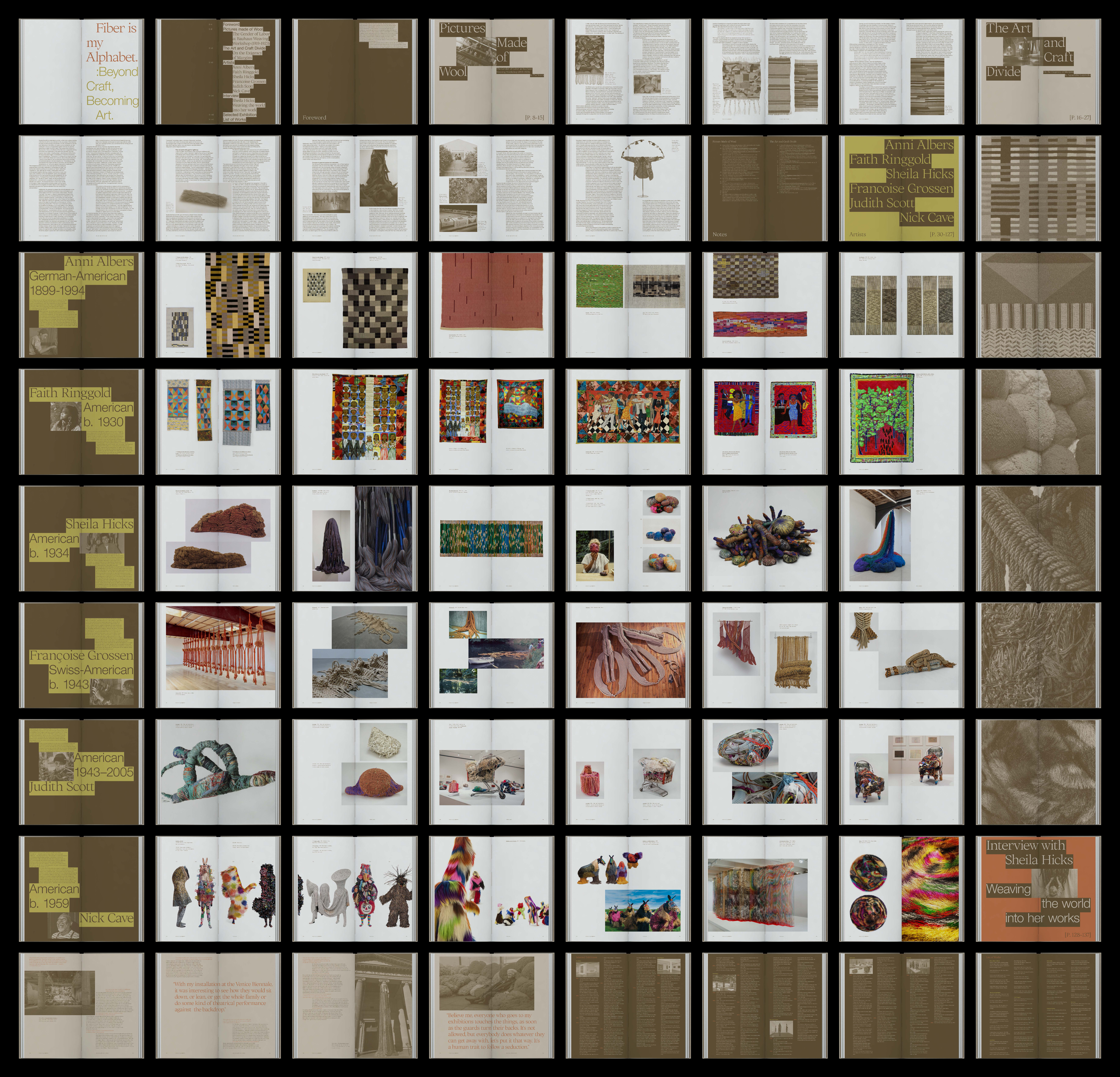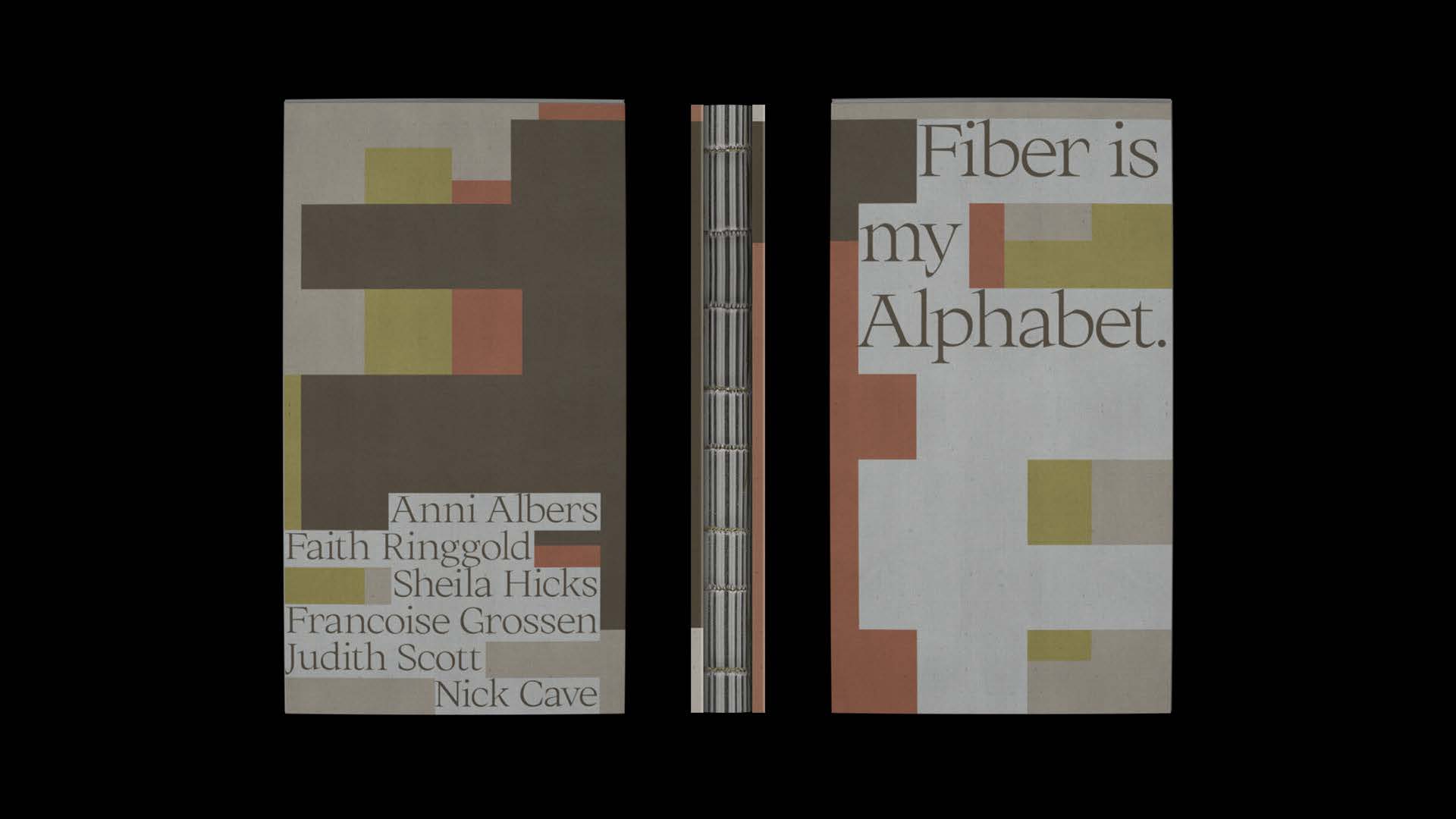 Fiber is Alphabet is an exhibition showcasing artists who redefined textile art beyond tradition, exploring new interpretations and expanding its scope. It highlights the evolution of textile and fiber media into a new art form, challenging stereotypes and traditional uses. The exhibition and catalog design re-imagine traditional weaving mechanisms, using vertically stacked graphic shapes to represent the movement and interweaving of threads on a loom.