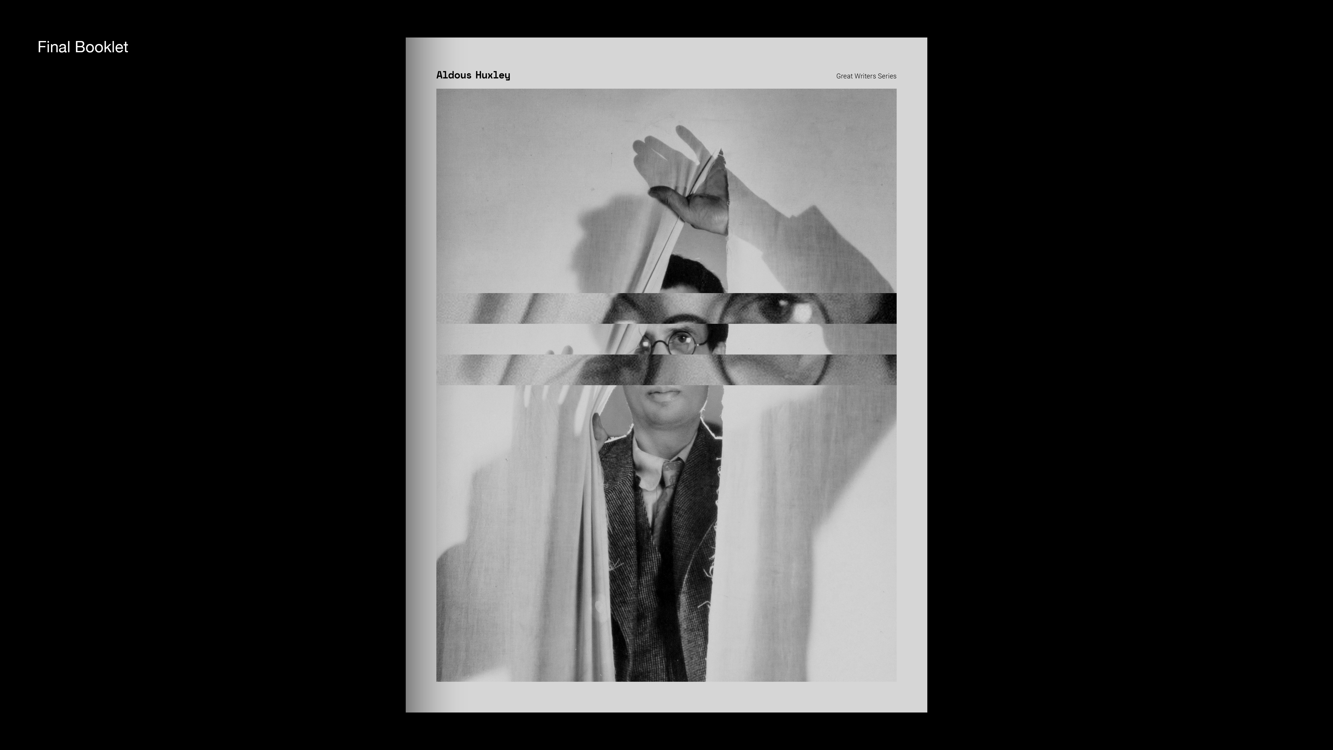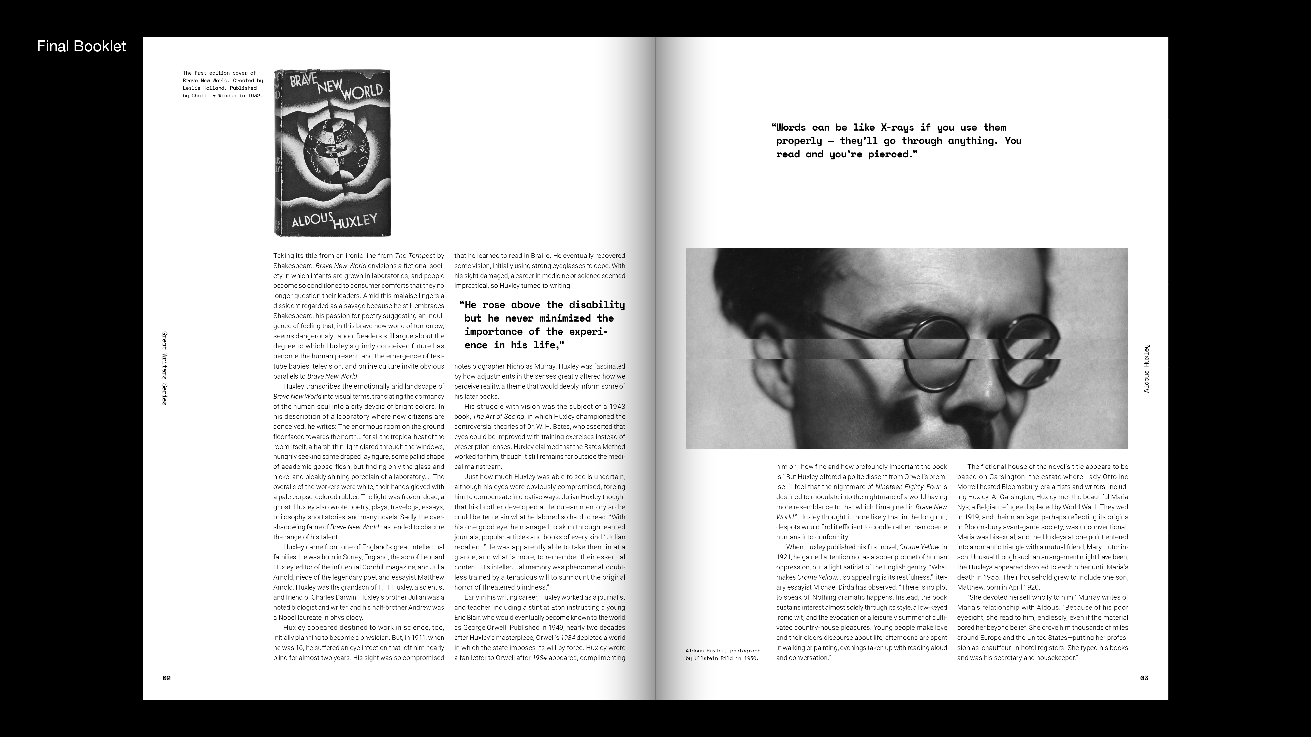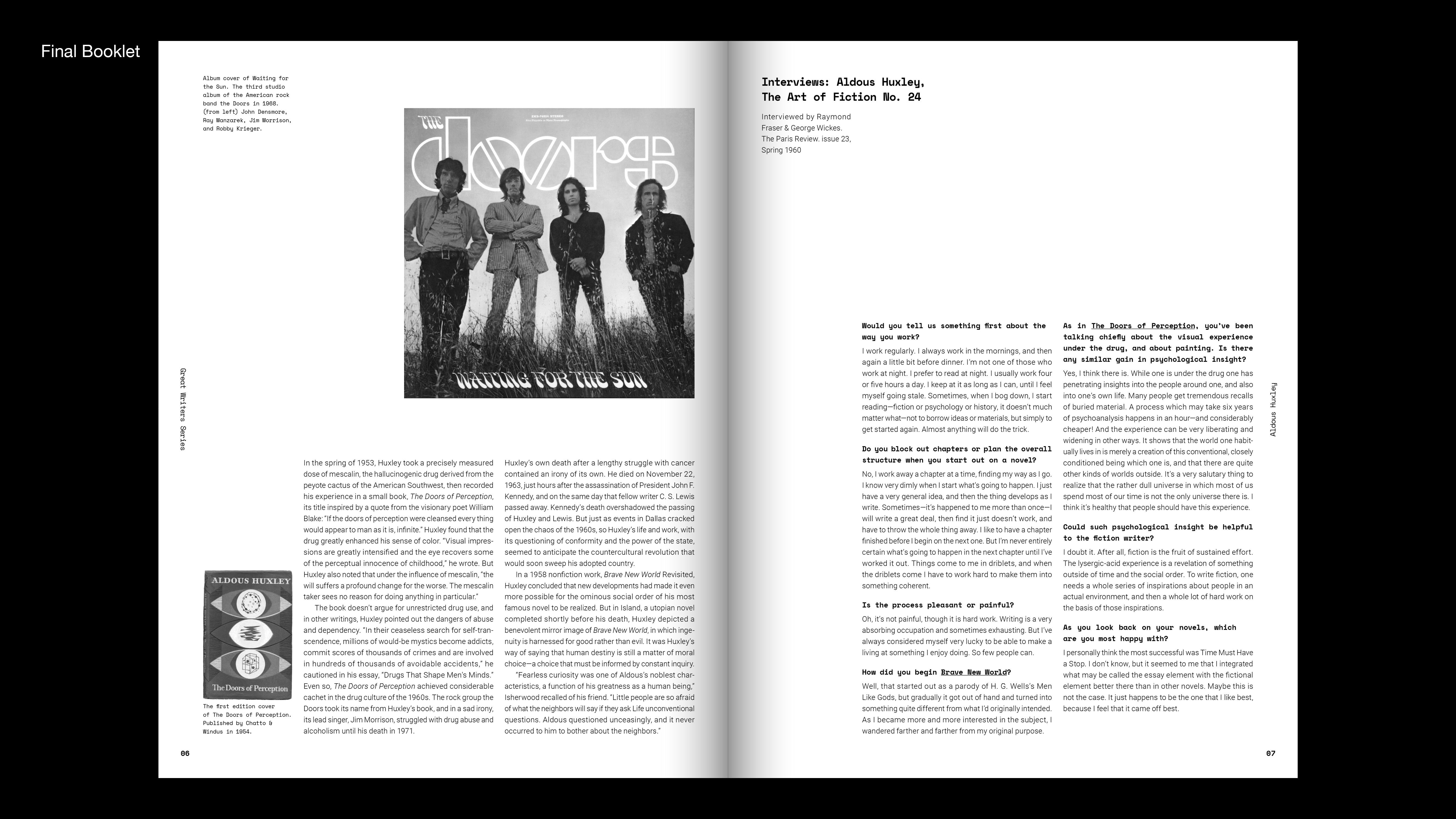 Great writers series is 8 paged booklet about writer's life and works. Aldous Huxley is well-known for his dystopian science fiction, Brave New World. Also, He was interested in mysticism led him to experiment with the mescaline, which he wrote about in The Doors of Perception. I connected his works to graphics of book. I did cut and shift images of cover and inside pages. It shows psychological and visual changes in a psychedelic state like he wrote in The Doors of Perception.