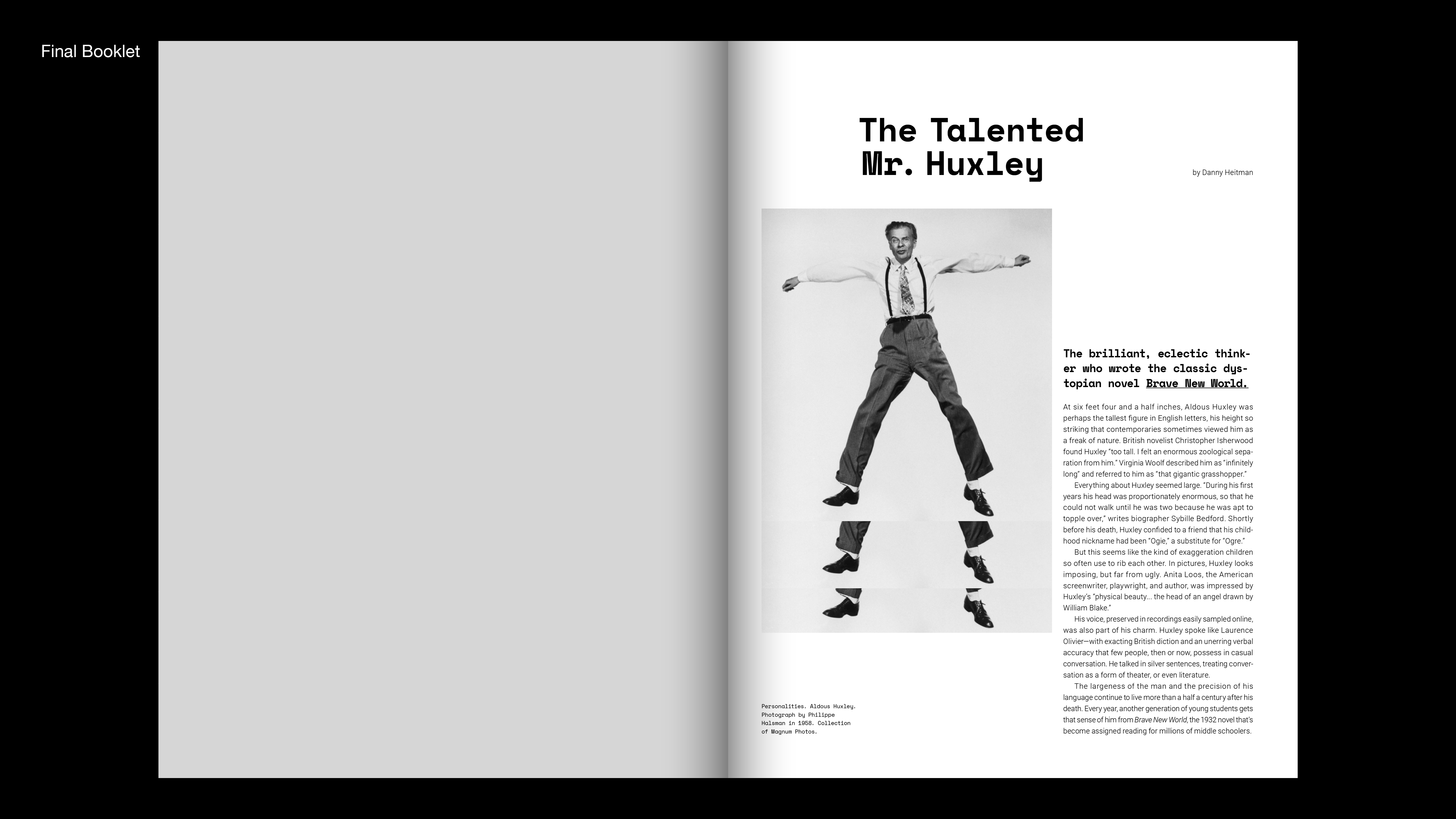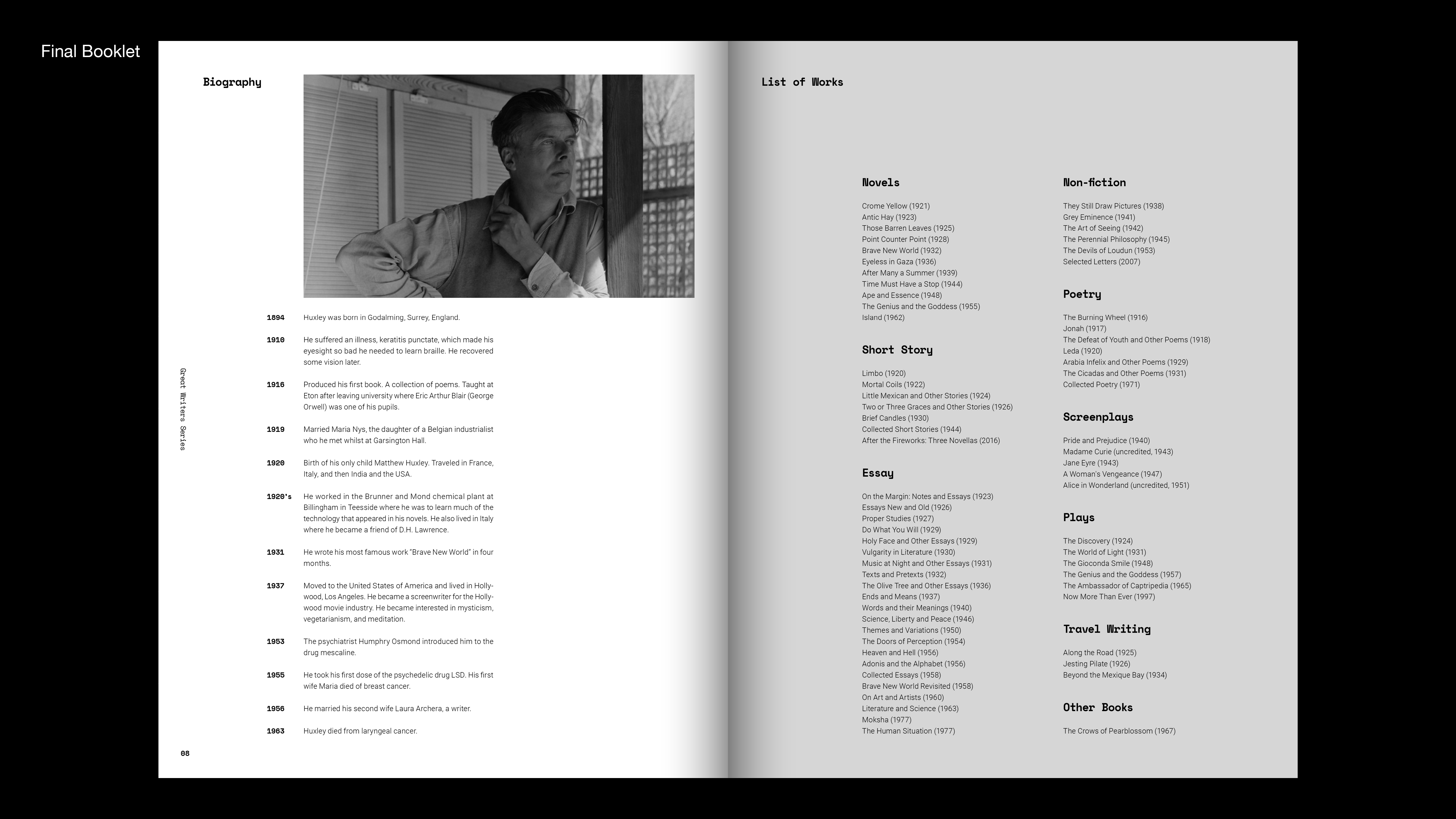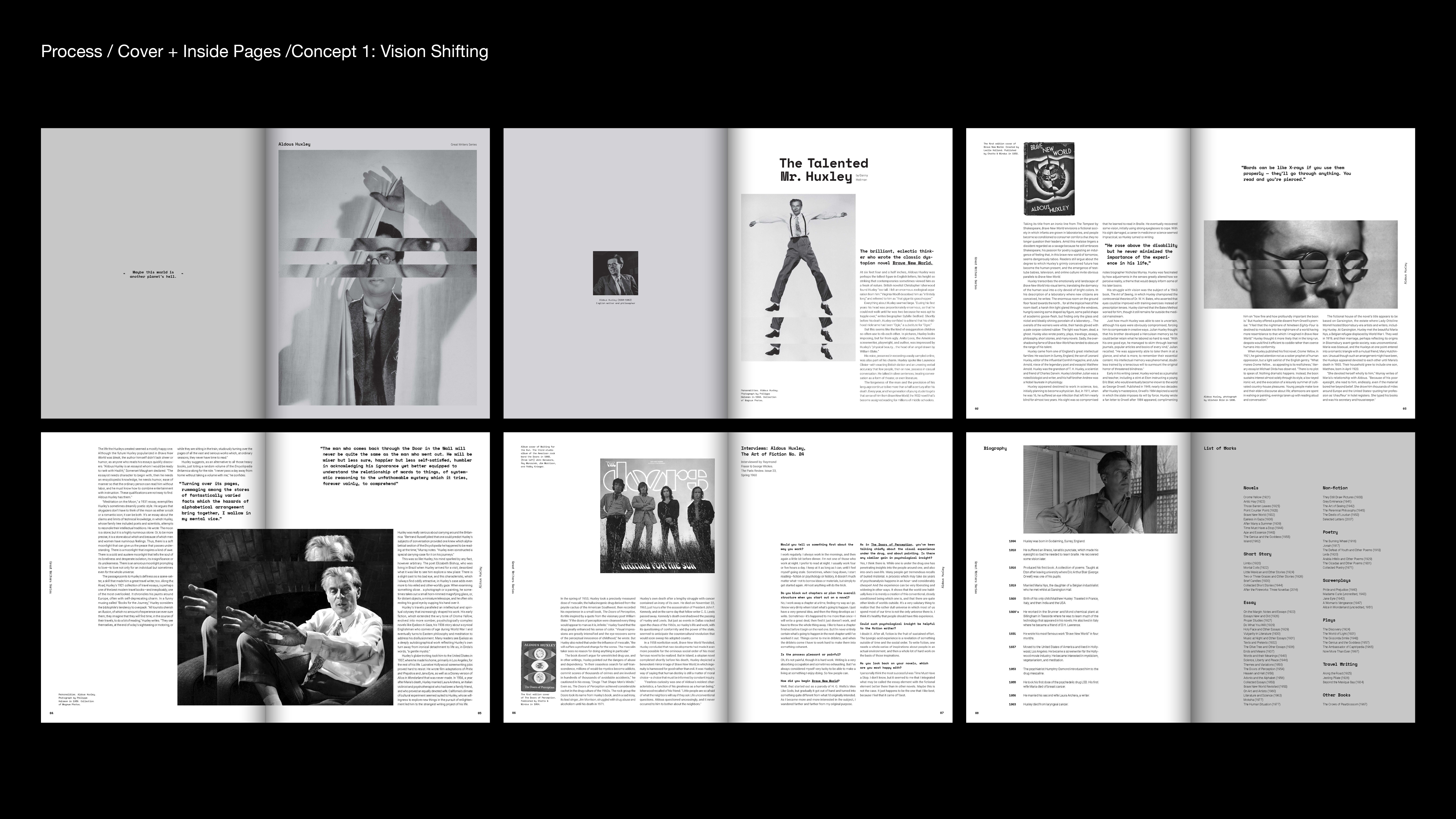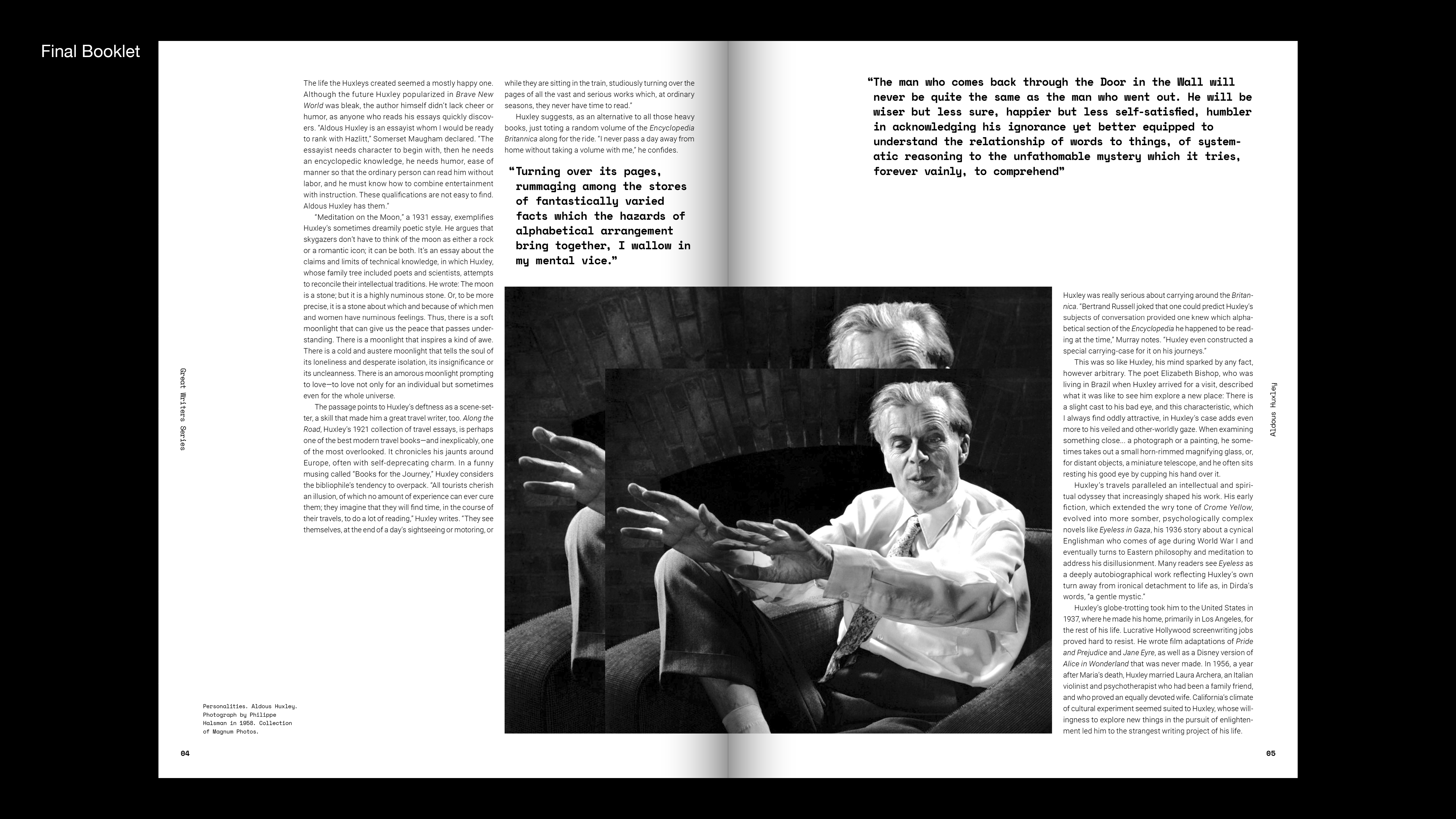 Great writers series is 8 paged booklet about writer's life and works. Aldous Huxley is well-known for his dystopian science fiction, Brave New World. Also, He was interested in mysticism led him to experiment with the mescaline, which he wrote about in The Doors of Perception. I connected his works to graphics of book. I did cut and shift images of cover and inside pages. It shows psychological and visual changes in a psychedelic state like he wrote in The Doors of Perception.