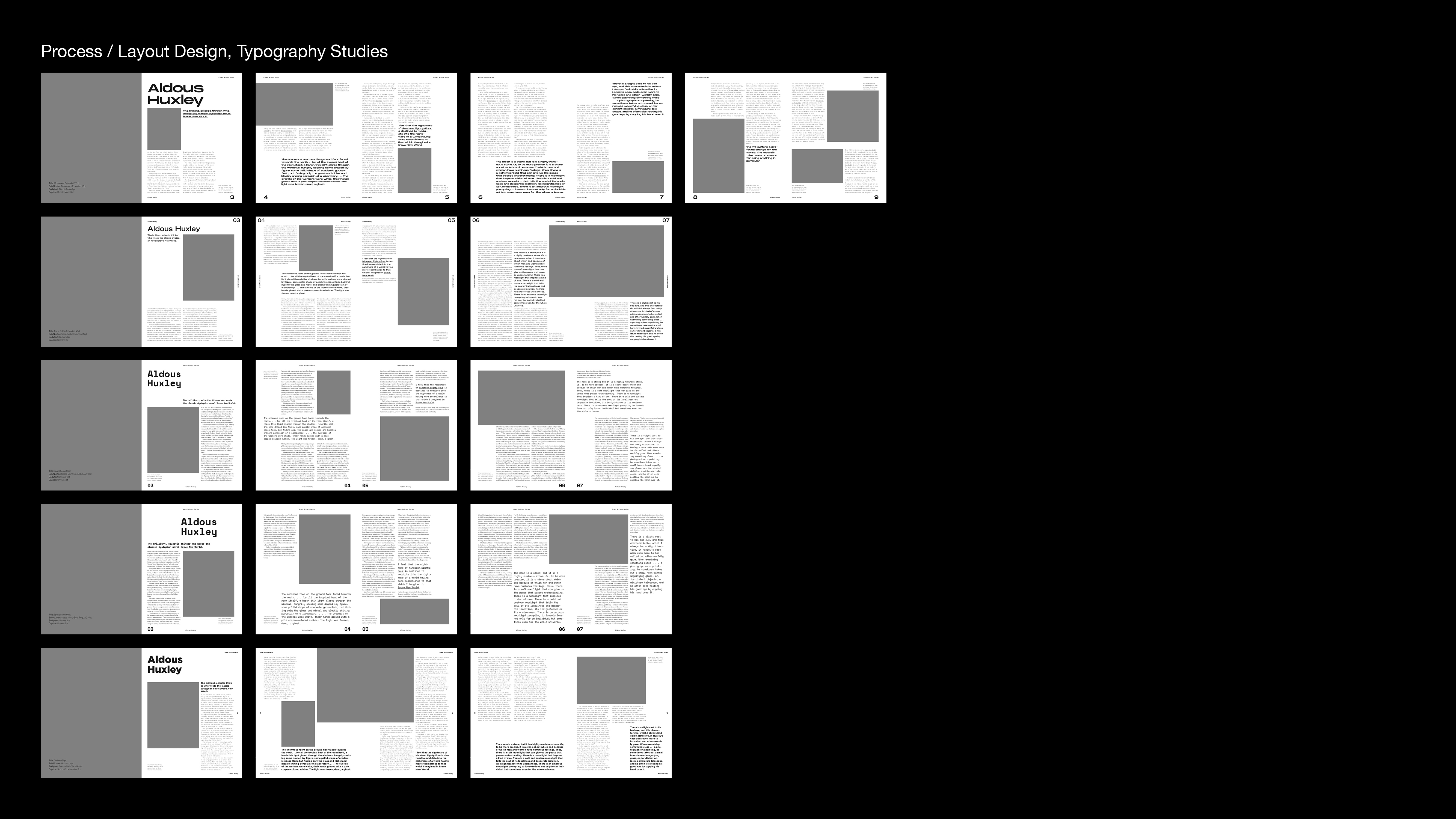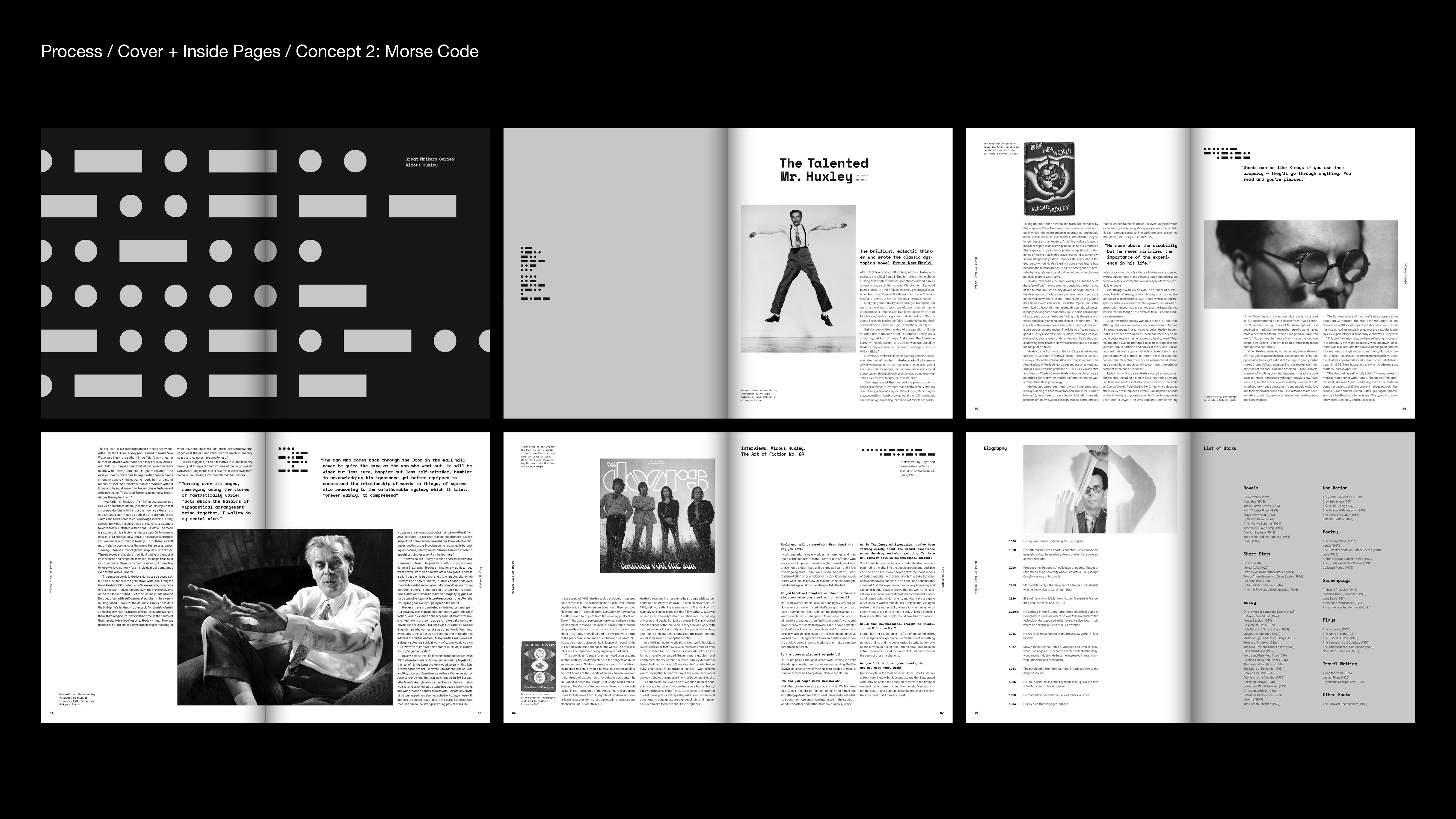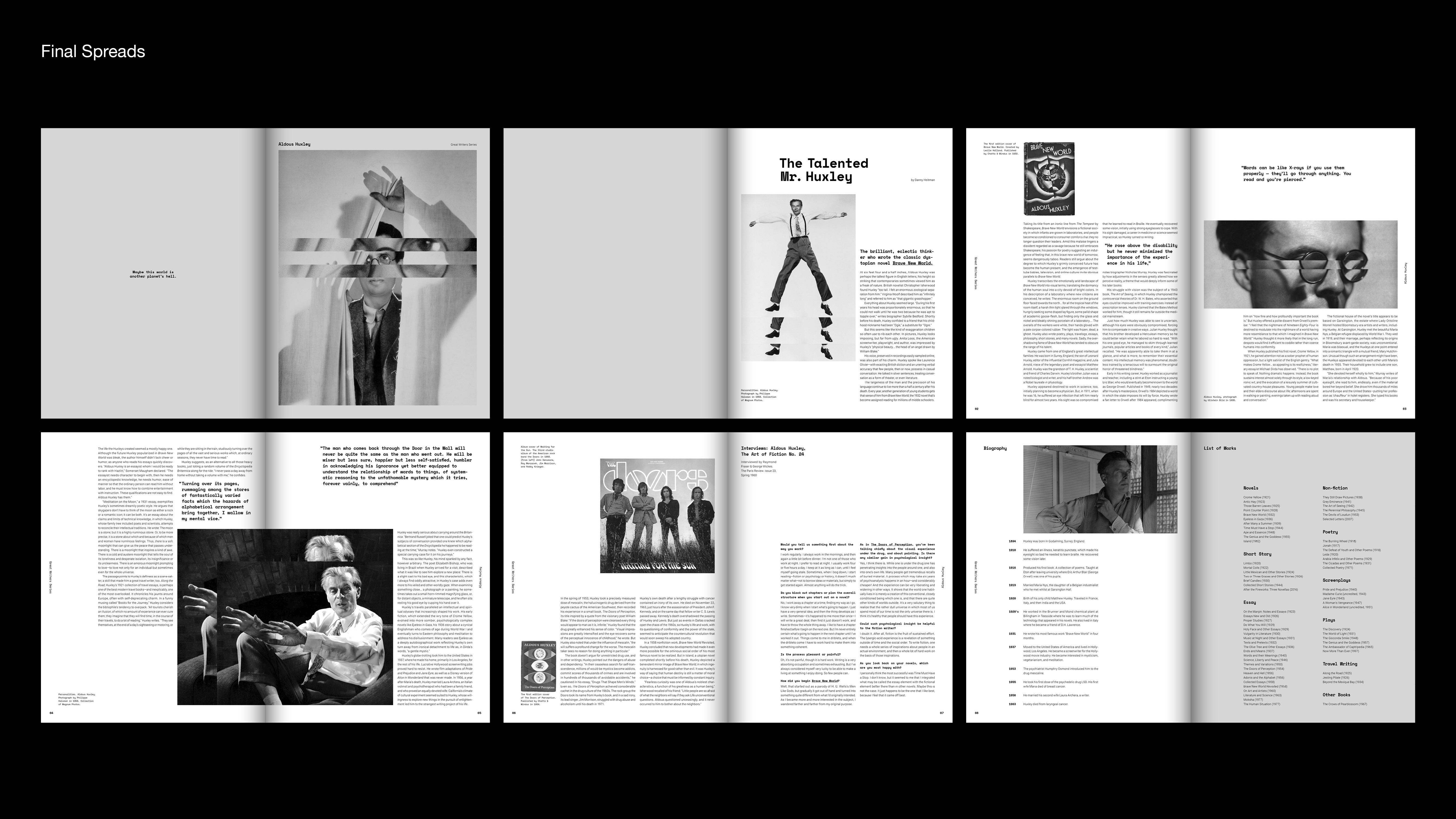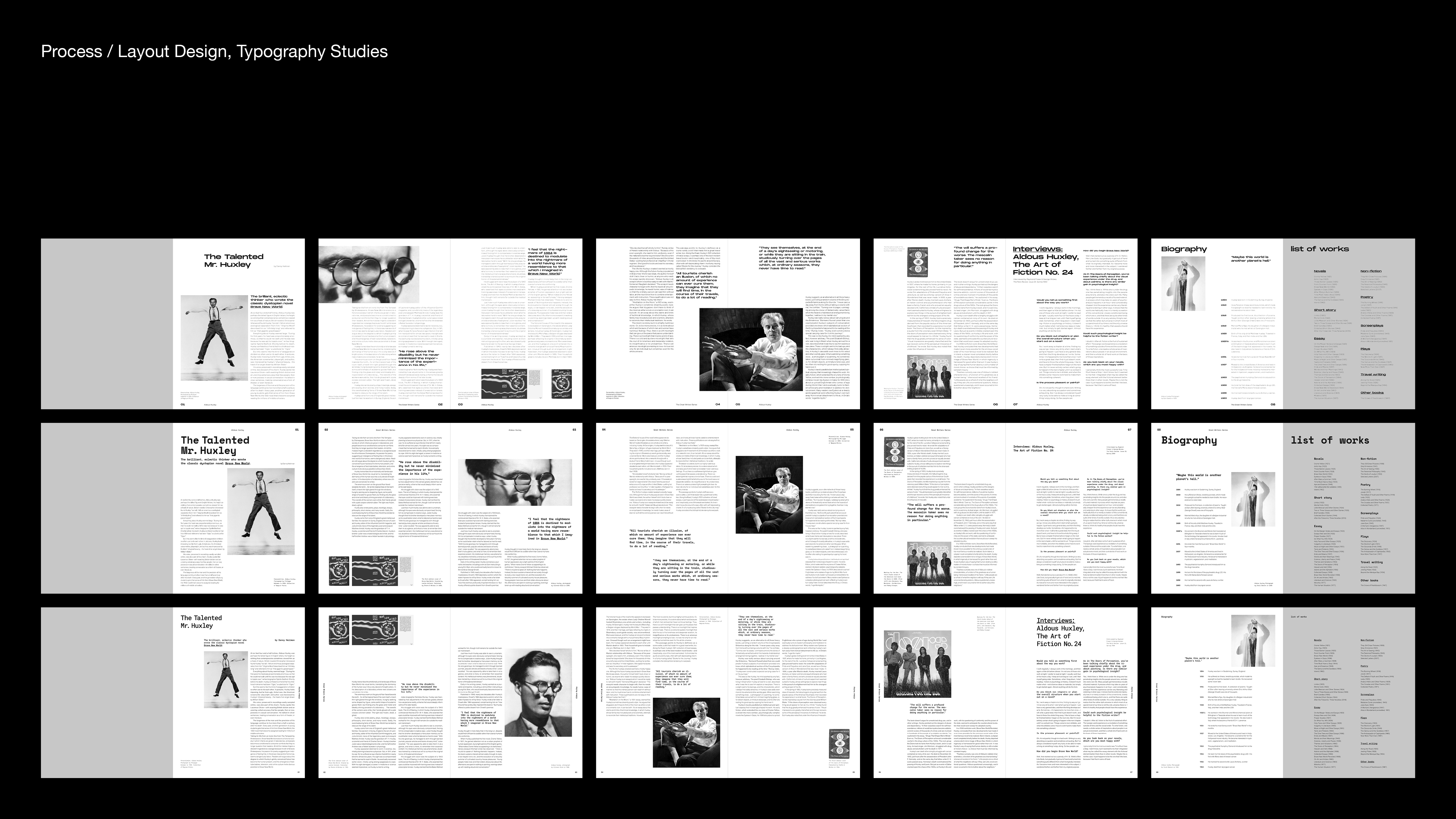I considered how can typography and graphics cooperate with writer's life and works. Decision making on font choice, grids, page sequence and image treatment was important to communicate writer's life visually.