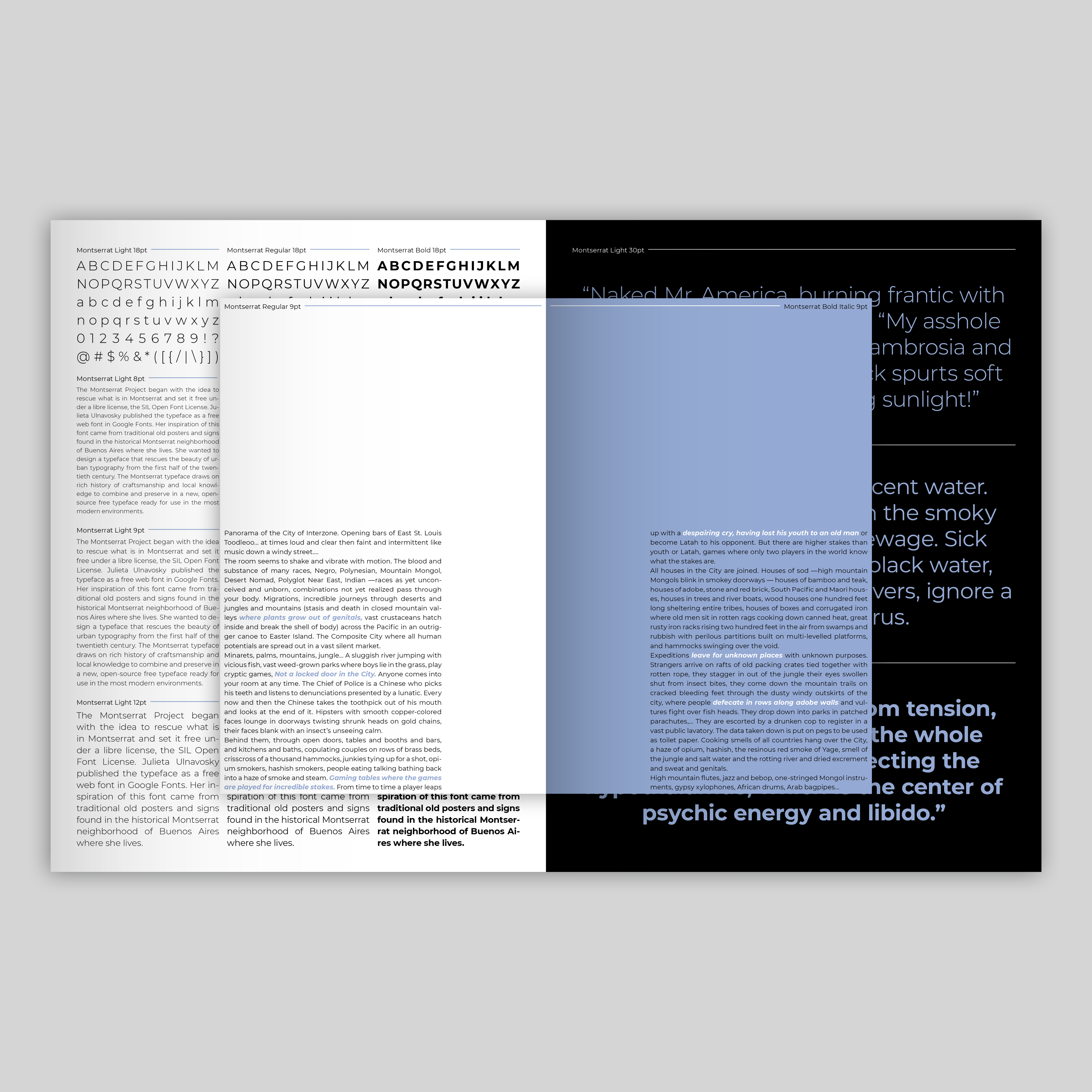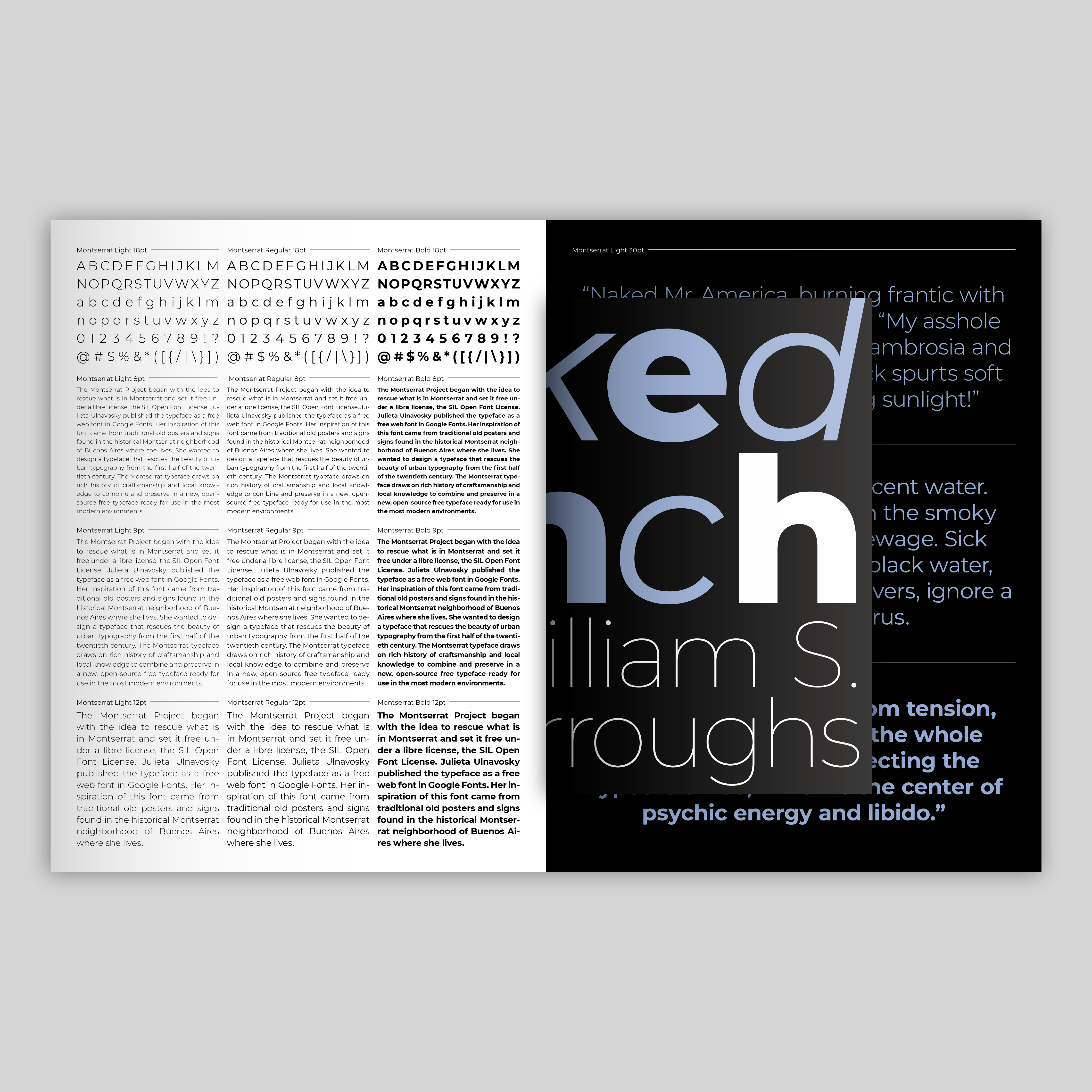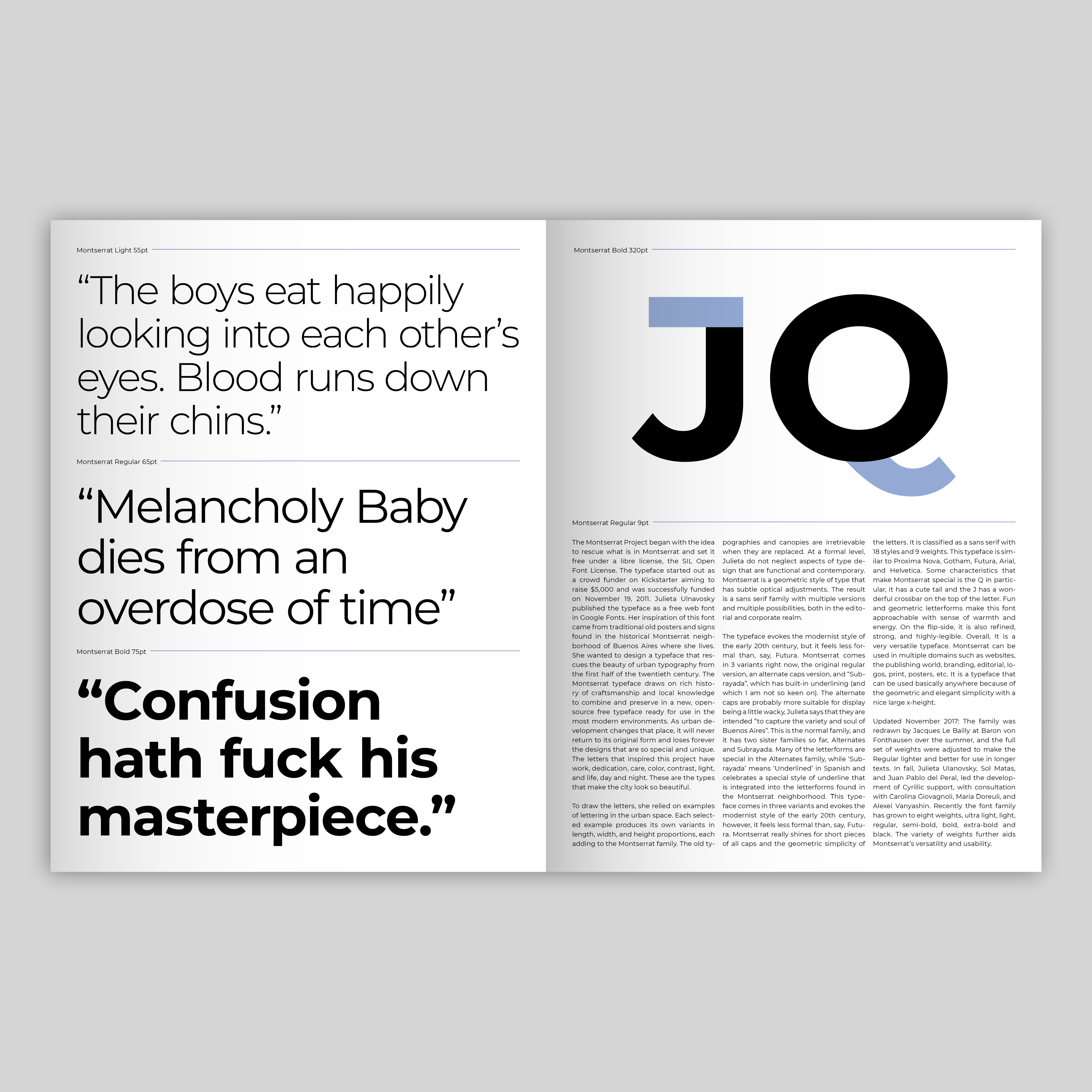 I picked a font from Google Fonts and designed a type specimen promotional booklet communicating the essential characteristics of a chosen typeface and the letterforms that reveal its unique properties. The designer, Julieta Ulanovsky made "Montserrat" inspired by the old posters and signs in the traditional Montserrat neighborhood of Buenos Aires. So For the cover of the booklet, I got inspired by how "R" is pronounced in Spanish. We can hear it sound like "Montserrrrat."