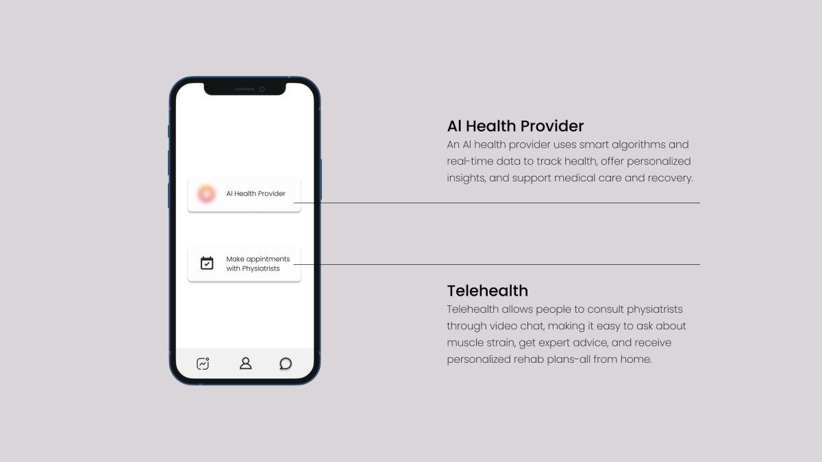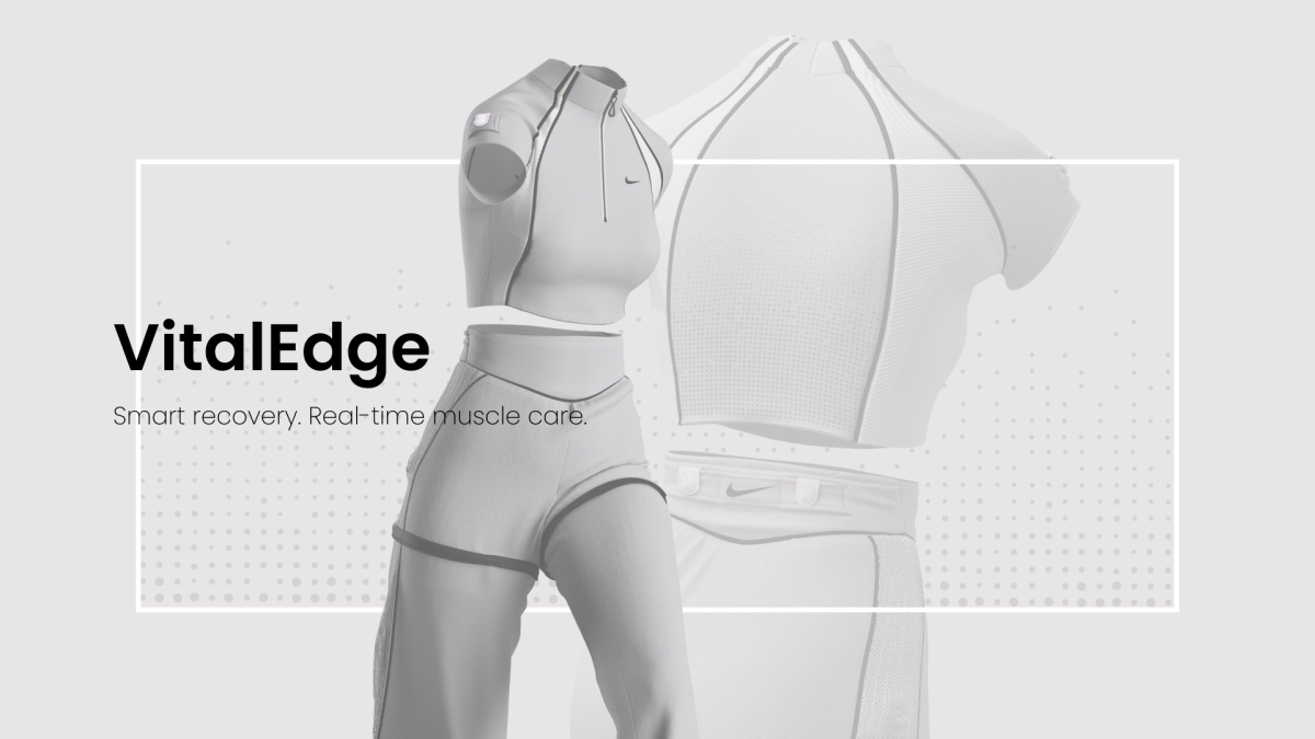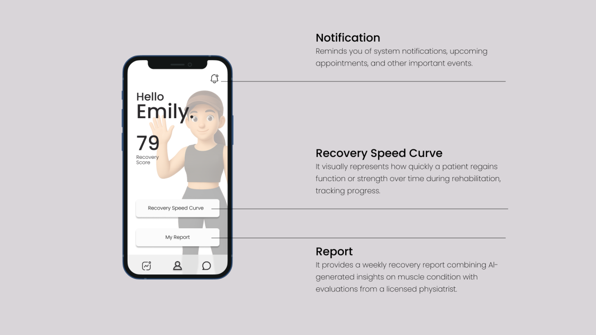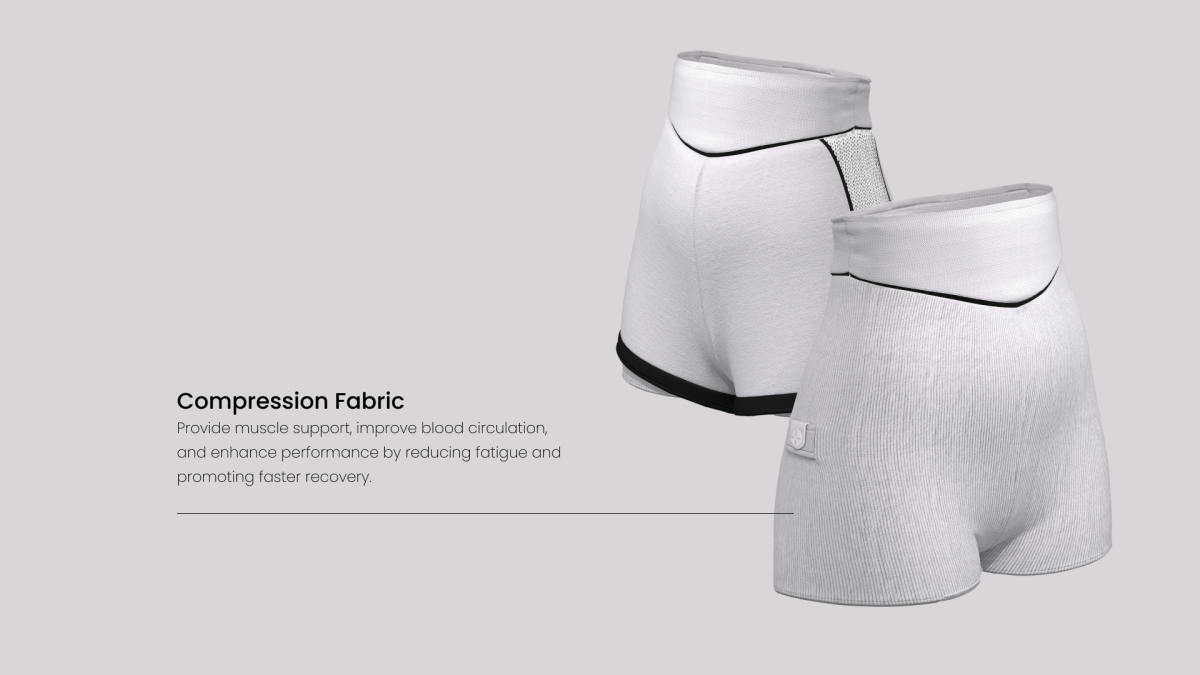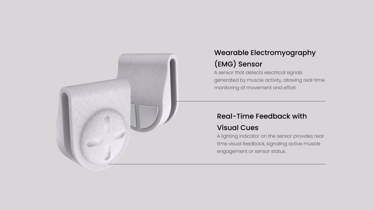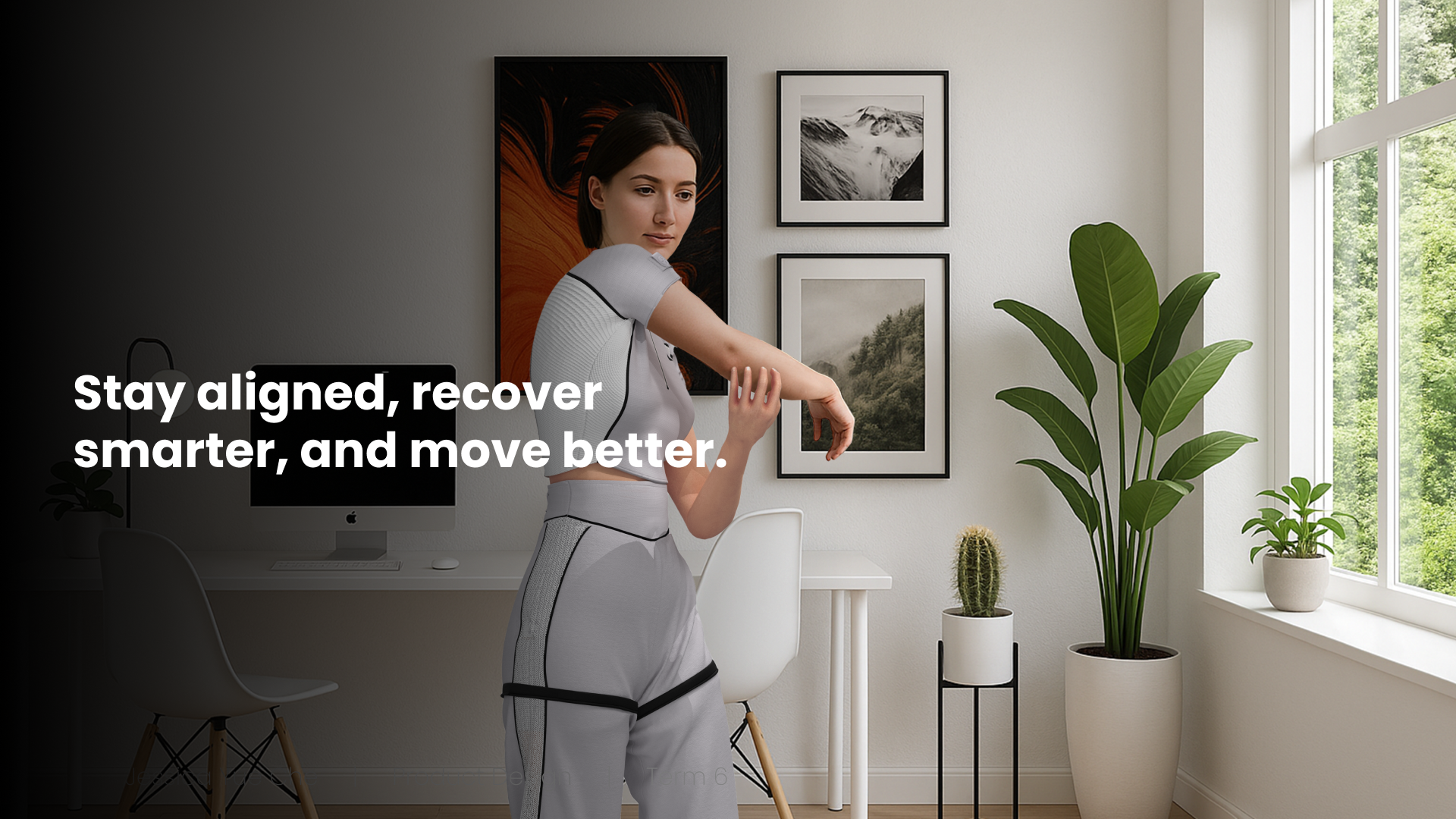 A smart recovery suit designed for professionals who deal with muscle strain from sitting too long. It’s got sensors that track things like muscle activity, heart rate, and temperature in real time. The app gives you instant feedback on your movements, and your therapist can check your progress remotely—so you’re getting personalized care without needing to go into a clinic.