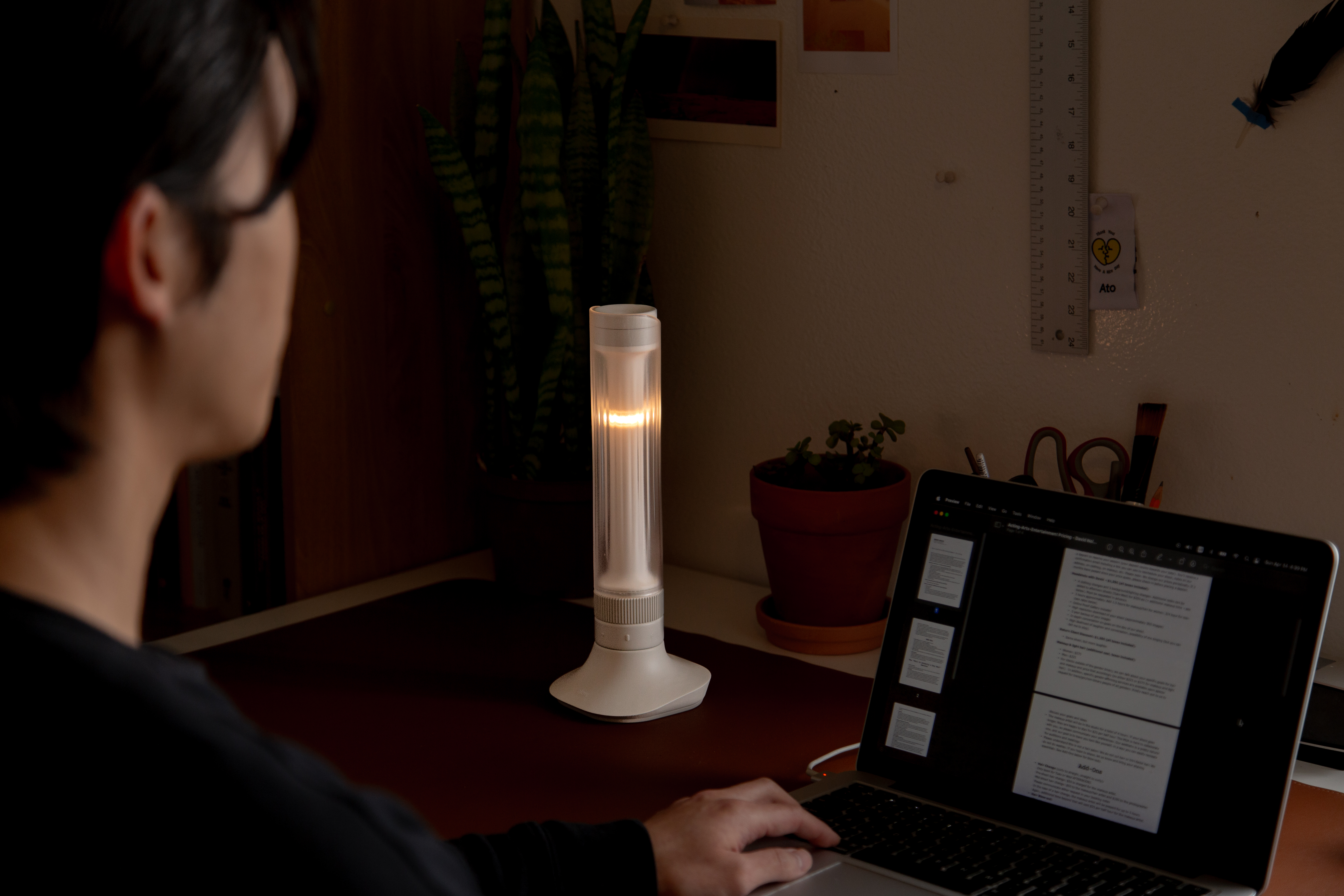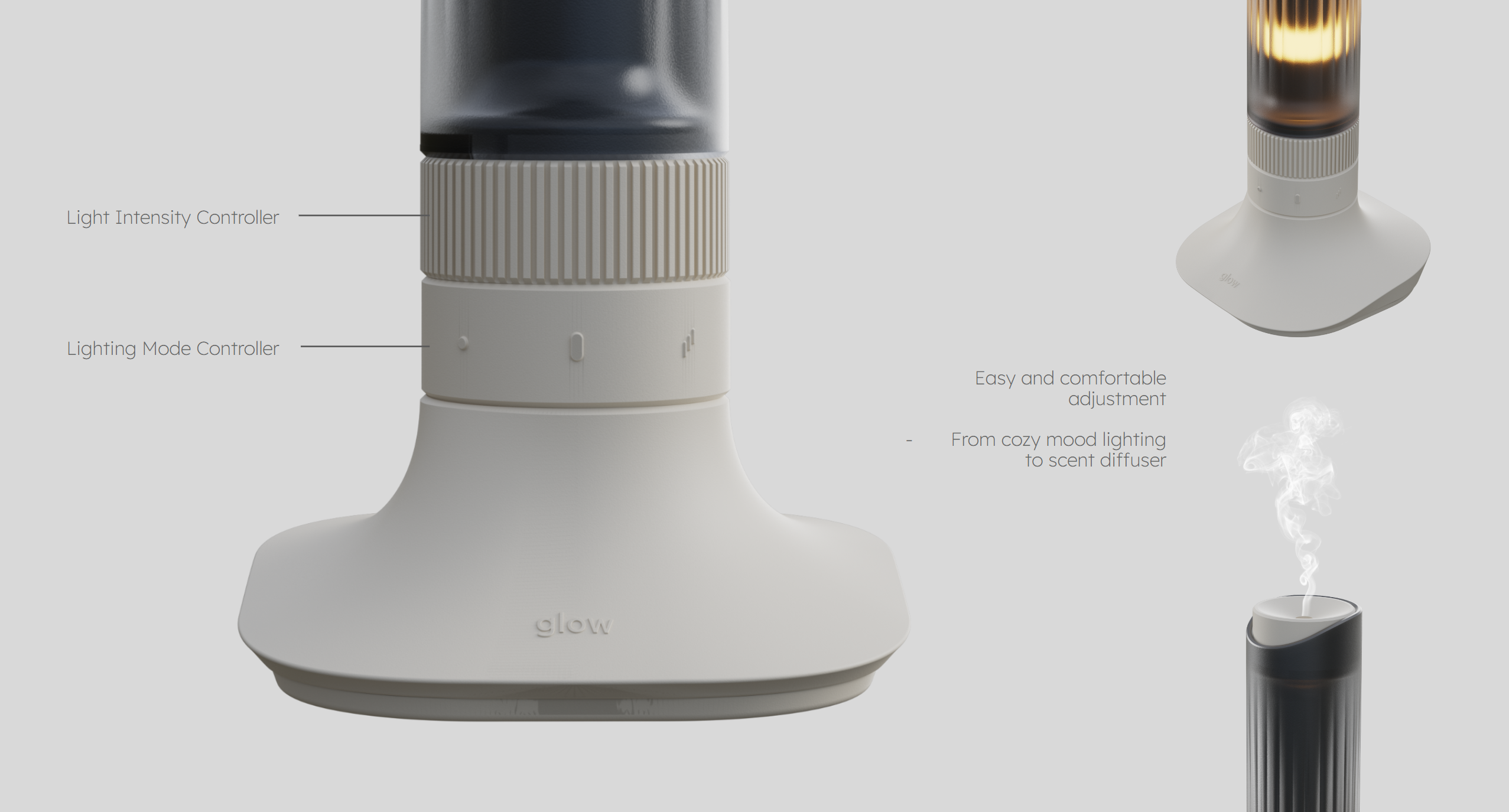 Glow is a mood light/diffuser designed to transcend the experience of a wax candle, offering a harmonized silhouette reminiscent of candles alongside comfortable user control.