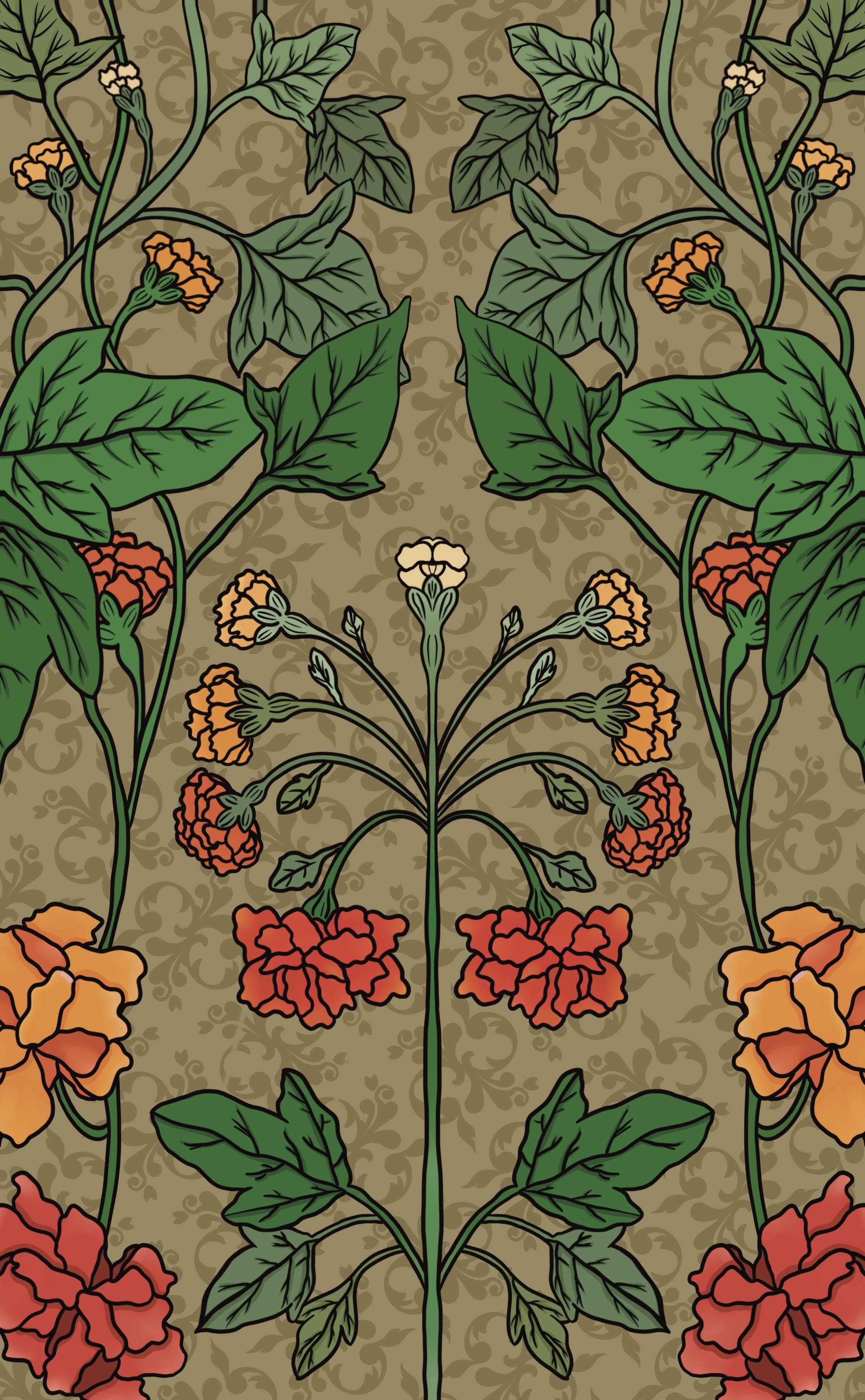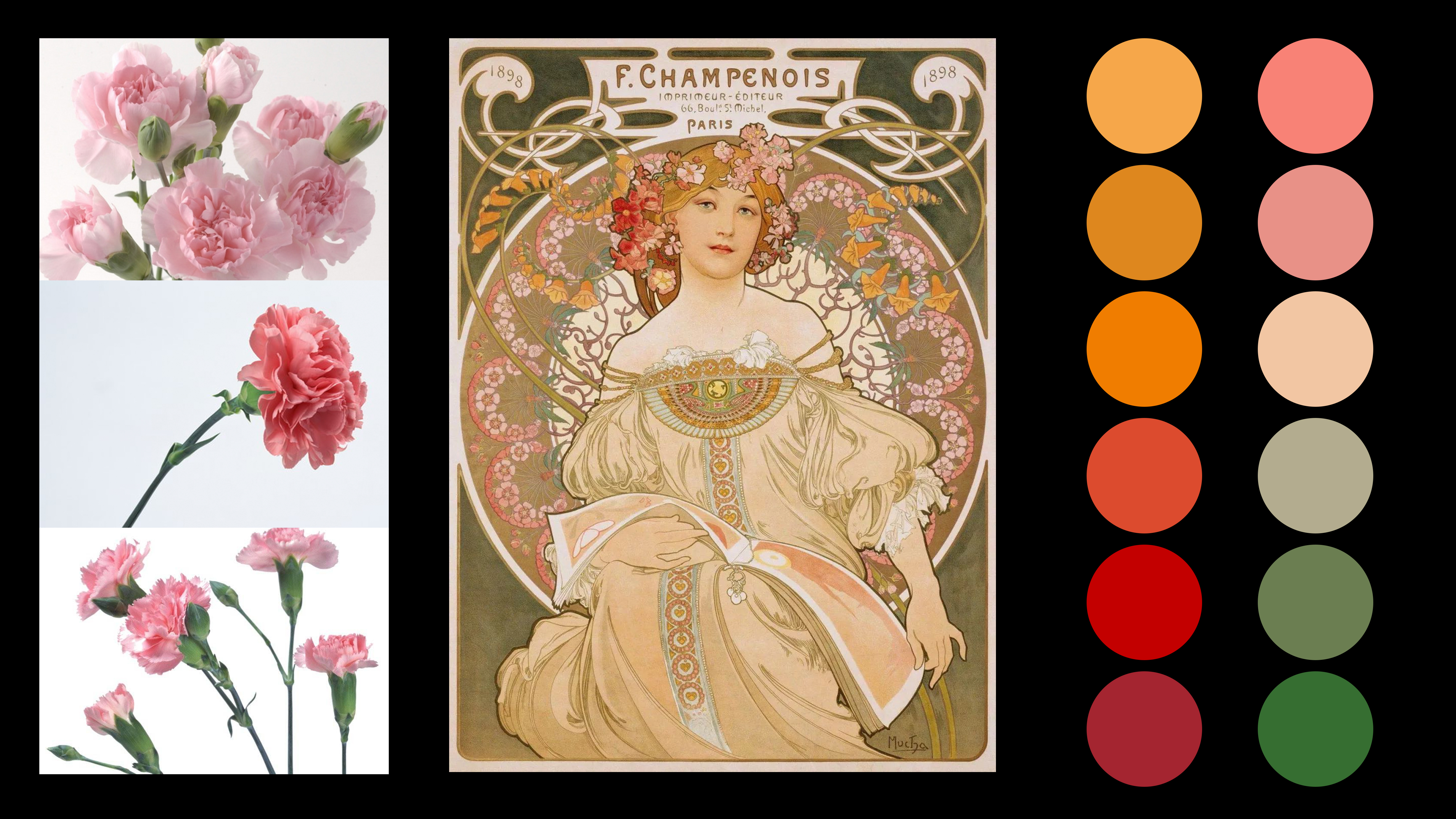 I chose carnation because its petals are complex and have very beautiful lines. I don't want to just draw the blooming shapes of the flowers, but I want to show the process of a flower from bud to bloom, including the growth process of its leaves. Regarding the choice of colors, I observed Mucha’s works, selected some colors.
