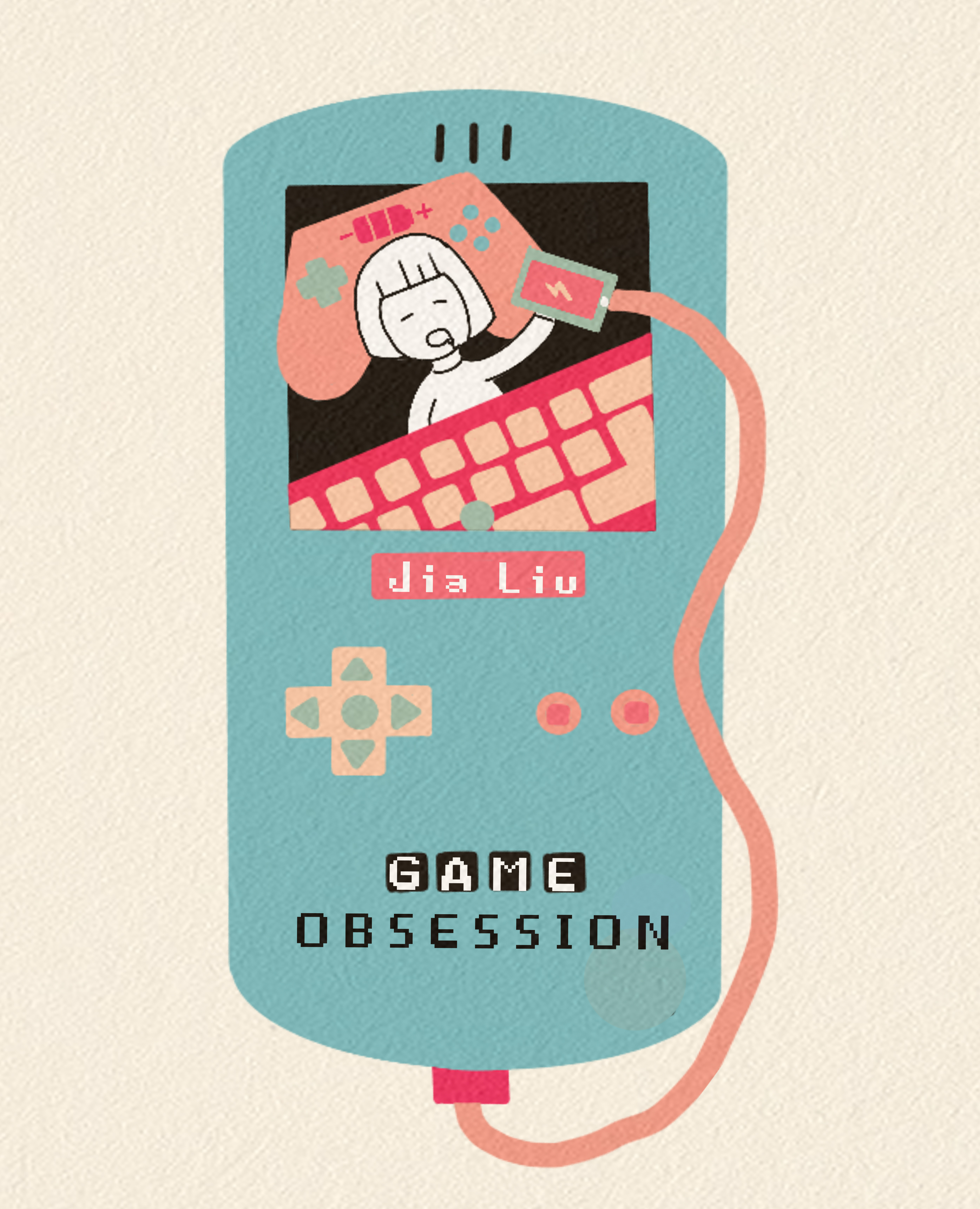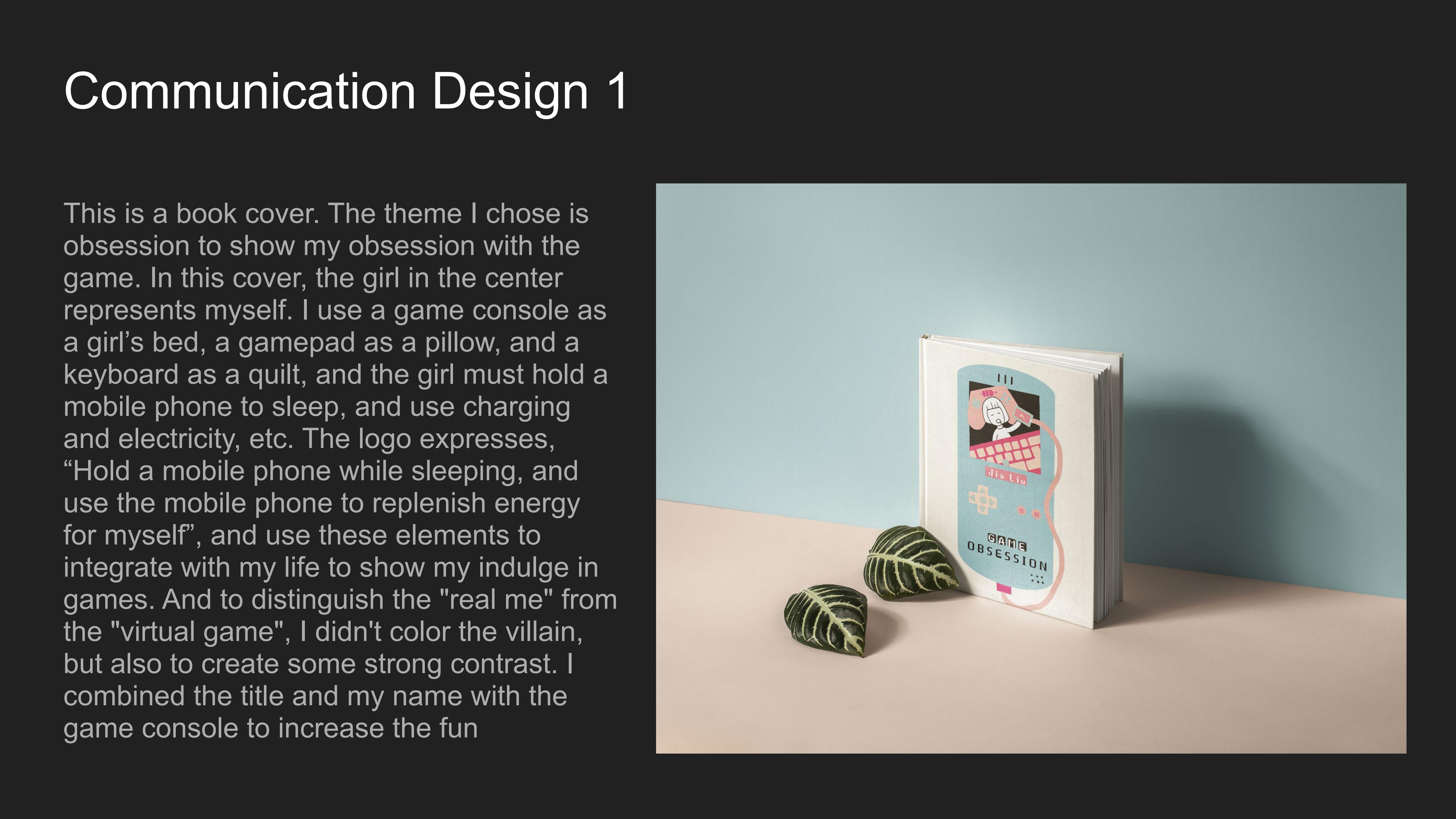 This is a book cover. The theme I chose is obsession to show my obsession with the game. In this cover, the girl in the center represents myself. I use a game console as a girl’s bed, a gamepad as a pillow, and a keyboard as a quilt, and the girl must hold a mobile phone to sleep, and use charging and electricity, etc.