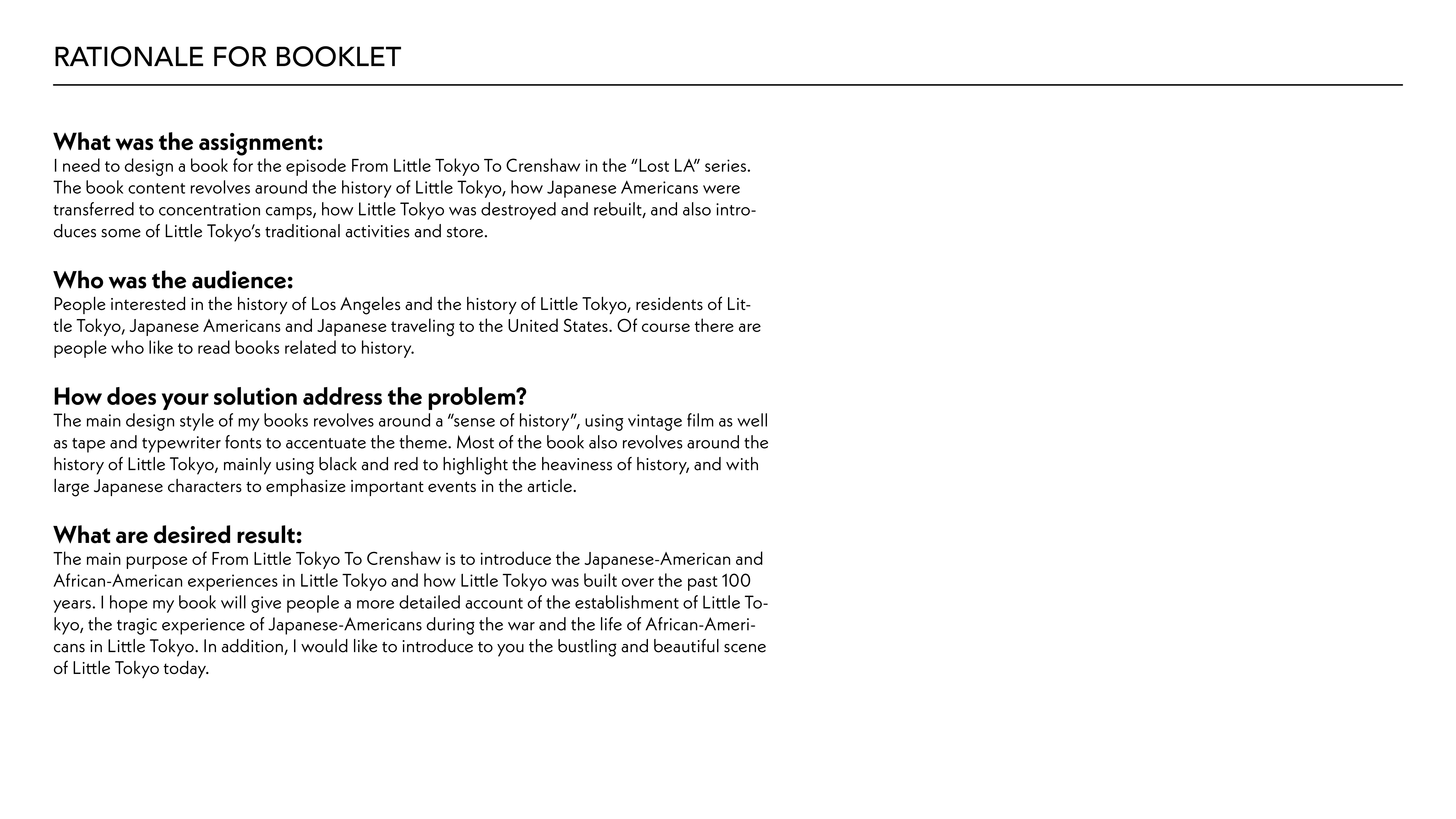 This project is a book for an episode in the "LOST LA" series, and I chose From Little Tokyo to Crenshaw. I need to refer to a book based on the content in this episode, and the book includes related articles and photos.