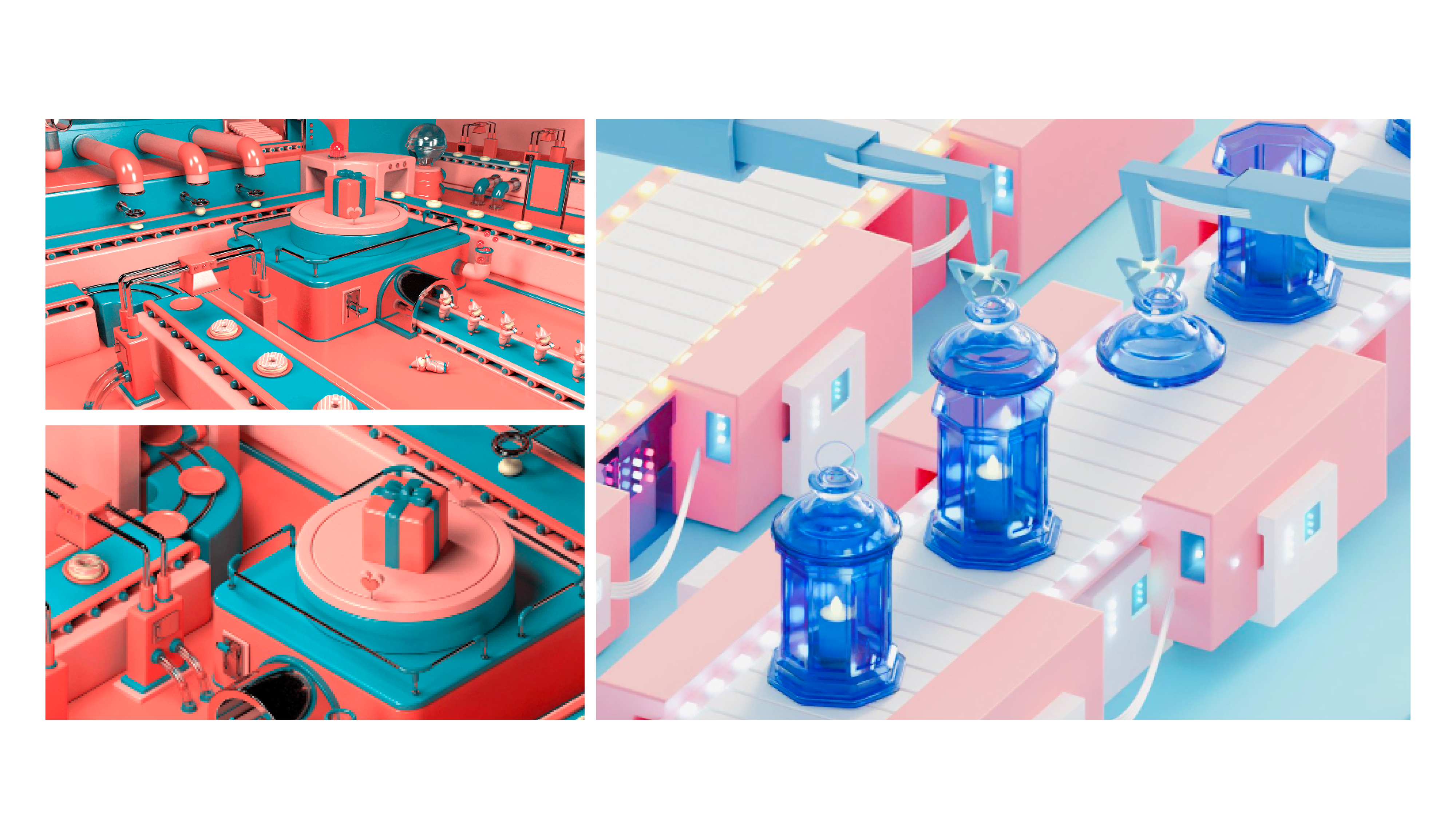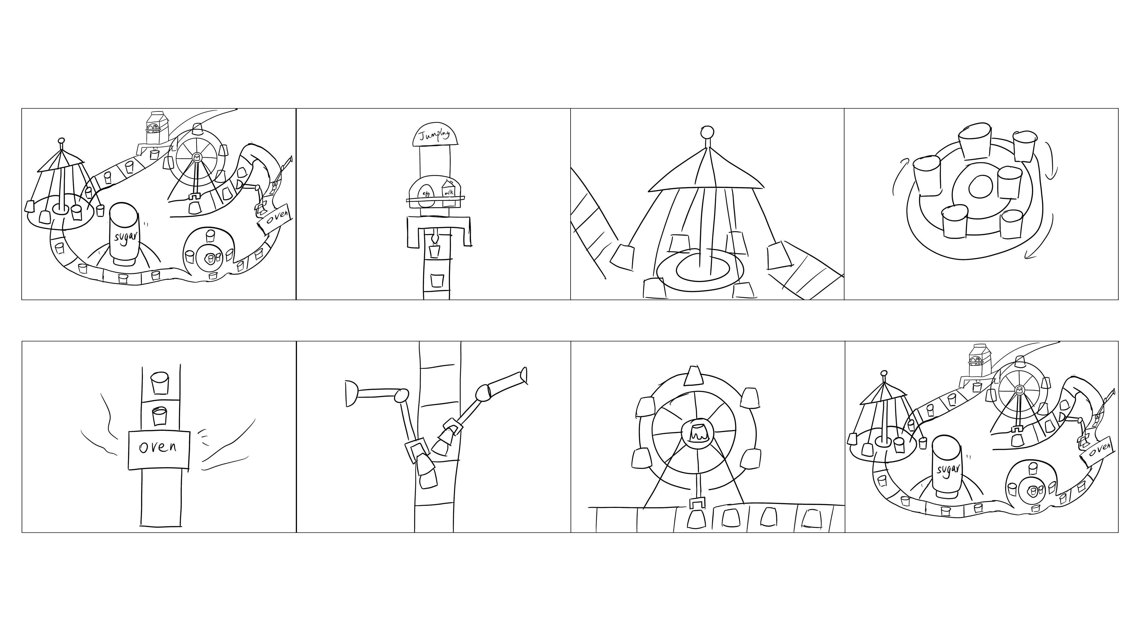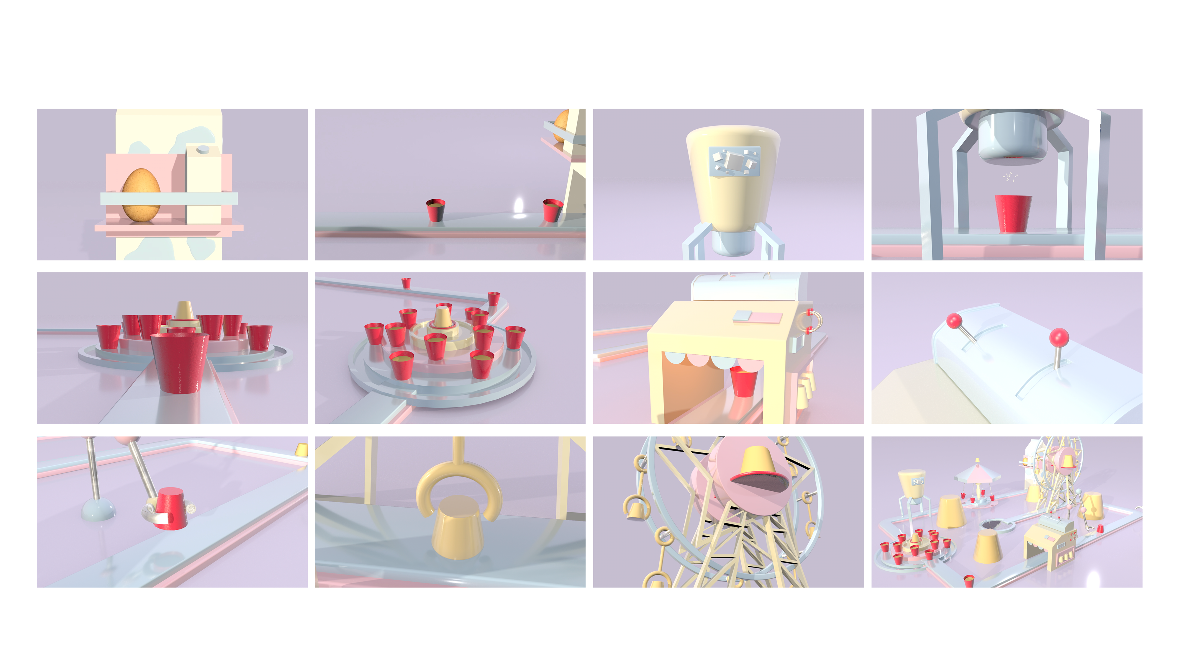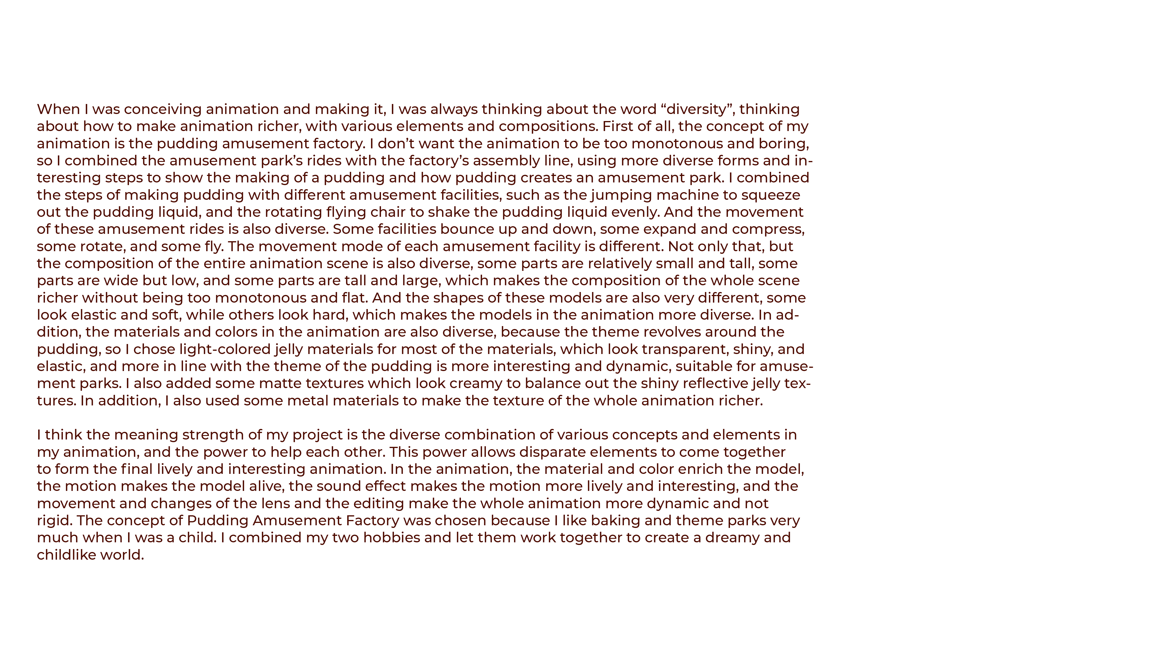 My concept is the pudding amusement factory, which combines the pudding production line with the amusement park. I turned the amusement park rides into a pudding-baking machine, showing the making process of pudding in an innovative way. And I use a variety of materials, colors, models, and motion to make animations, and cooperate with cheerful background music and different sound effects to make every shot in the animation diverse and interesting.