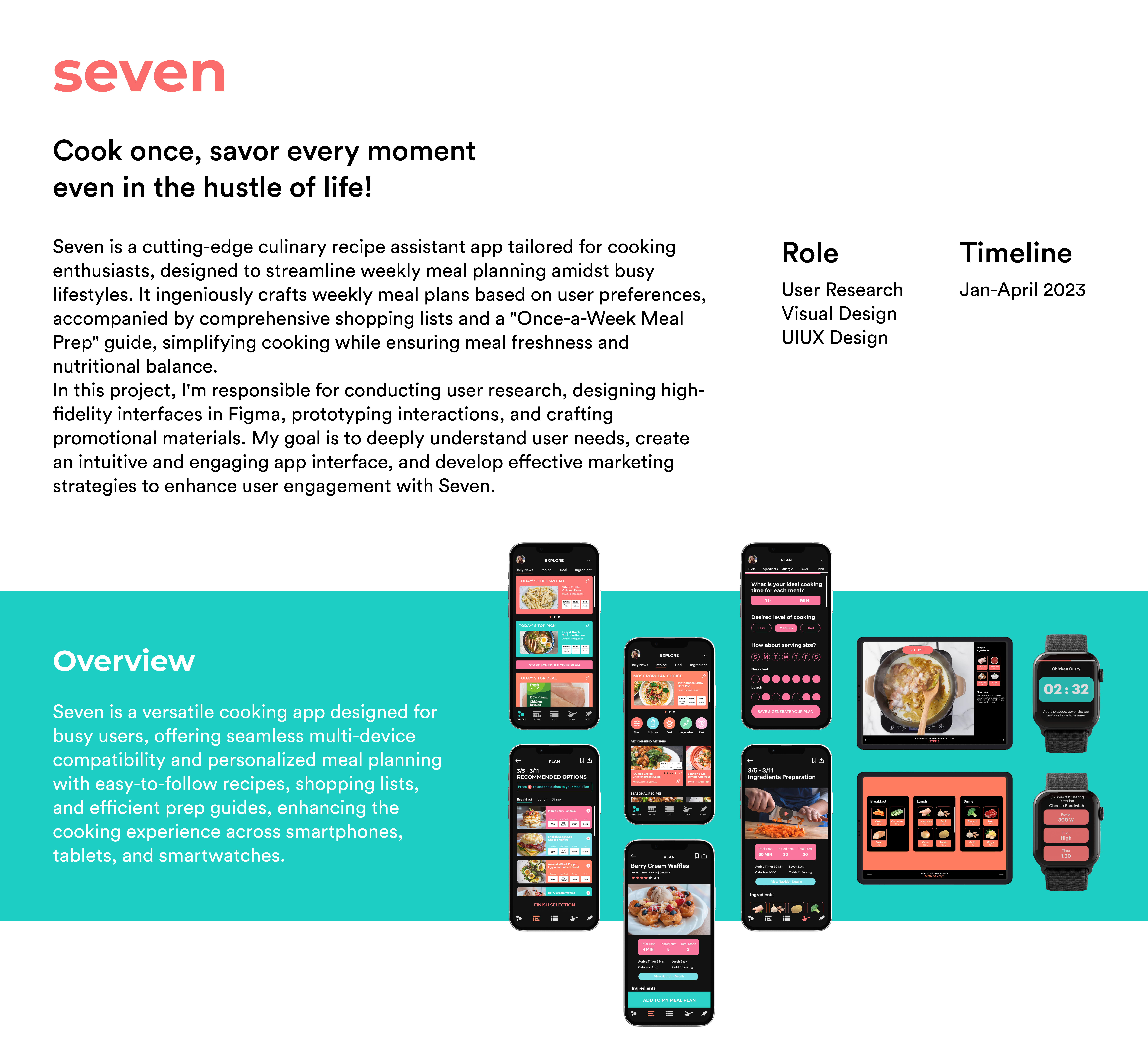 Seven is a versatile cooking app designed for busy users, offering seamless multi-device compatibility and personalized meal planning with easy-to-follow recipes, shopping lists, and efficient prep guides, enhancing the cooking experience across smartphones, tablets, and smartwatches.