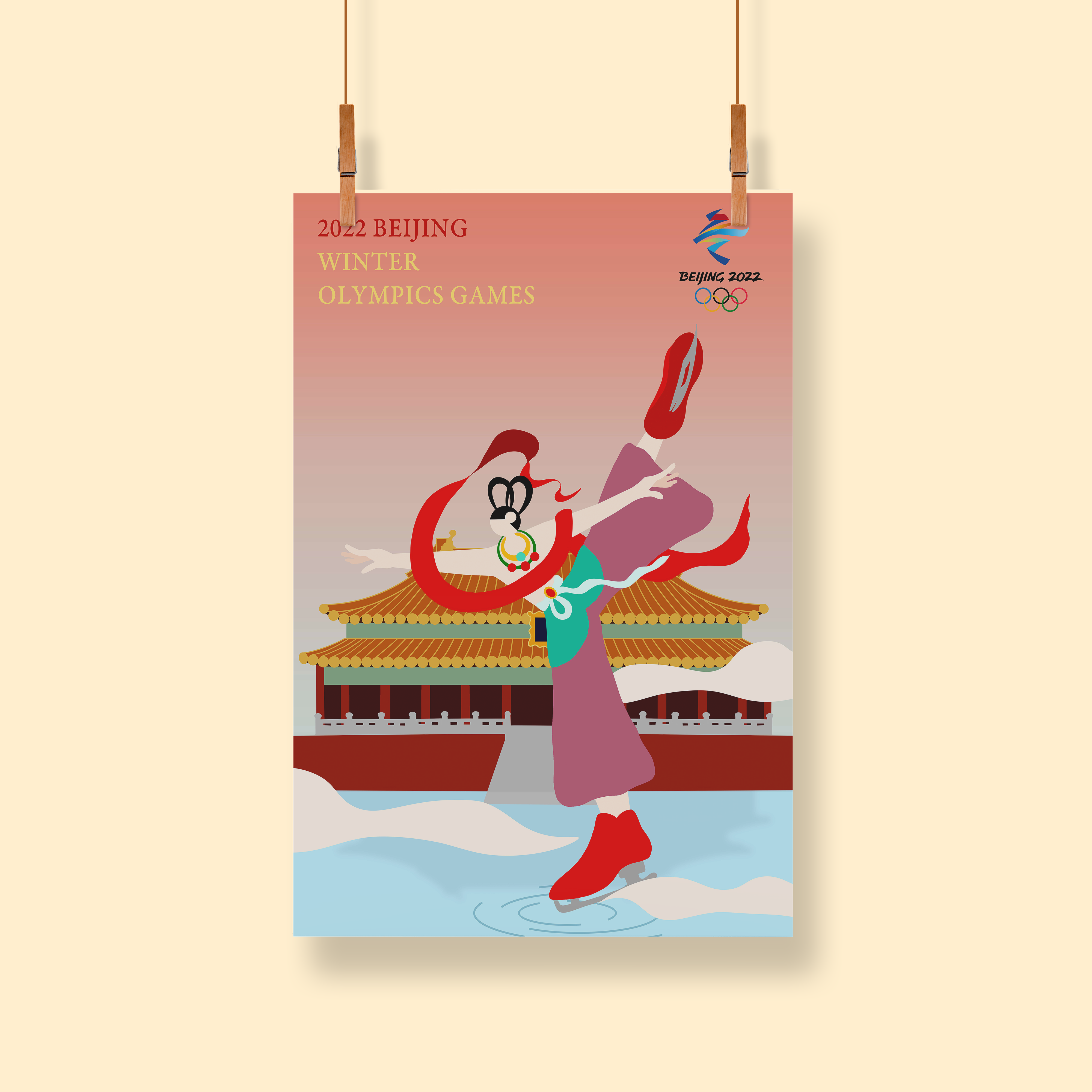 This is the Winter Olympics poster, choose the sports you are interested in and make a poster for them. This poster is about figure skating. The costumes and images of the characters are based on the fairy "Flying Sky" in the Dunhuang frescoes, and the background is the tower of the Forbidden City because the Winter Olympics will be held in Beijing, China. The lightness of the figure skaters is expressed with the streamers on the clothes.