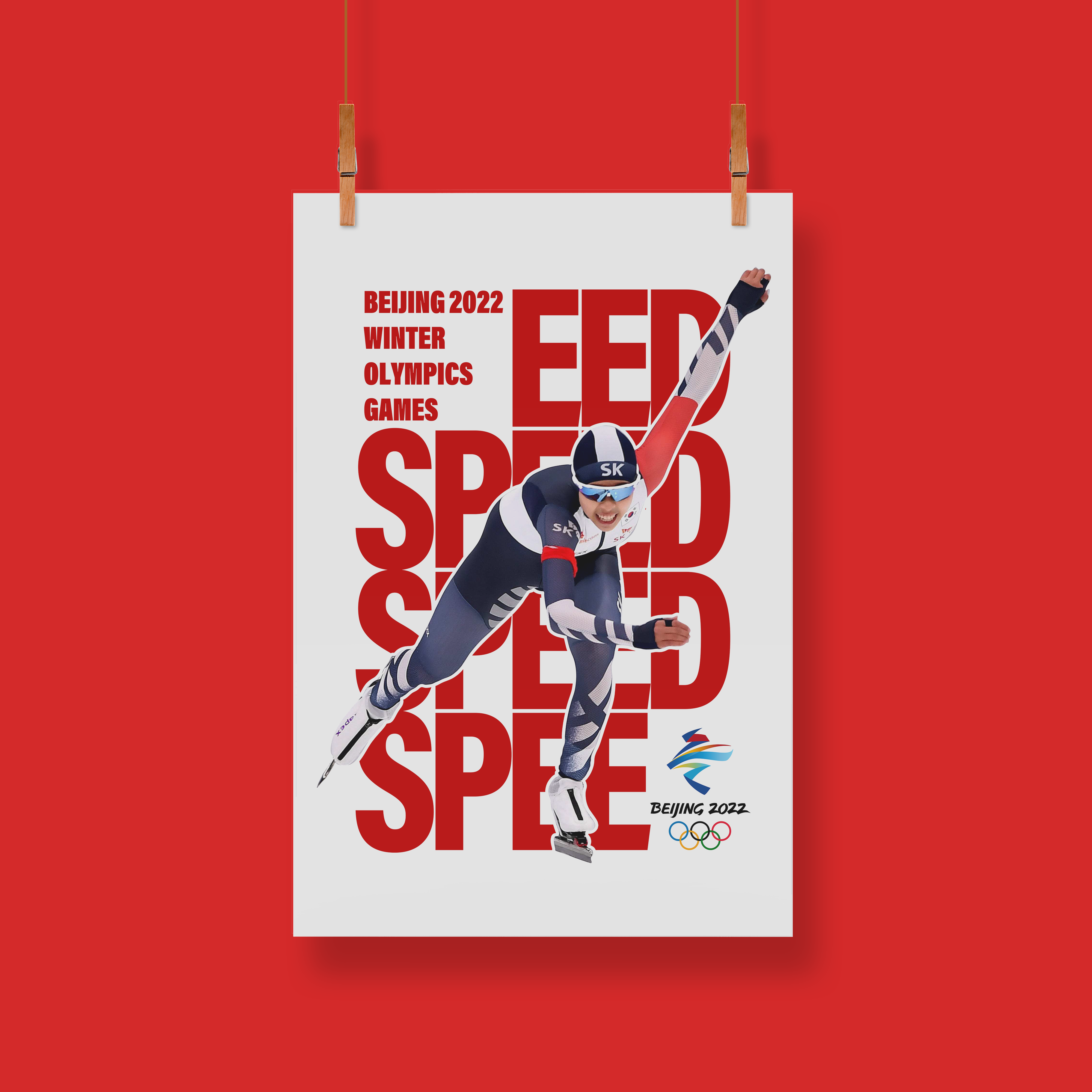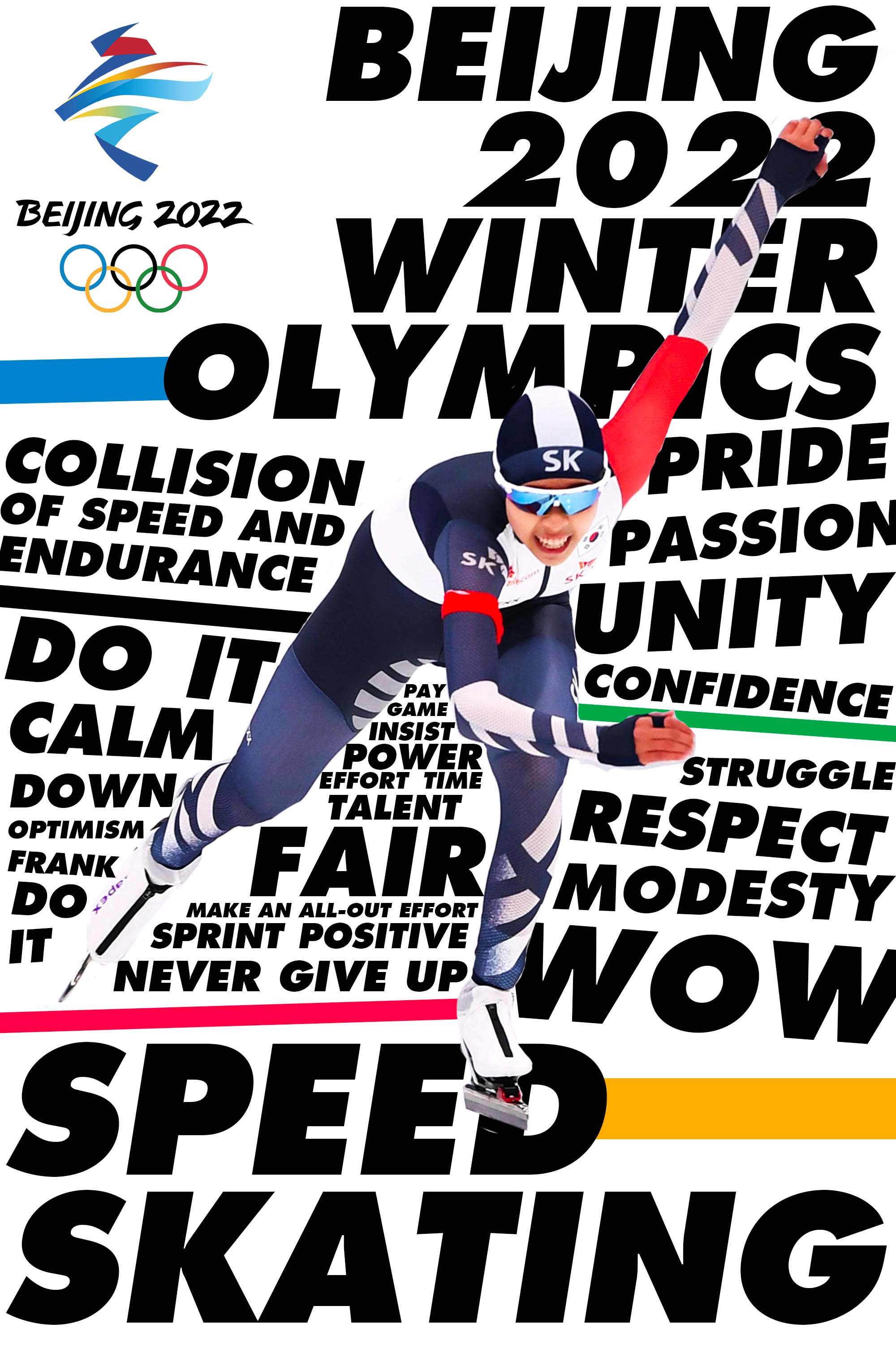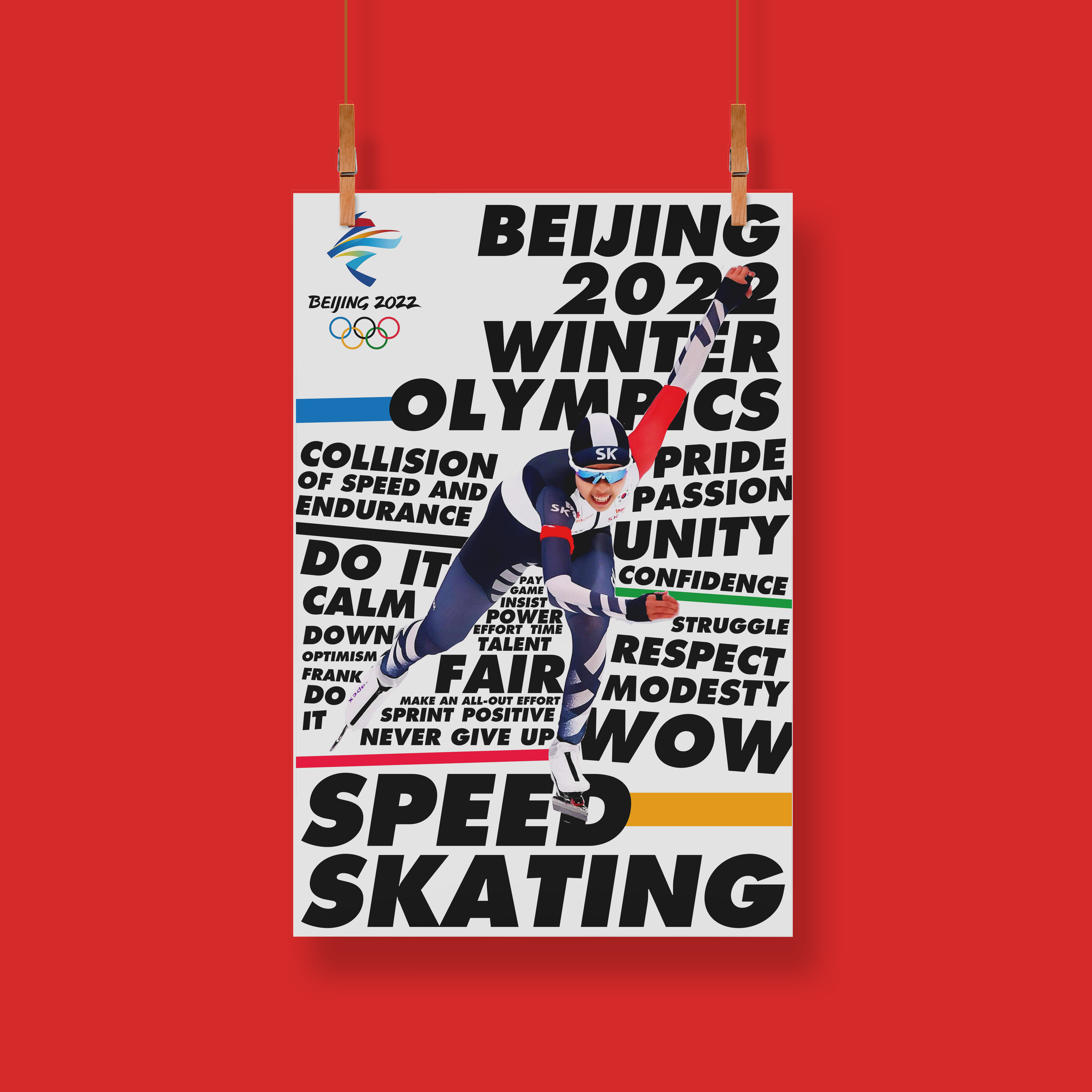 For these 2 posters, I wanted to use photos combined with text to show the movement of speed skating. For the first poster, I used various "keywords" as the background and used these words to shape the layering of the poster. You can feel the words pushing the speed skater forward.