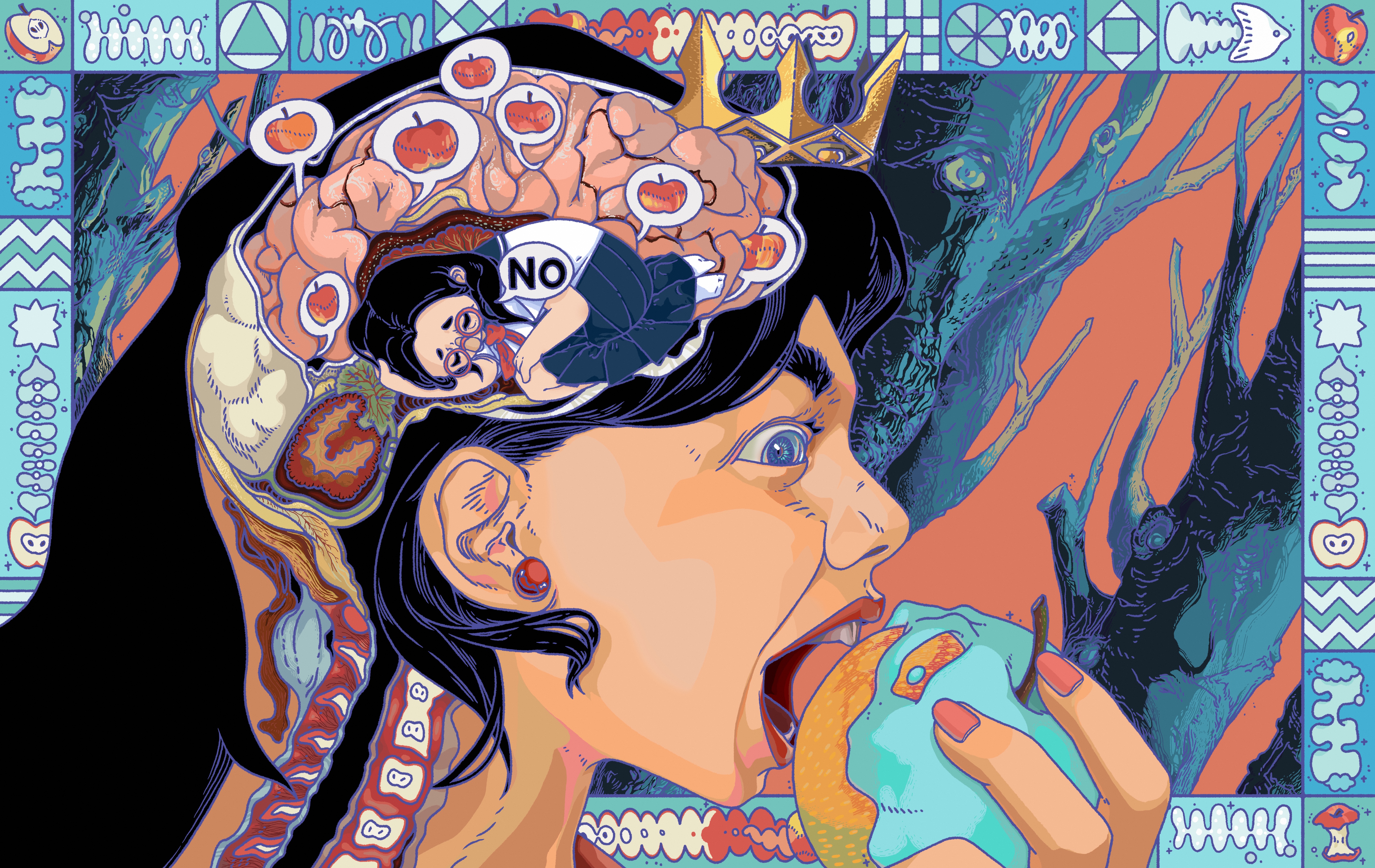 The apple gleams with treacherous beauty, its crimson skin a whisper of impending doom. Snow White's fingers tremble, hovering between salvation and destruction. In this breathless instant, hope and inevitability dance—the reader's silent scream suspended between her lips and the poisoned fruit, knowing, yet desperately wishing against knowledge.