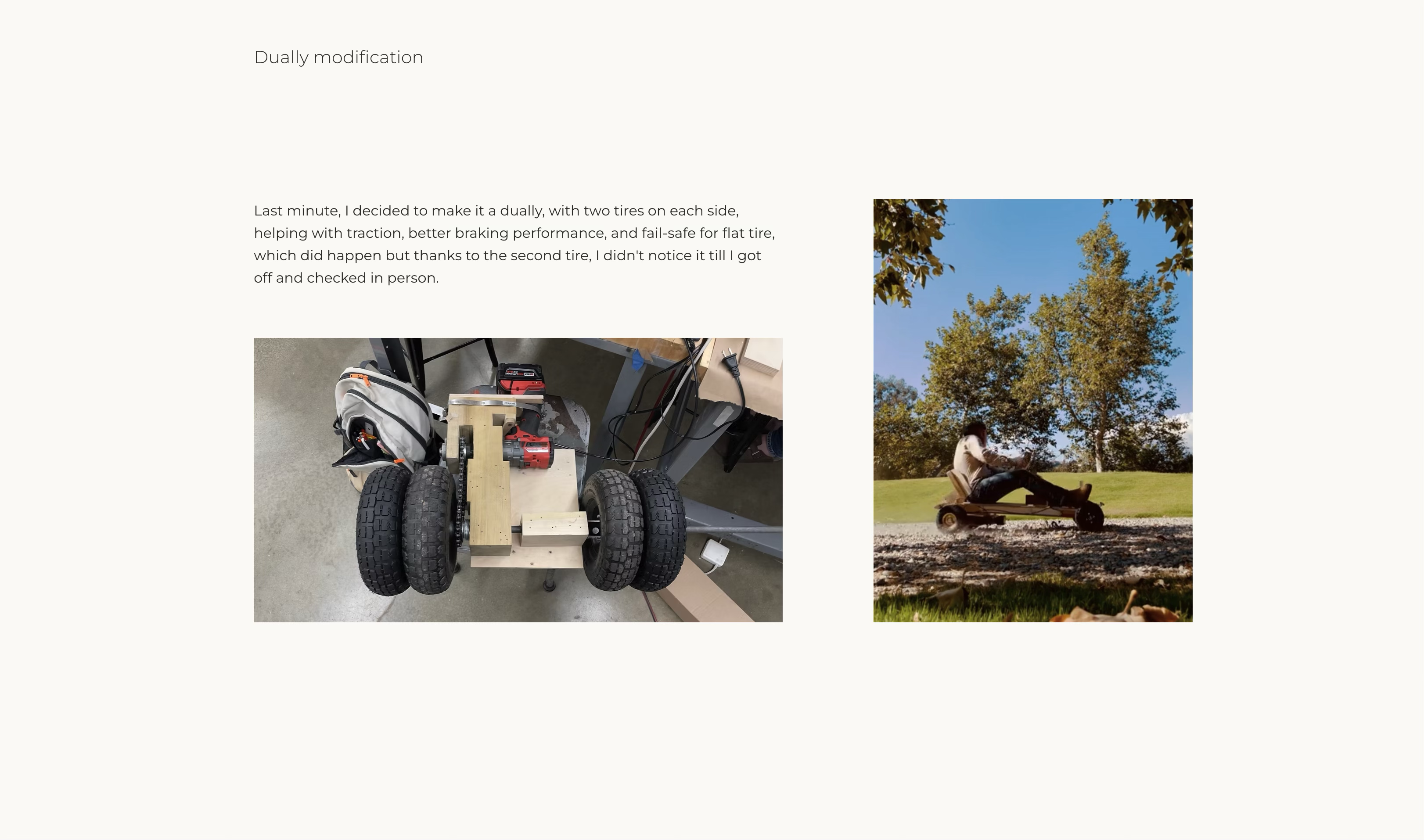Dually Go Kart reflects his enduring passion for motorized vehicles and his commitment to hands-on fabrication. The project involved designing and building a go-kart with a unique dually configuration—featuring two tires on each side—to enhance traction and braking performance and provide a fail-safe against flat tires.
