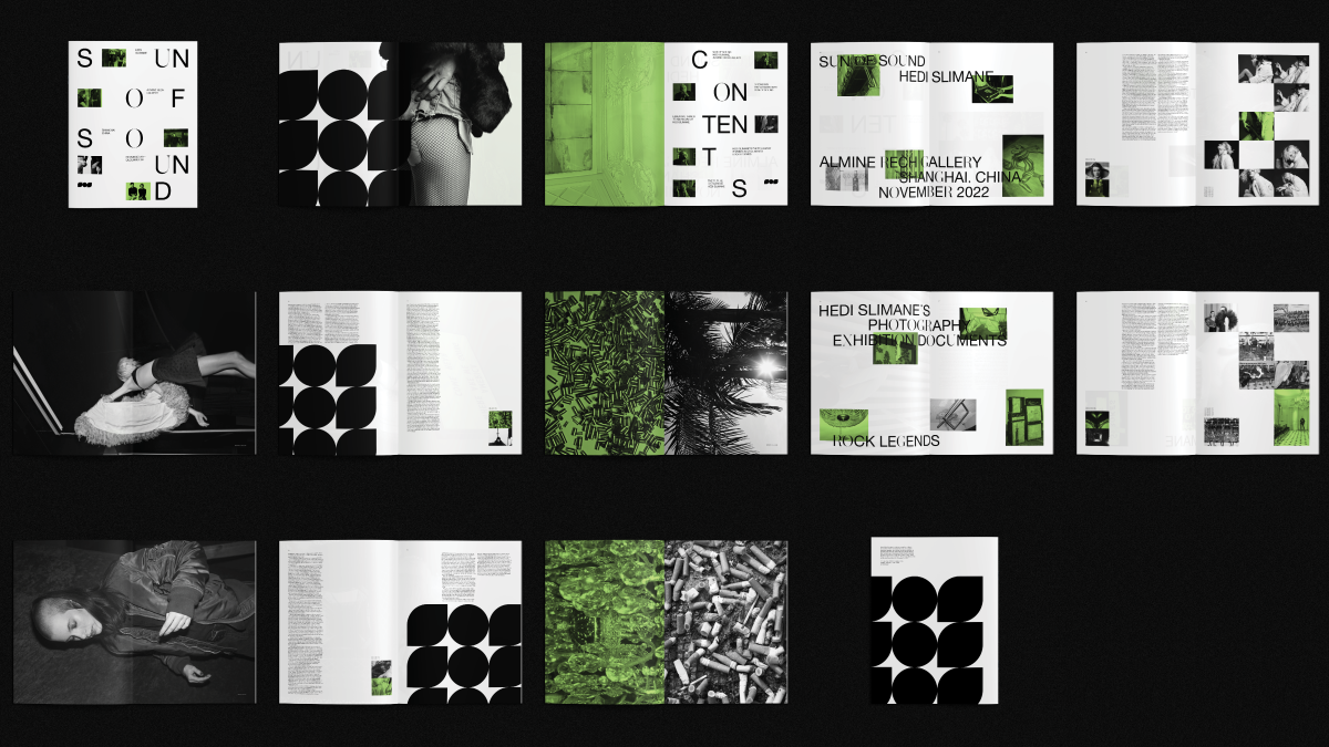 Sun of Sound is a solo exhibition by Hedi Slimane—French multi-disciplinary artist, photographer and fashion designer—featuring black and white still-life photography. I designed a new identity for the exhibition, including a typographic treatment and abstract symbol. From the raw photos, viewers are meant to experience a reduced, minimal lexicon of signs, almost liturgical in feeling. My intention was to channel Slimane’s oblique visual language into layout and type.