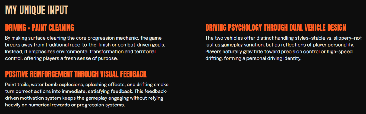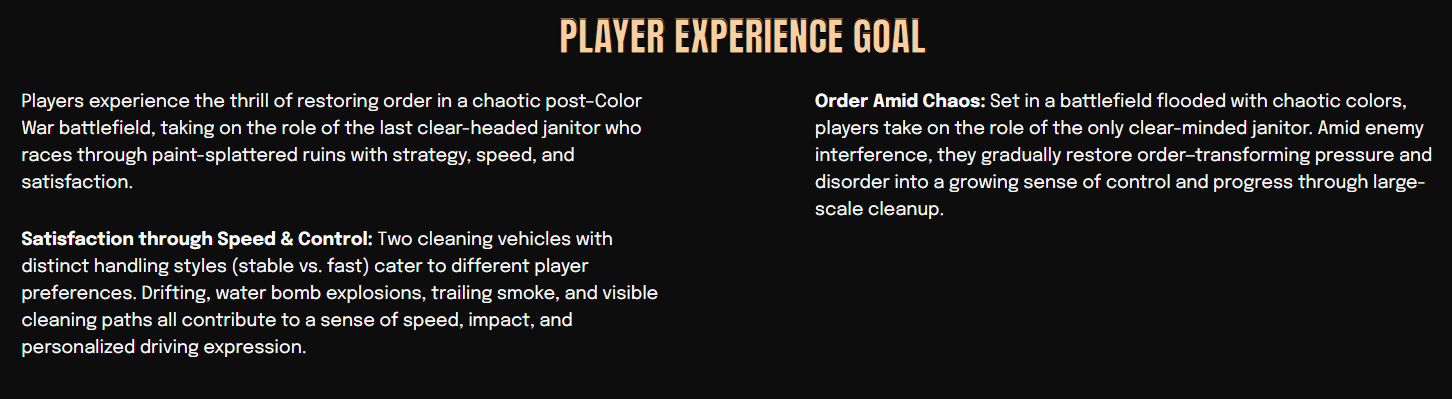 I learned how to merge two distinct systems—paint-spraying and vehicle driving—into a cohesive gameplay experience. Through iteration, I refined input rhythm, cleaning feedback, enemy behavior, and terrain interaction to ensure the game felt intuitive yet challenging.