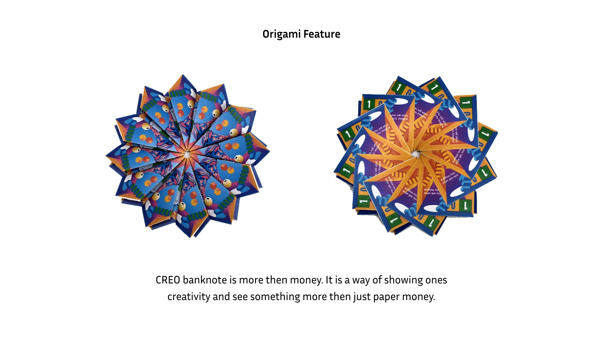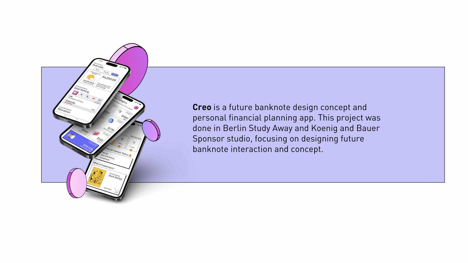 Creo is a project from sponsor studio class bt ArtCenter and Koenig and Bauer Banknote Solutions. Students were challenged to imagine future of banknote designs.