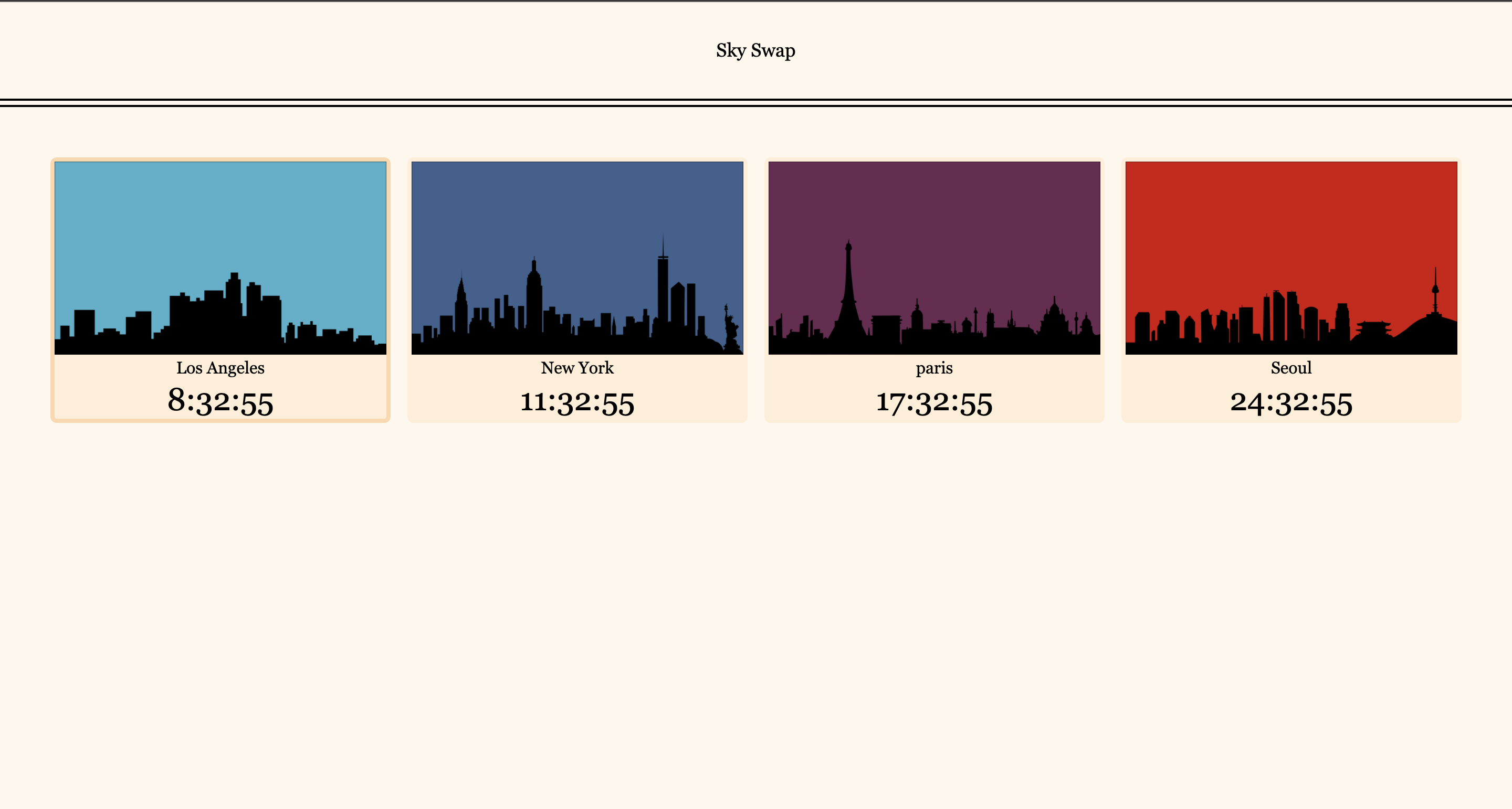 Sky Swap is a website that allows users to interact with a smart bulb. By clicking different time periods on the main page, users can change their room lighting based on the color of sky in a different time zone. The color of sky in cities change based on hourly change of time as well.