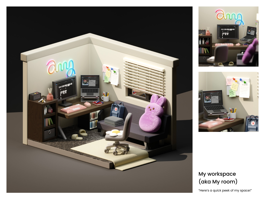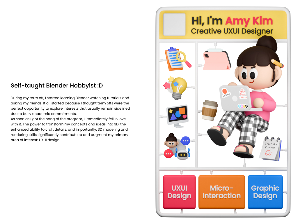 During my term off, I started learning Blender watching tutorials and asking my friends. As soon as I got the hang of the program, I immediately fell in love with it. The power to transform my concepts and ideas into 3D, the enhanced ability to craft details, and importantly, 3D modeling and rendering skills significantly contribute to and augment my primary area of interest: UXUI design.