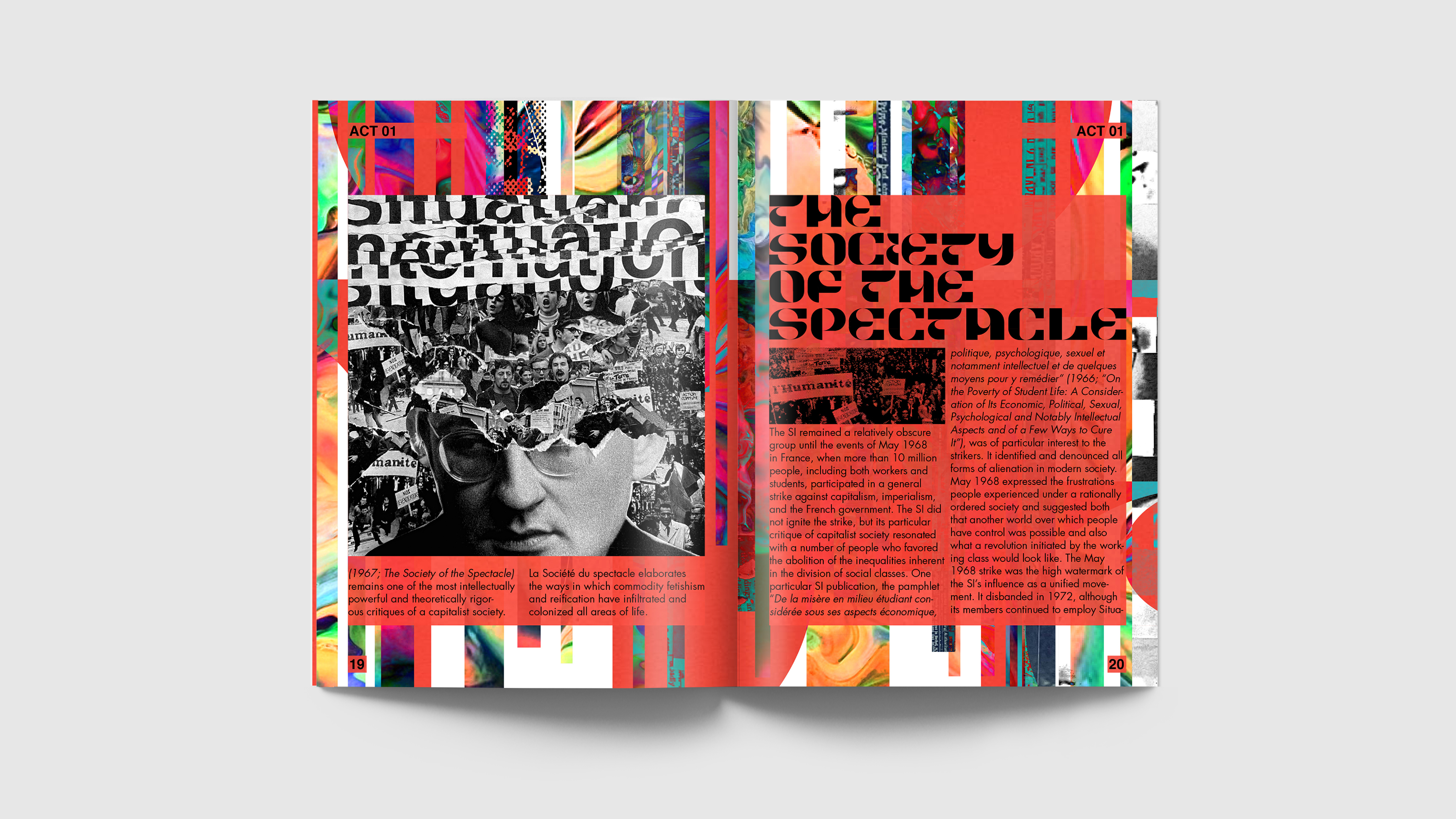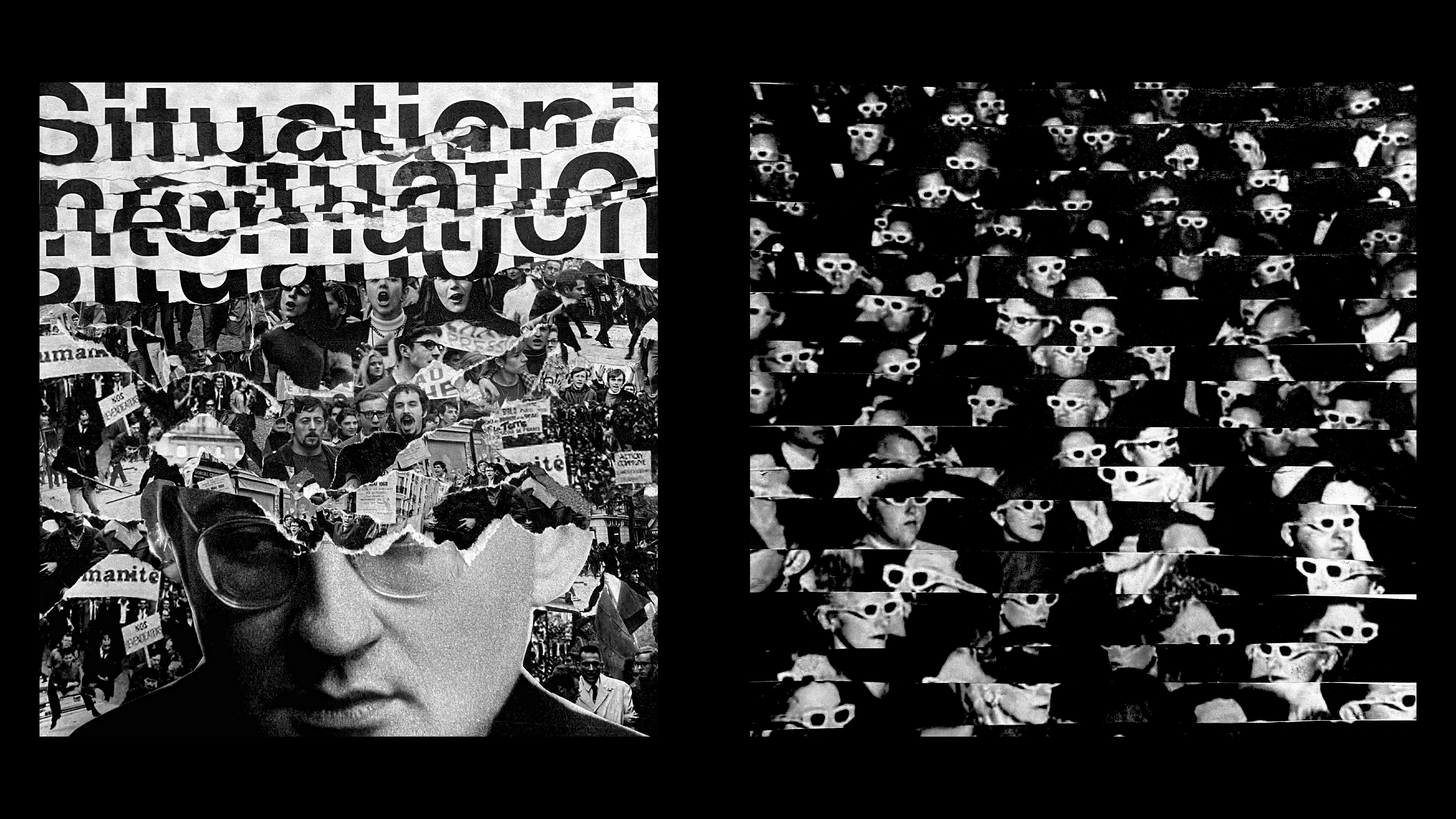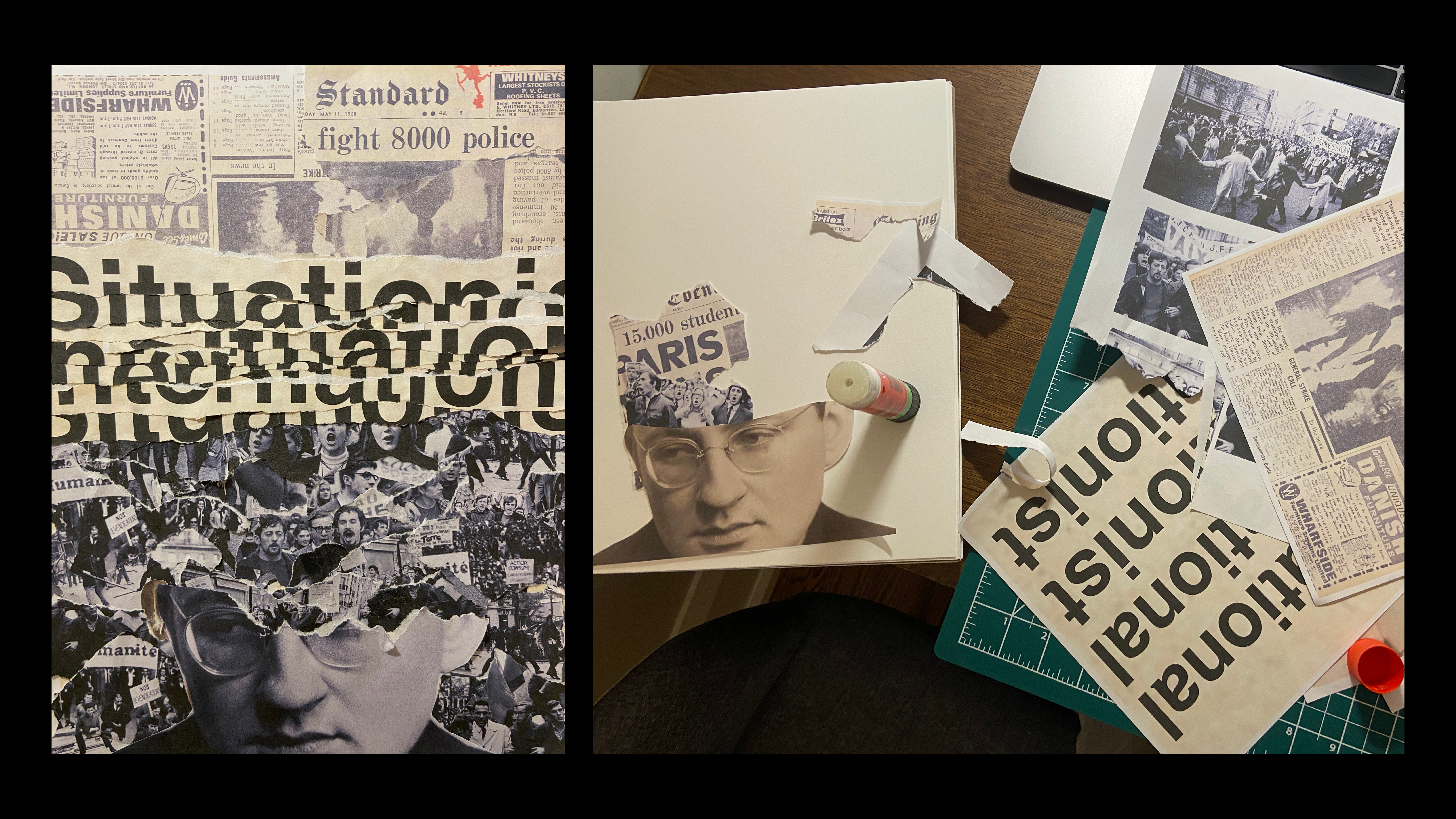 Collage Process 1 Since my topic is Situationist International, I first decided to make a collage using the pictures of newspapers and photos that are used around 1968. I used the picture of newspapers of 1960-70 because the Situationist International repeatedly emphasized that media such as TV, radio, or newspapers are shaping how we think in a certain way. In other words, brainwashing. I used the monochrome images of Guy Debord and French citizens demonstrating in May 1968 to express the stress and struggle that people were handling back then.