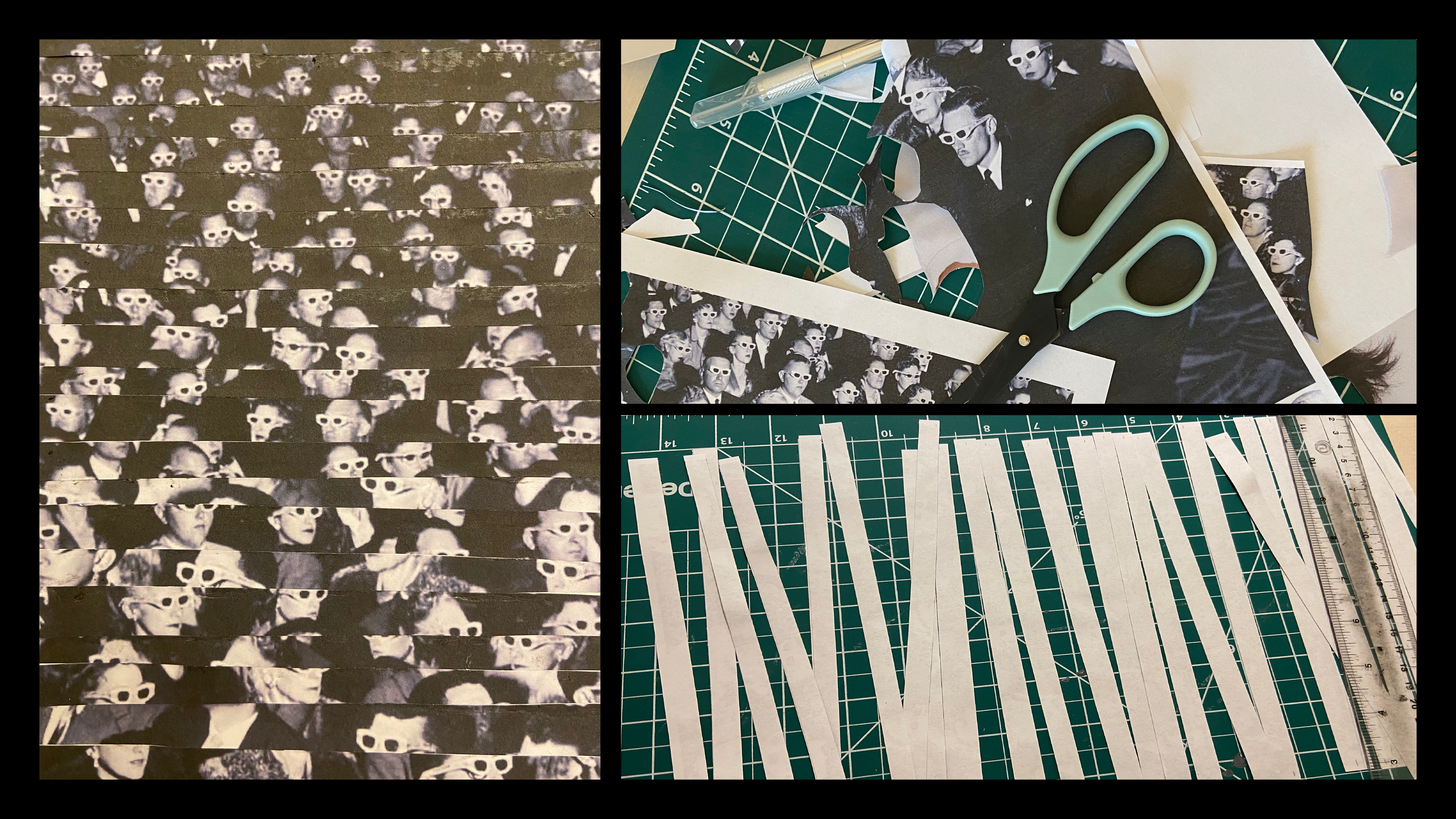 Collage Process 2 I printed out two same pictures of the Society of The Spectacle. I first cut two pictures into small slices. One of the pictures is a mirrored image so when I combine slices of two images, the direction of the spectacles goes left to right which shifts the viewer's eyes in zigzag. (finished images are shown on the next page).