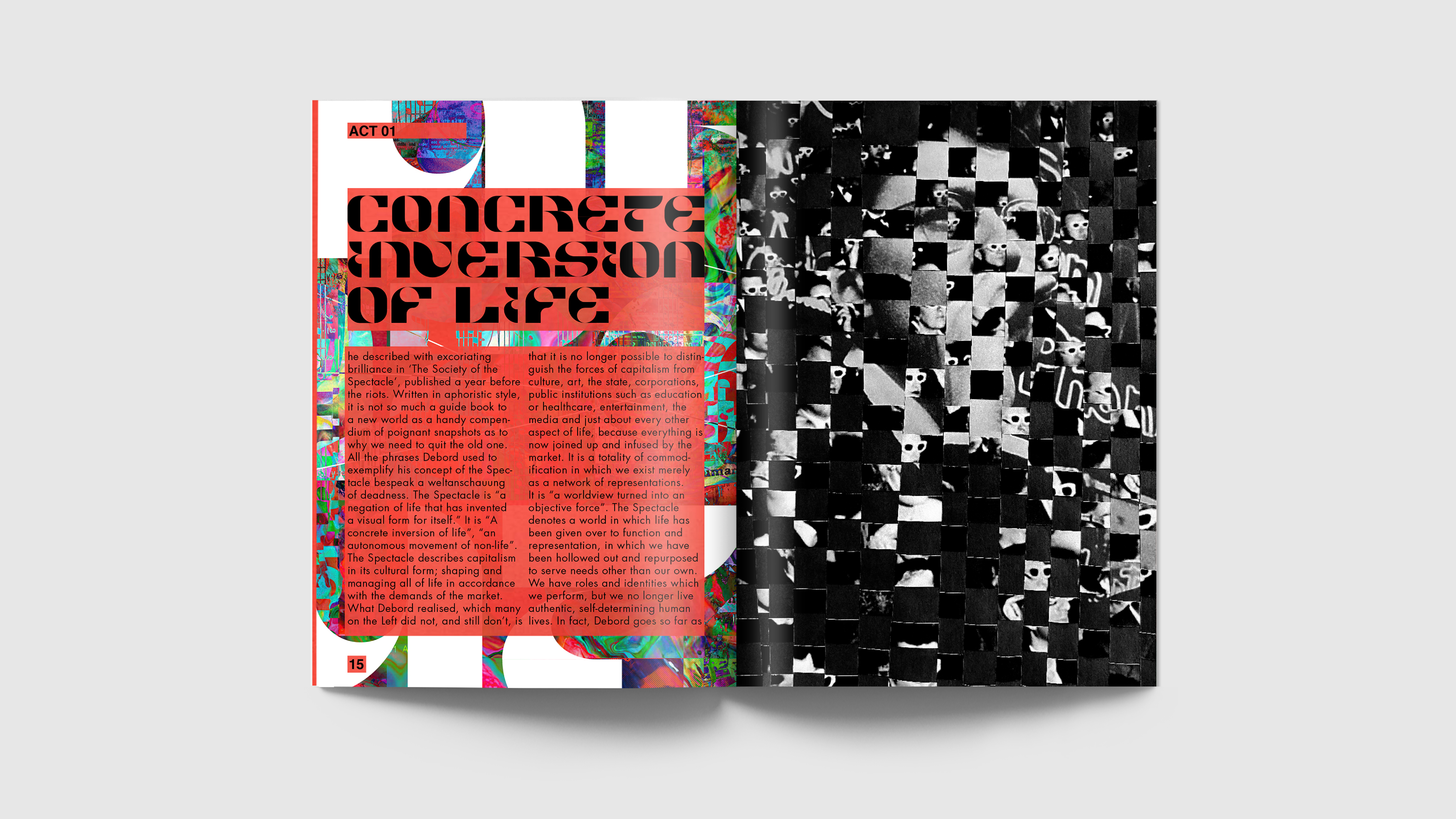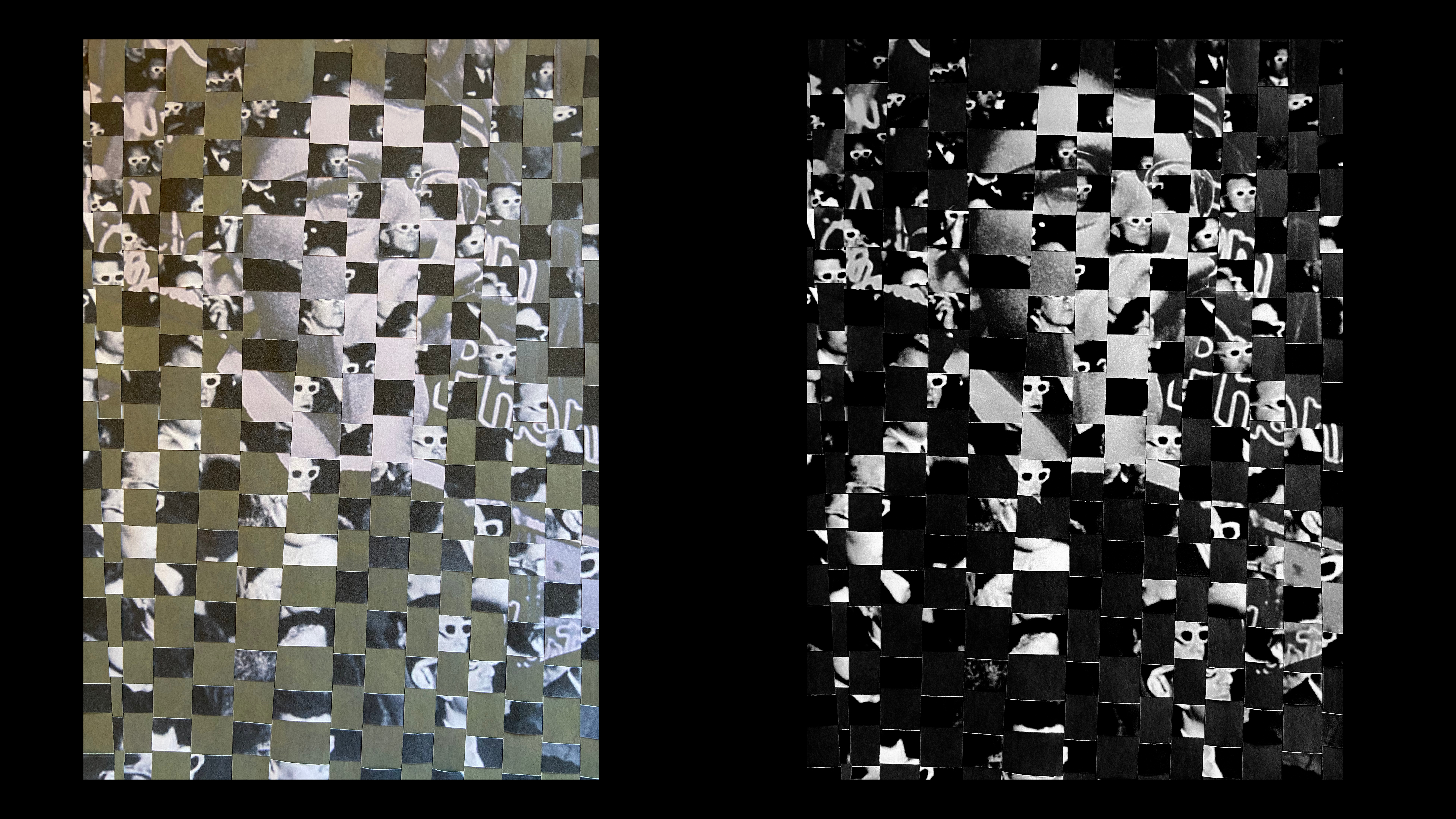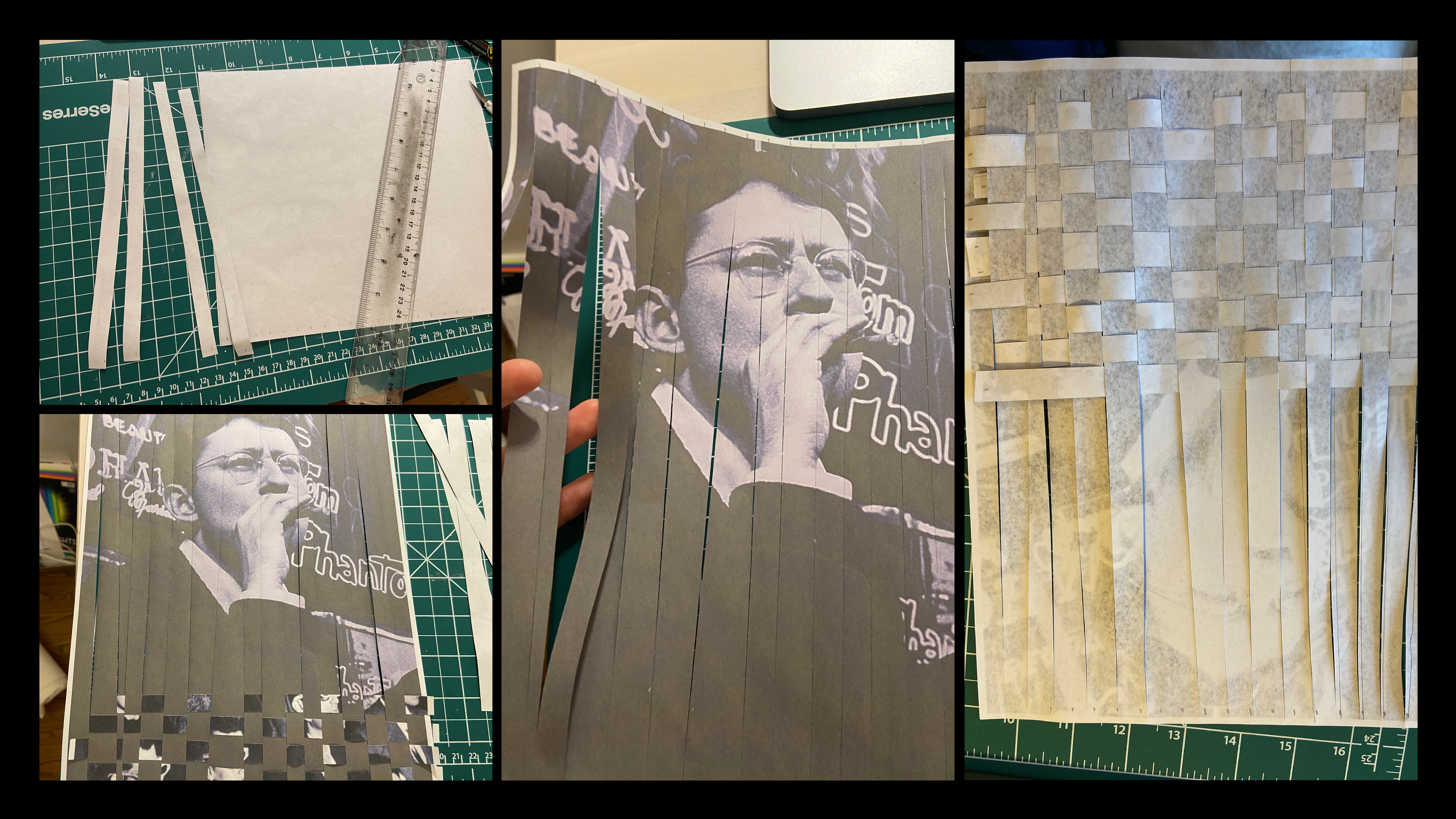 Collage 2 Process 1 For this time, I decided to experiment with the weaving techniques on this collage. I first printed out the pictures of the Society of the Spectacle and Guy Debord. I cut the first picture piece by piece using the cutter knife. I made different lines of cuts on Guy Debord's picture. After this process, I combined two images by weaving two images together which made a very interesting pattern.