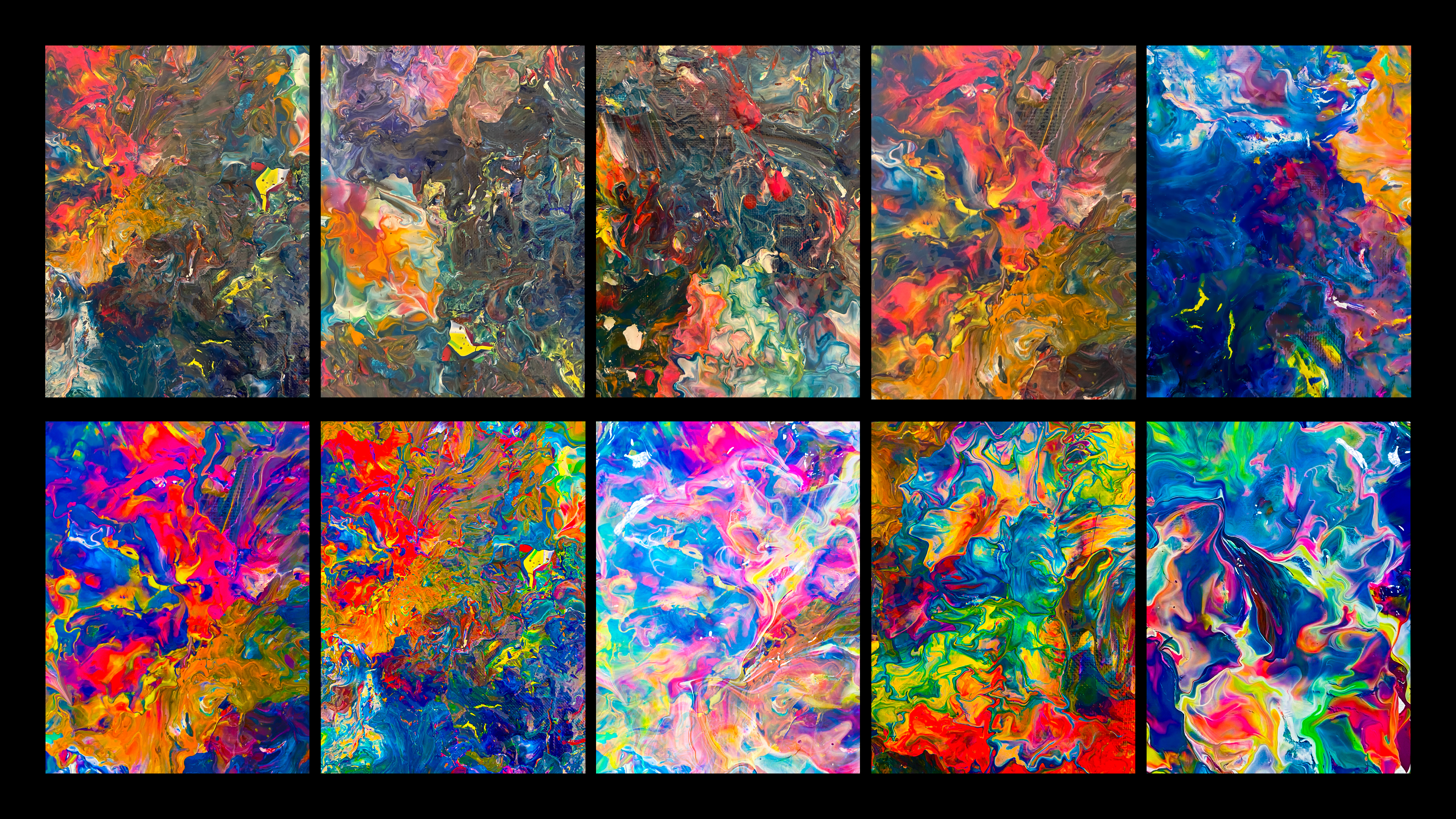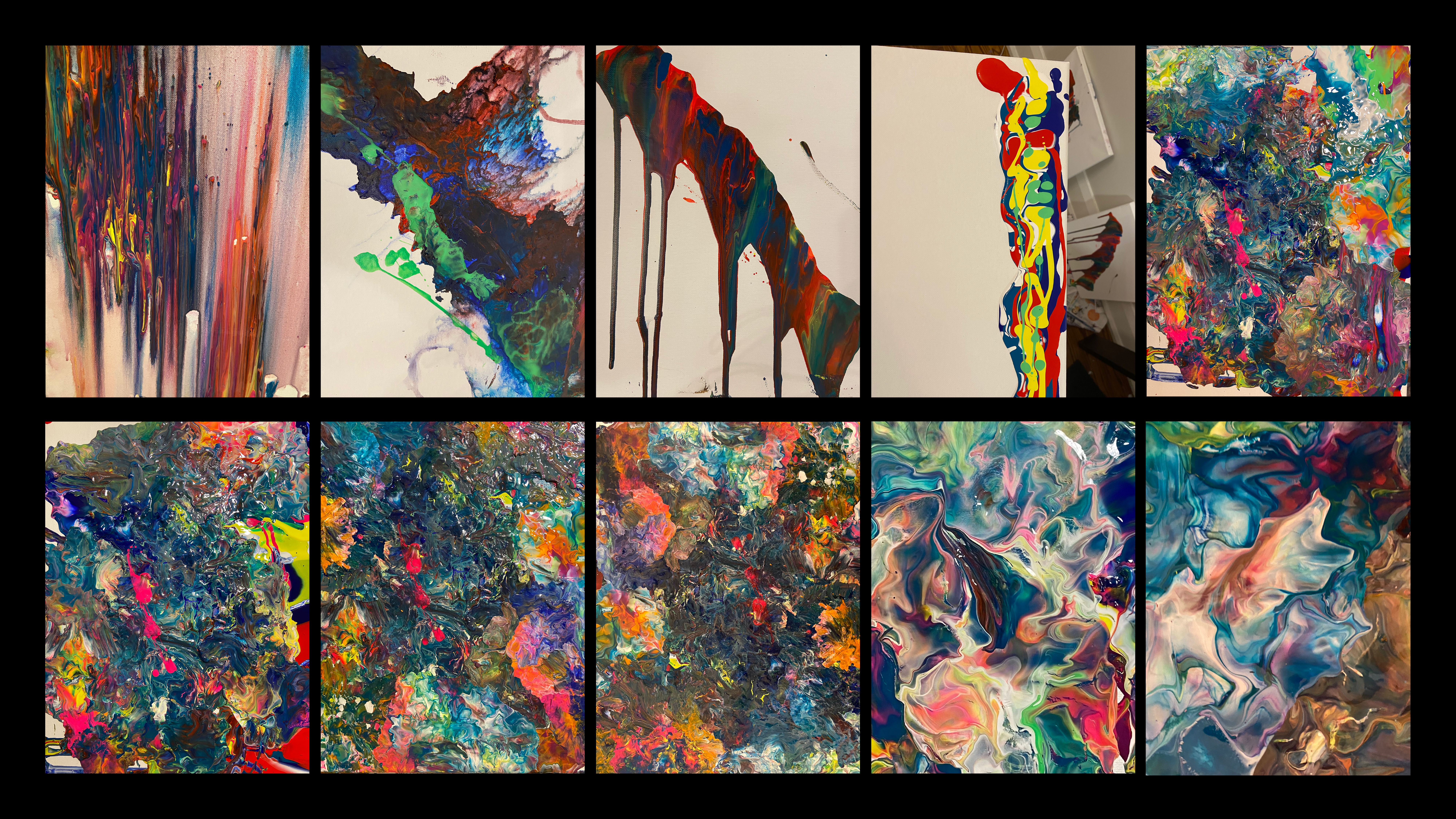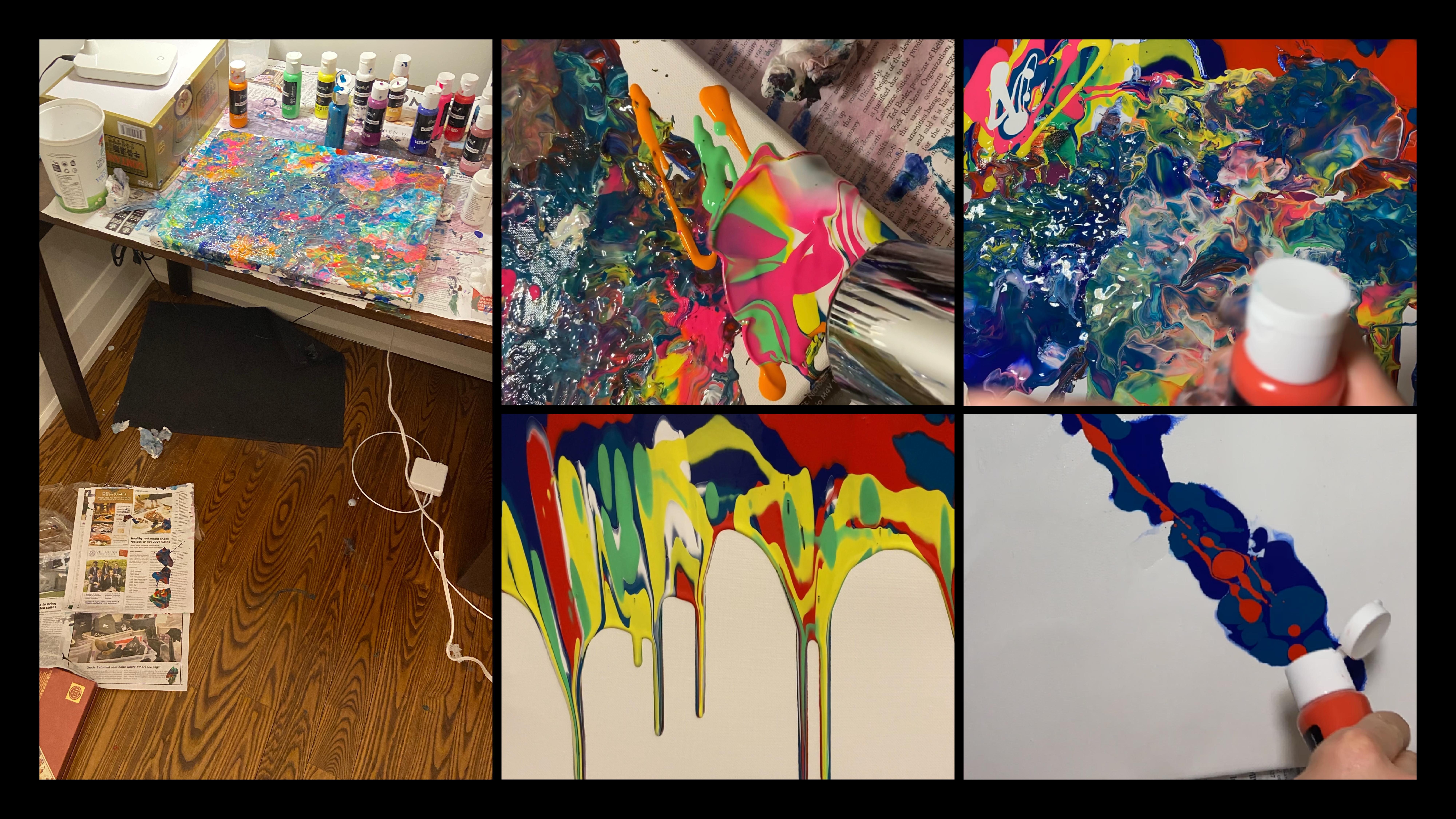 Painting Process 1 To create the abstract painting, I bought a set of canvas and acrylic paint. I dripped different colors of the painting onto the canvas and used the hairdryer to mix them.