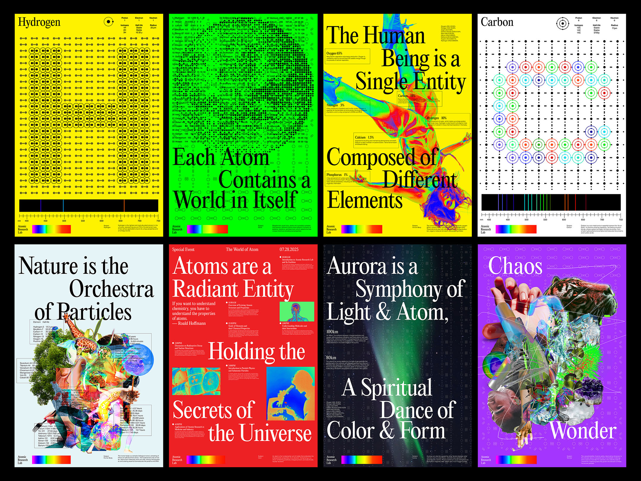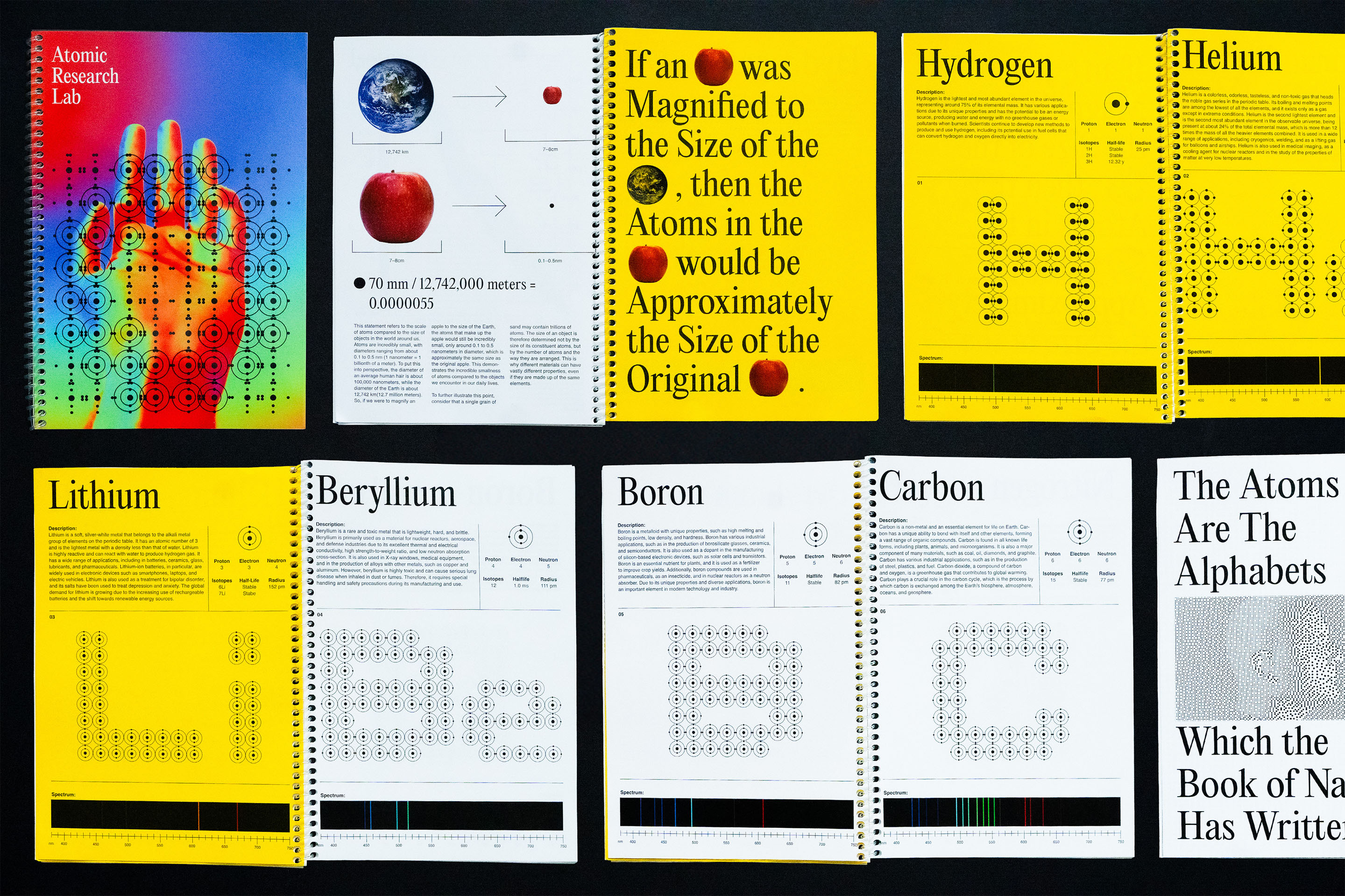 While researching atoms, a quote from physicist Neil Bohr described atoms as the fundamental building blocks of nature. This inspired the typographic part of the project, which uses the Bohr model of atoms as the foundation for the design. Each letterform consists of modules based on the atom representing the elements, allowing for a unique representation of each element.