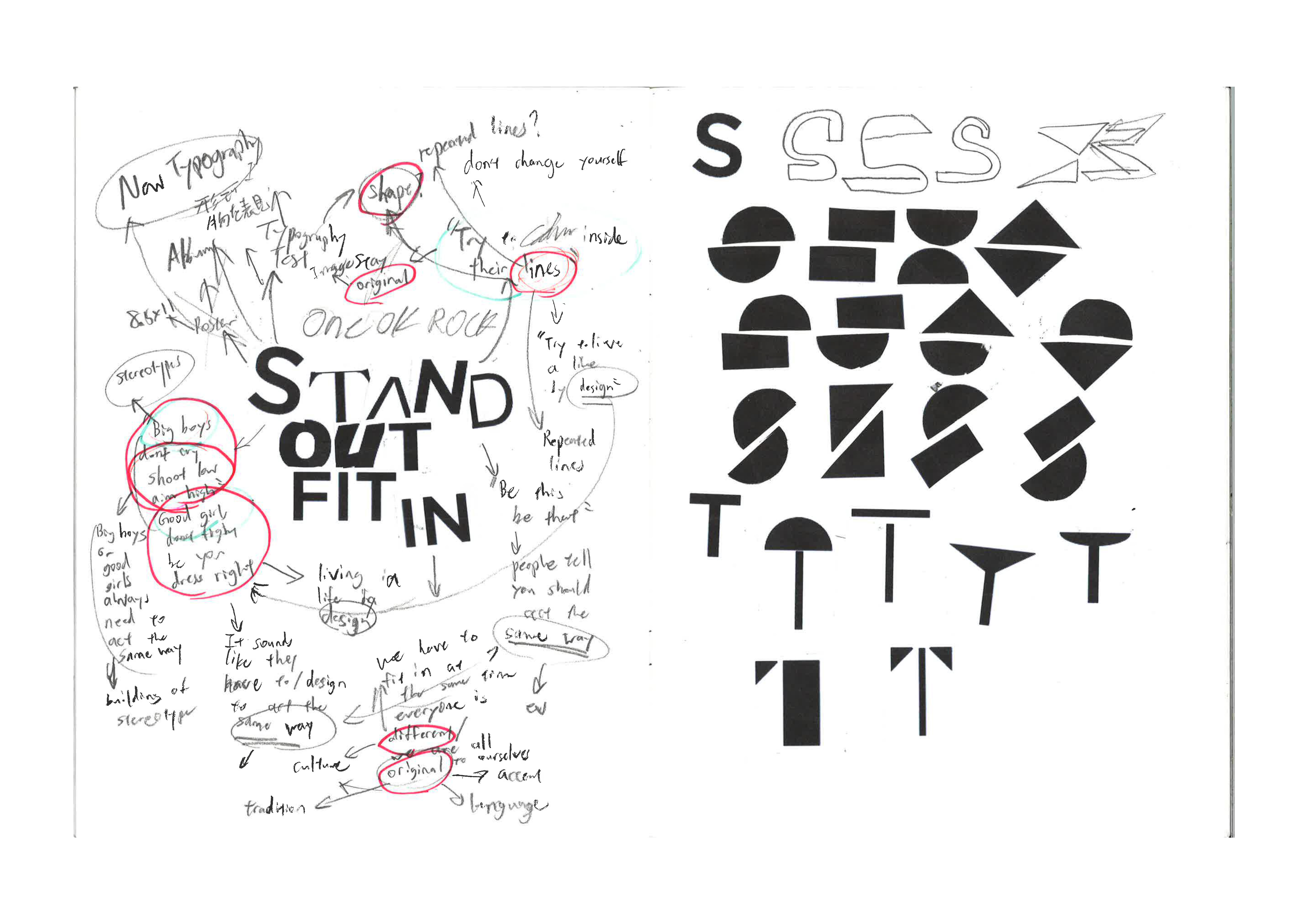 The goal of this personal project is to make an album design cover for the song, Stand Out Fit In by ONE OK ROCK. This song emphasizes the struggle of being yourself, fitting into a cultural or social norm no matter who you are. I created an original font using different shapes through Photoshop and Illustrator. I combined these shapes to represent the different social norms each person possesses. Just like these letters, our identity is based on the different shapes of our cultural background.