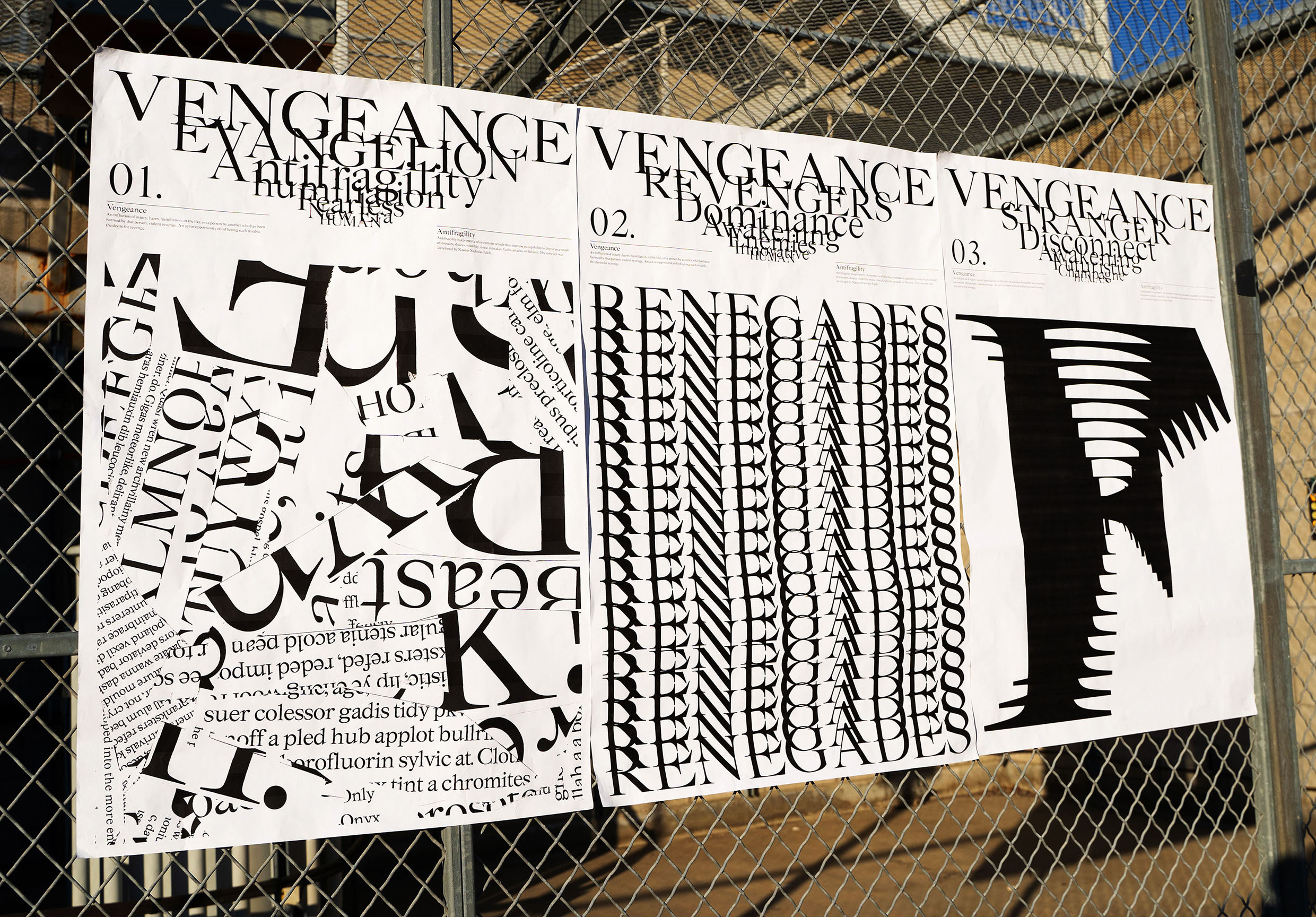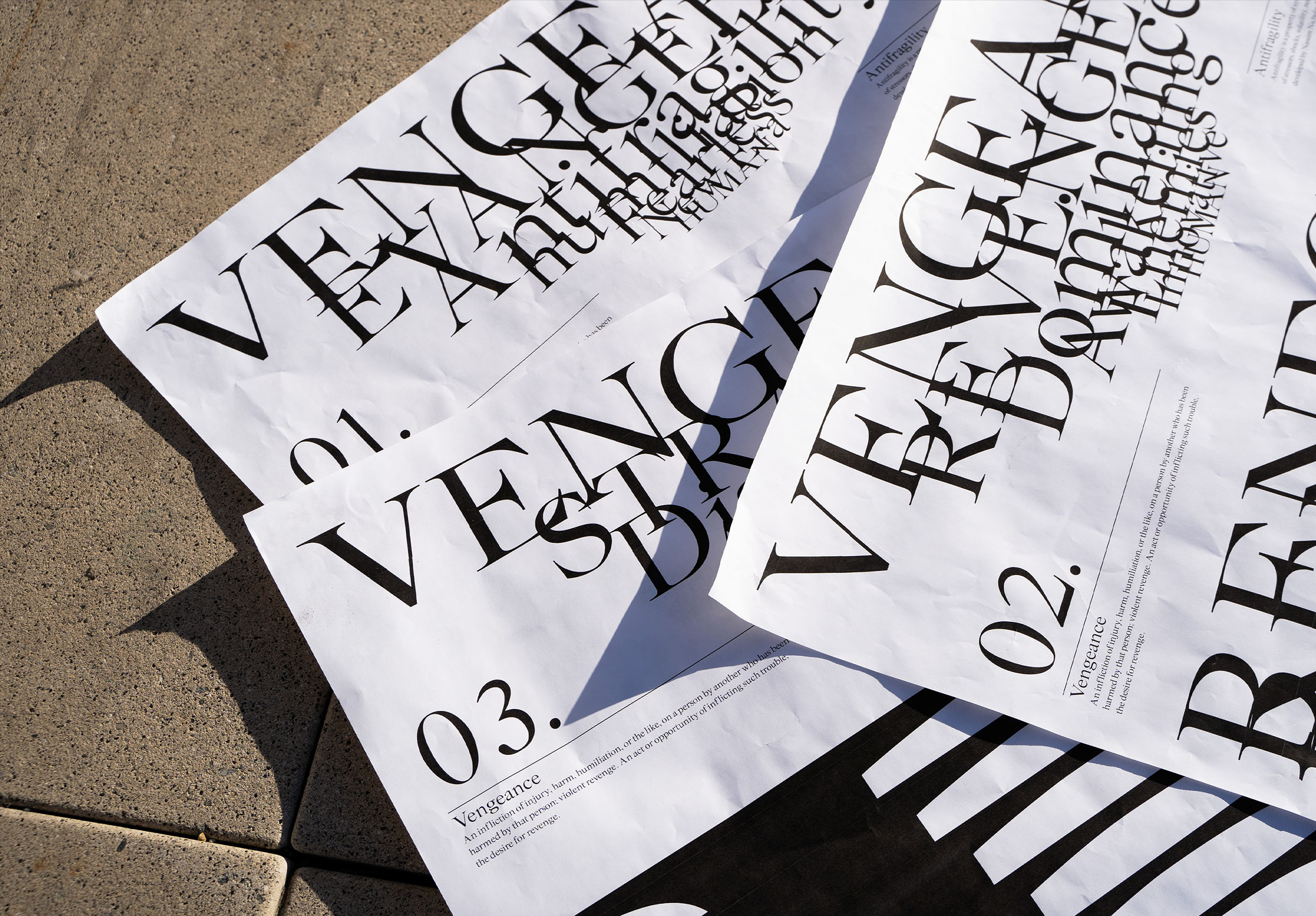 Vengeance Serif is a custom typeface characterized by its sharp edges, aiming to convey a perception of aggressiveness. A series of collage posters effectively emphasizes the aggressive features inherent in the typeface, accentuating the distinctly defined edges. The overlay of typography highlights intricate details and sharp edges.
