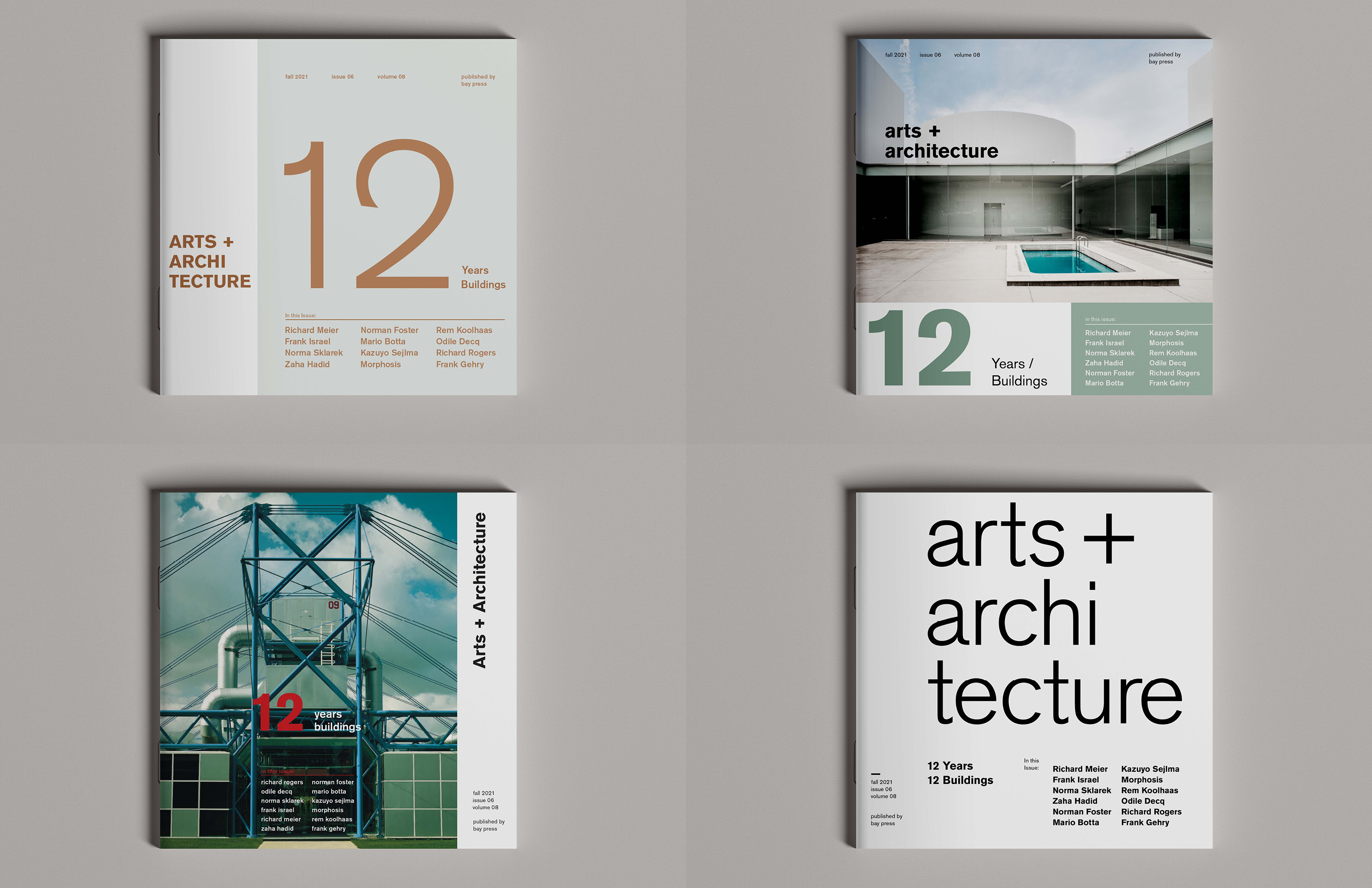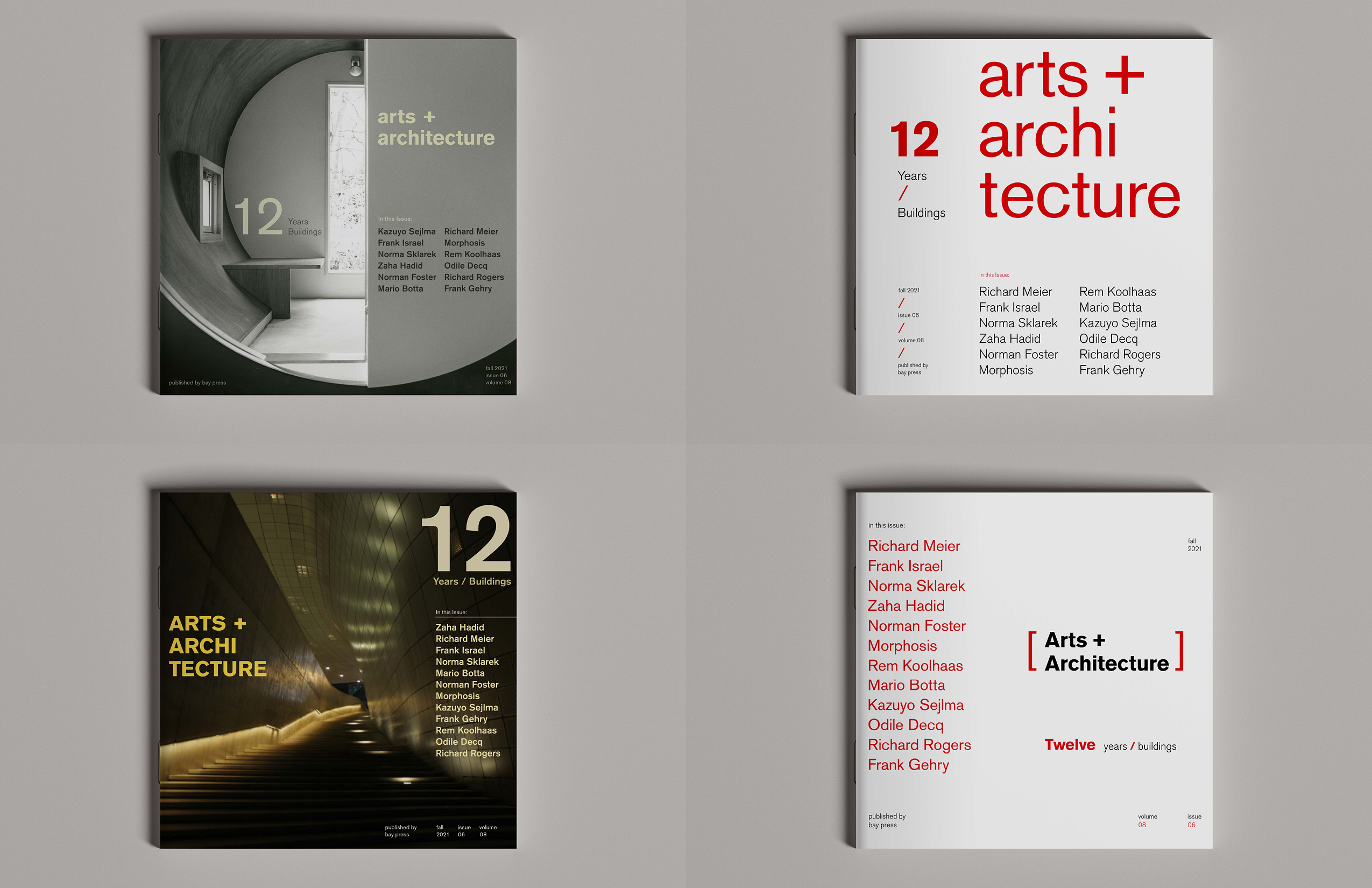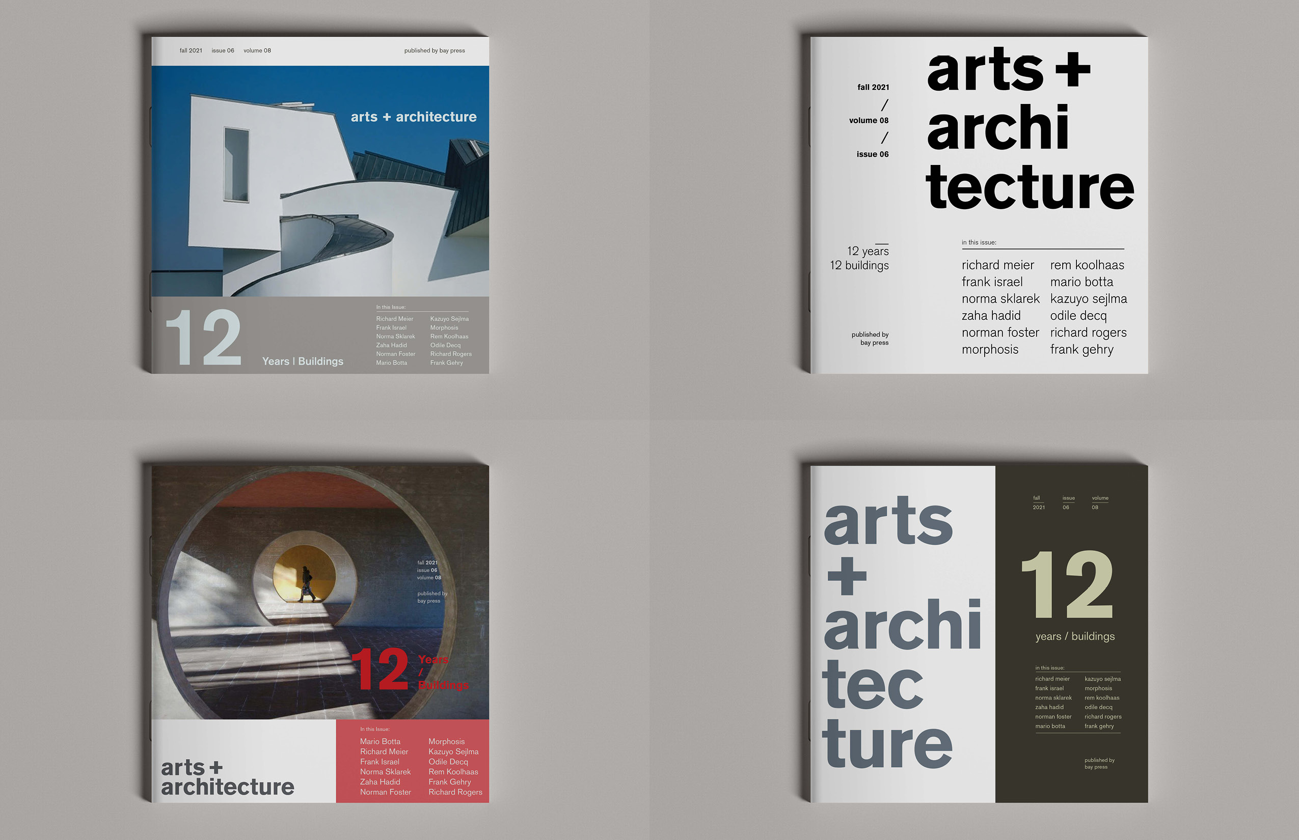 I created 20 different cover layouts to design an architecture magazine called Arts + Architecture. Given texts is including title, subtitle, architects, dates, and publication. We created 20 different layout designs using different weights, colors, sizes, rules, bars, and photos each week.