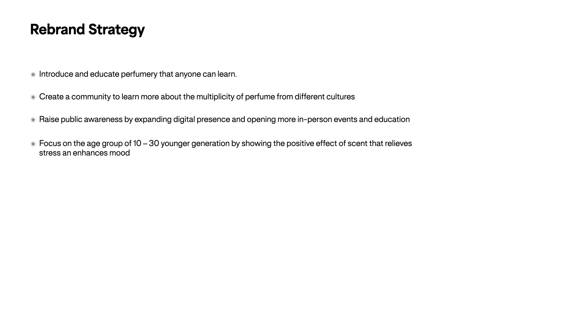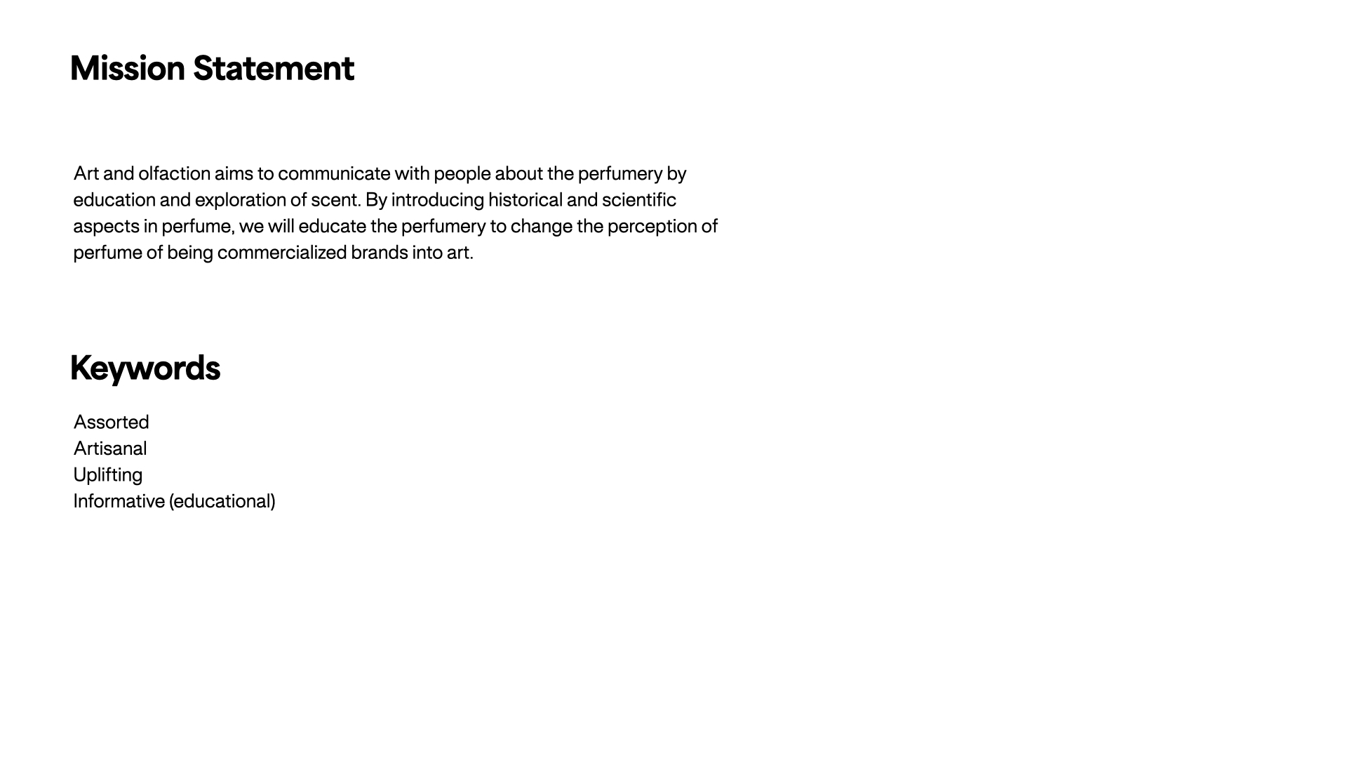 Art and olfaction aims to communicate with people about the perfumery by education and exploration of scent. By introducing historical and scientific aspects in perfume, we will educate the perfumery to change the perception of perfume of being commercialized brands into art.