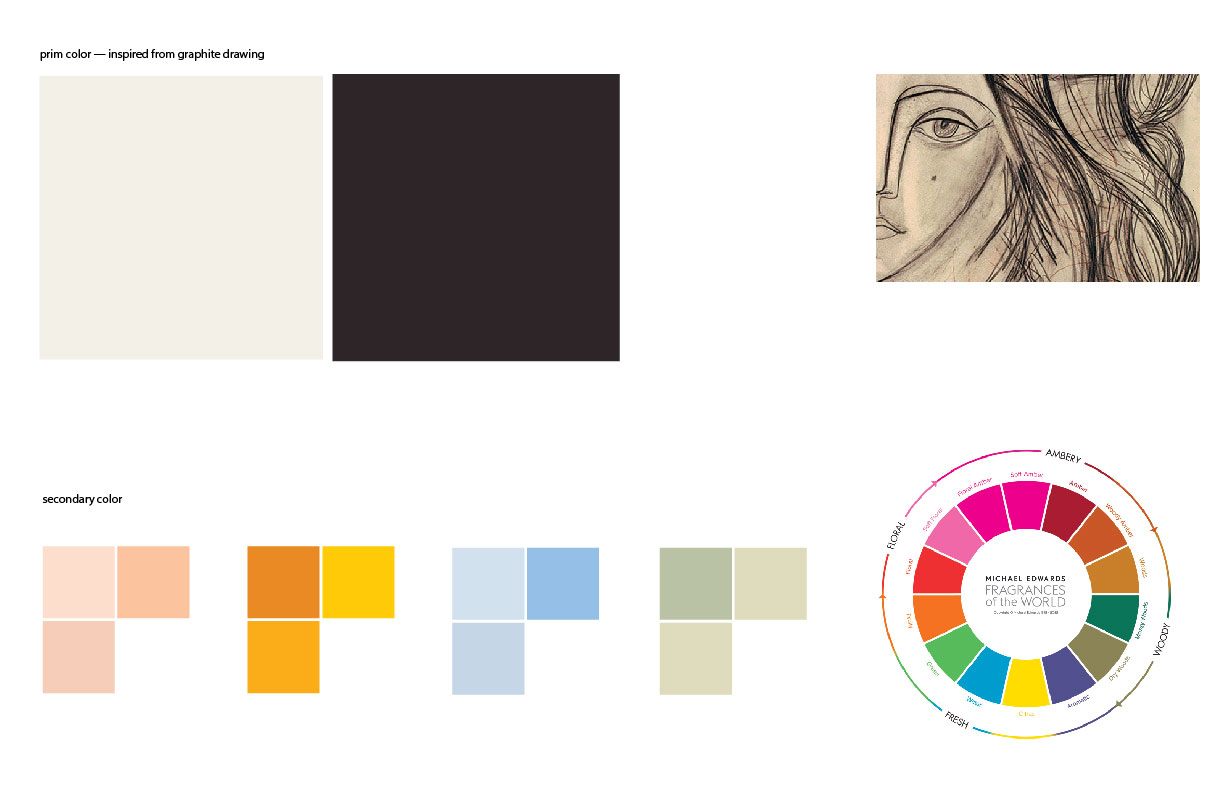 Color palette (primary colors inspired from artistic mood pulled from the scent exploration of the institution / secondary colors from the fragrance wheel representing four different fragrance: floral, amber, fresh, woody)