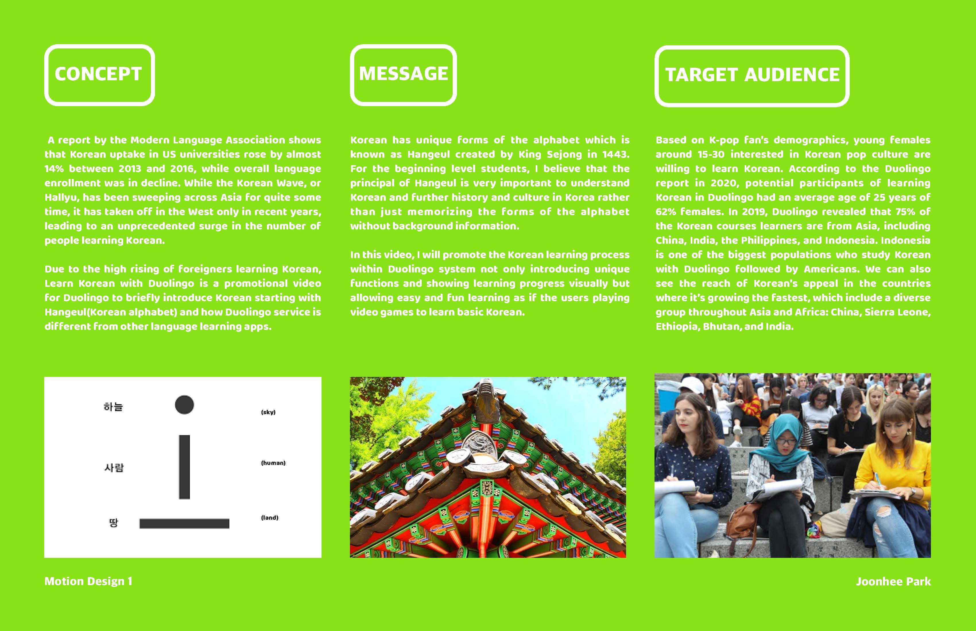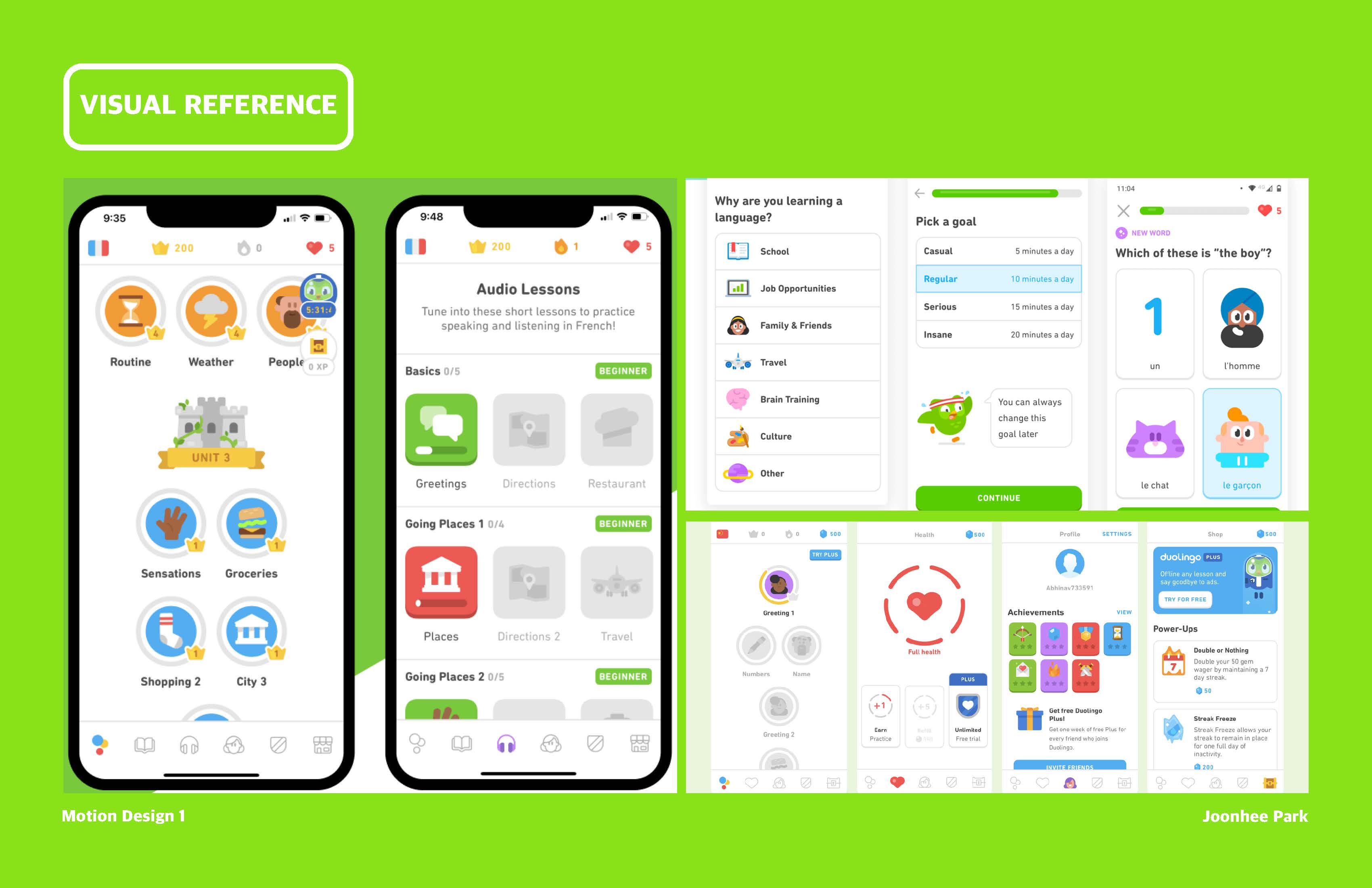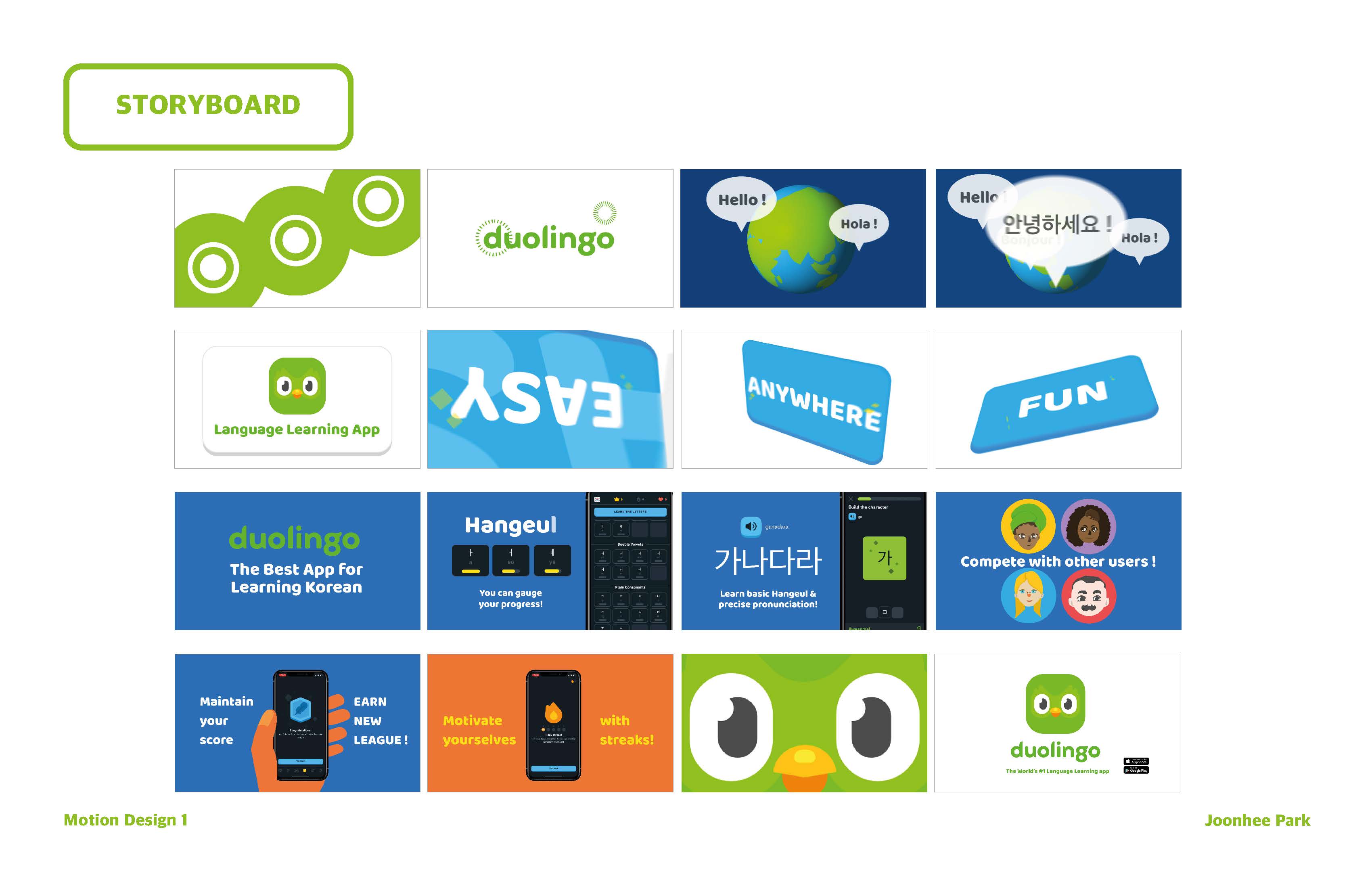 Duolingo is one of my favorite apps that is very useful for beginner-level learner with playful and welcoming design aesthetics. This project was a good opportunity to research and learn more about their marketing, design aesthetics, and educational strategy. Also, it was a good experience to practice with type and graphic animation and edit the music to match the animation.