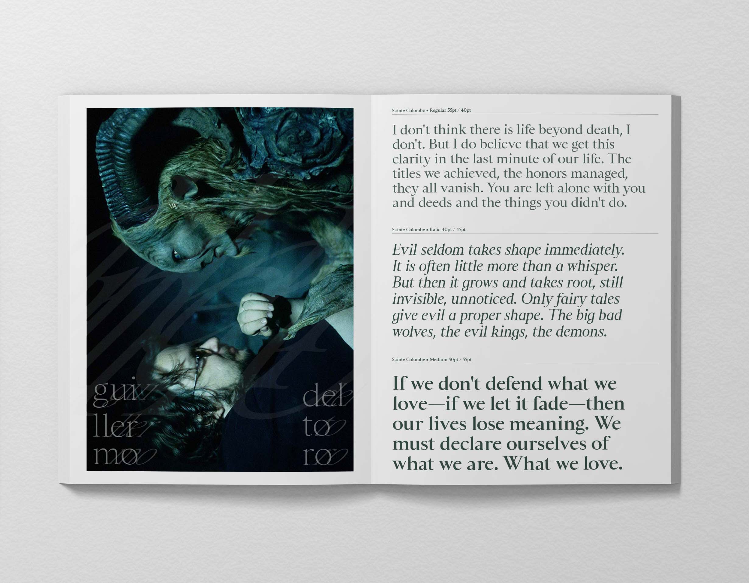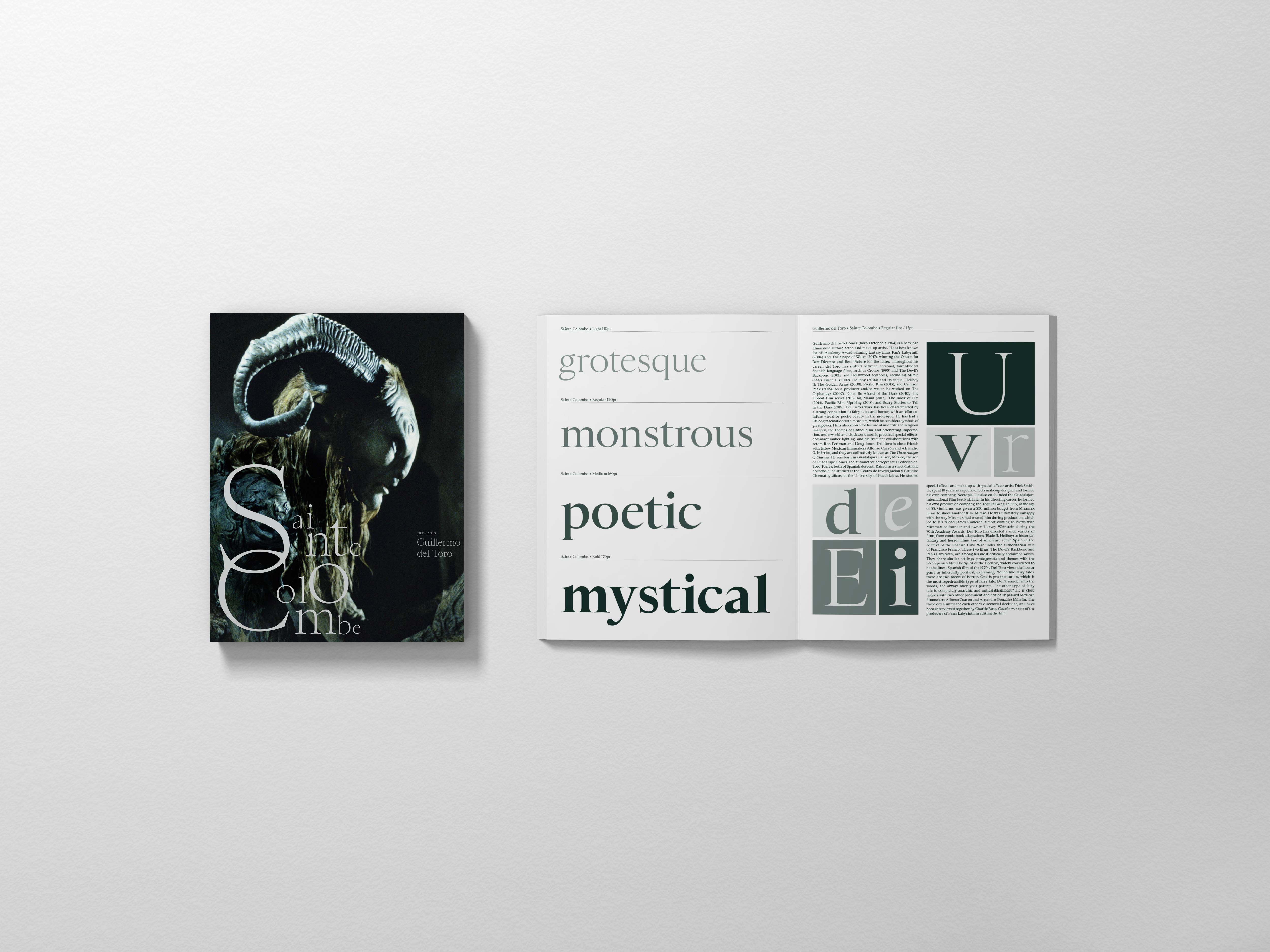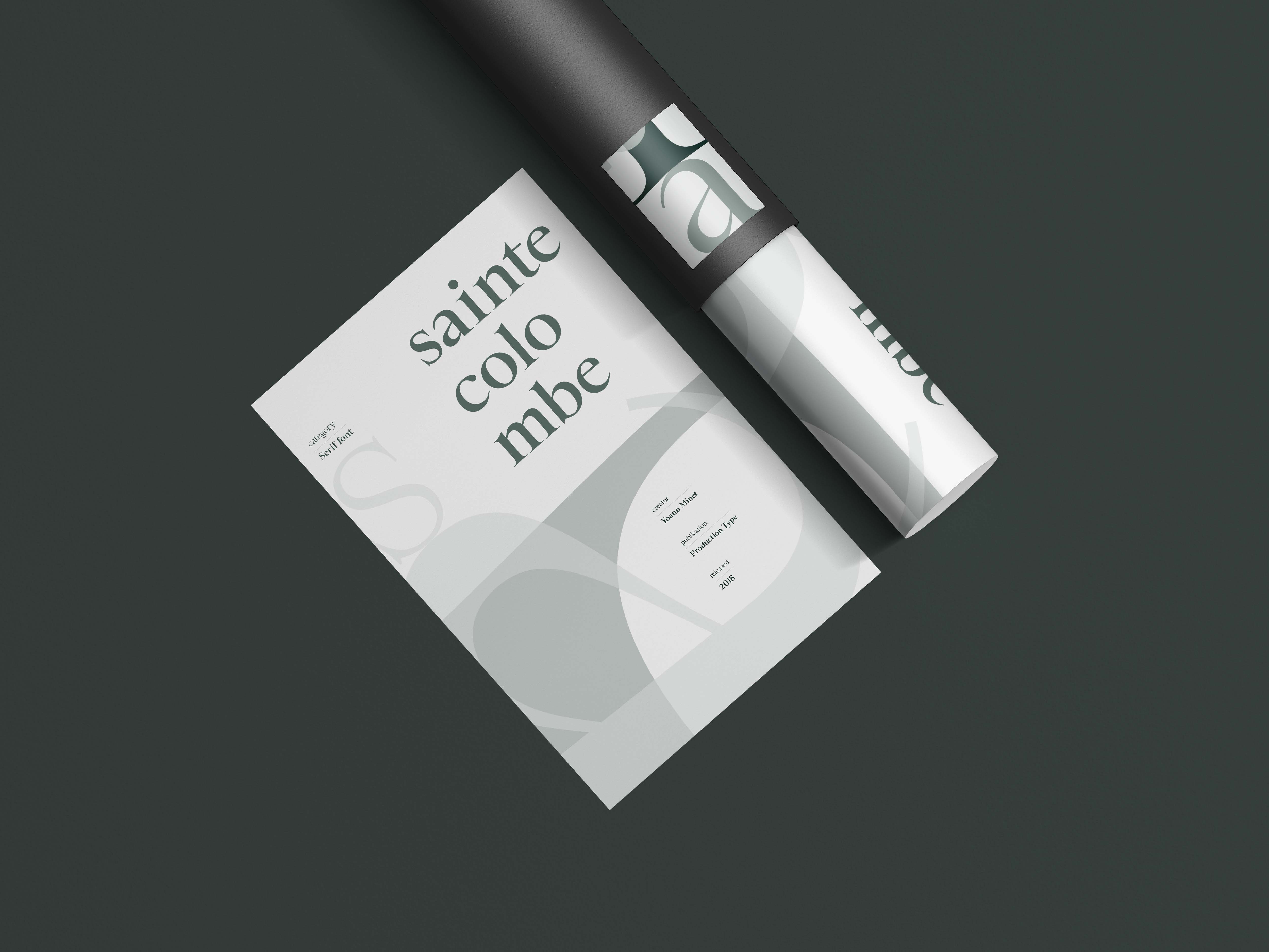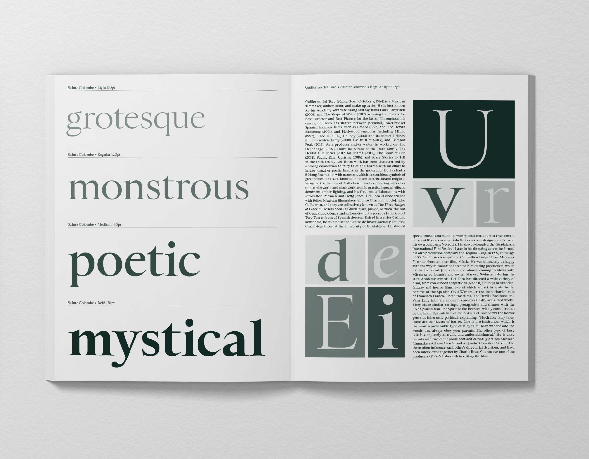 Sainte Colombe specimen booklet and poster presents the new serif-face Sainte Colombe designed by Production Type in 2018. The booklet contains information about Sainte Colombe and the filmmaker Guillermo Del Toro with his film "Pan's Labyrinth". The poster shows the big scale letterform and introduces brief information of the typeface:: category, creator, publication, and date.