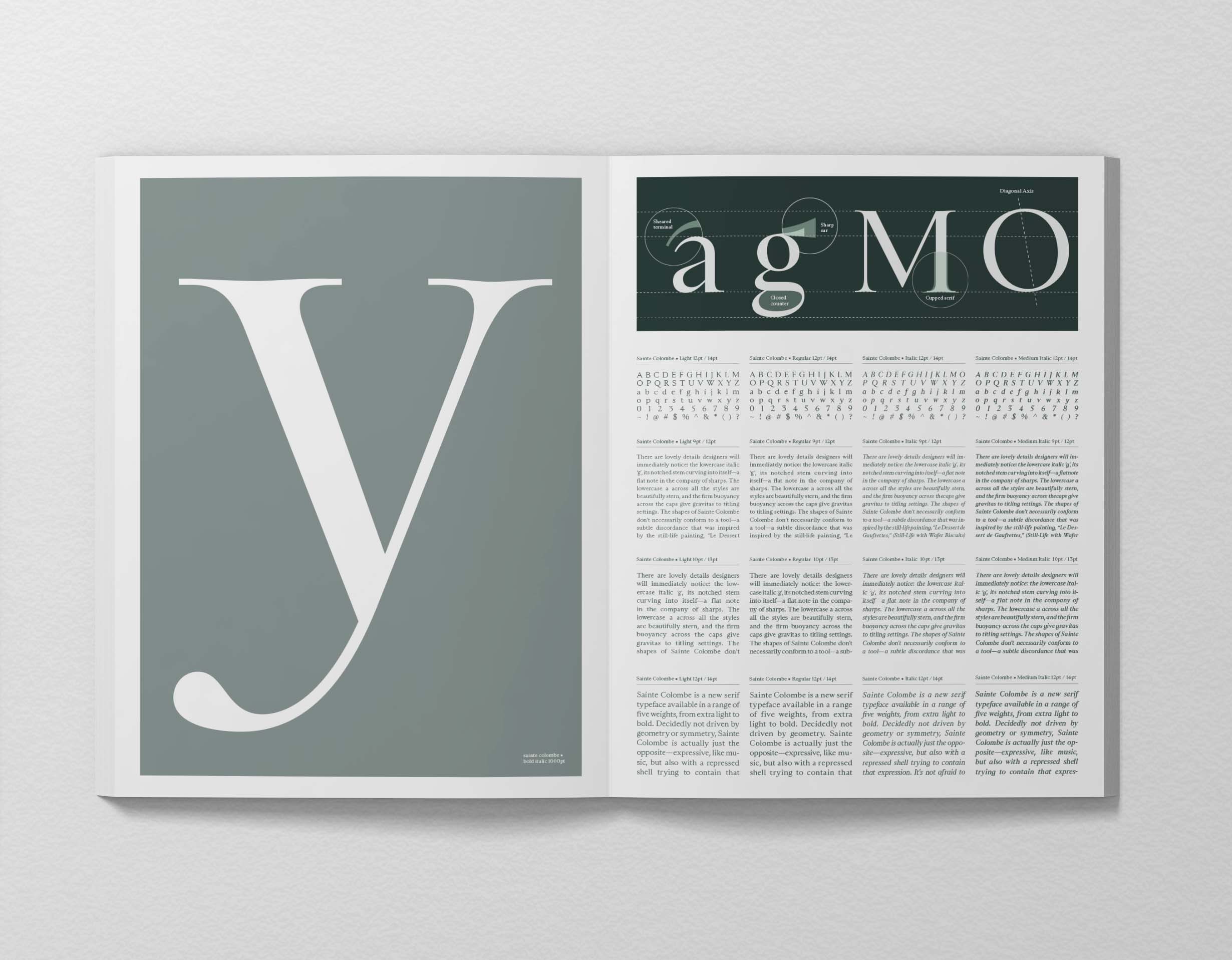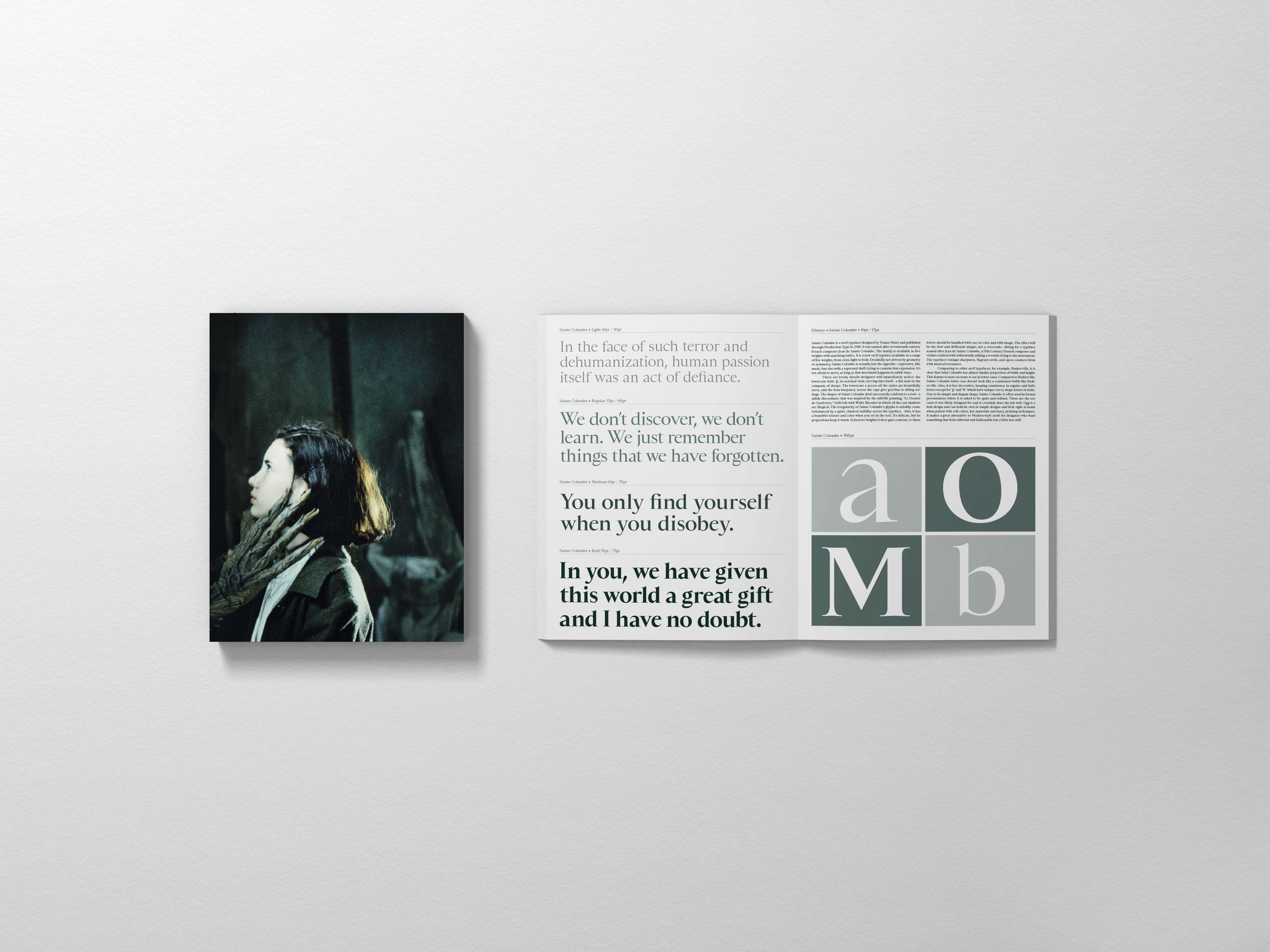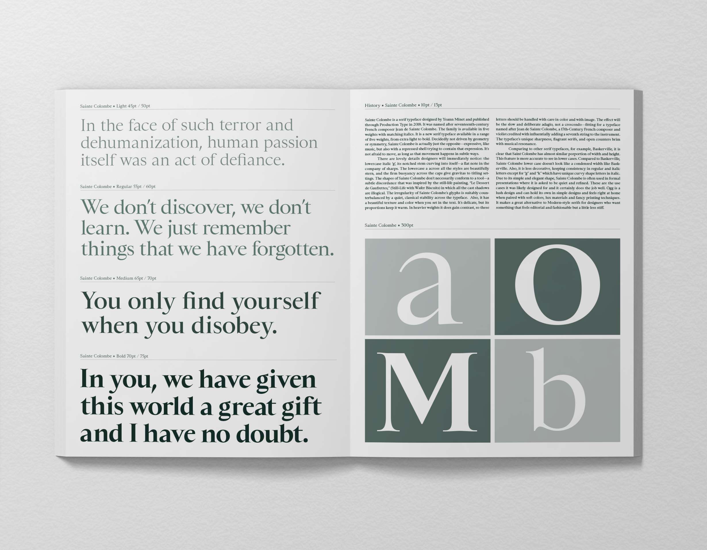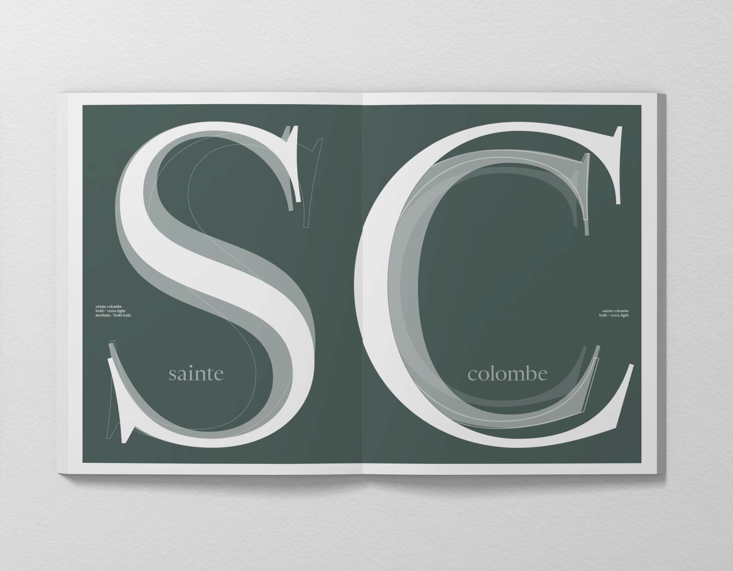 Sainte Colombe specimen booklet and poster presents the new serif-face Sainte Colombe designed by Production Type in 2018. The booklet contains information about Sainte Colombe and the filmmaker Guillermo Del Toro with his film "Pan's Labyrinth". The poster shows the big scale letterform and introduces brief information of the typeface:: category, creator, publication, and date.