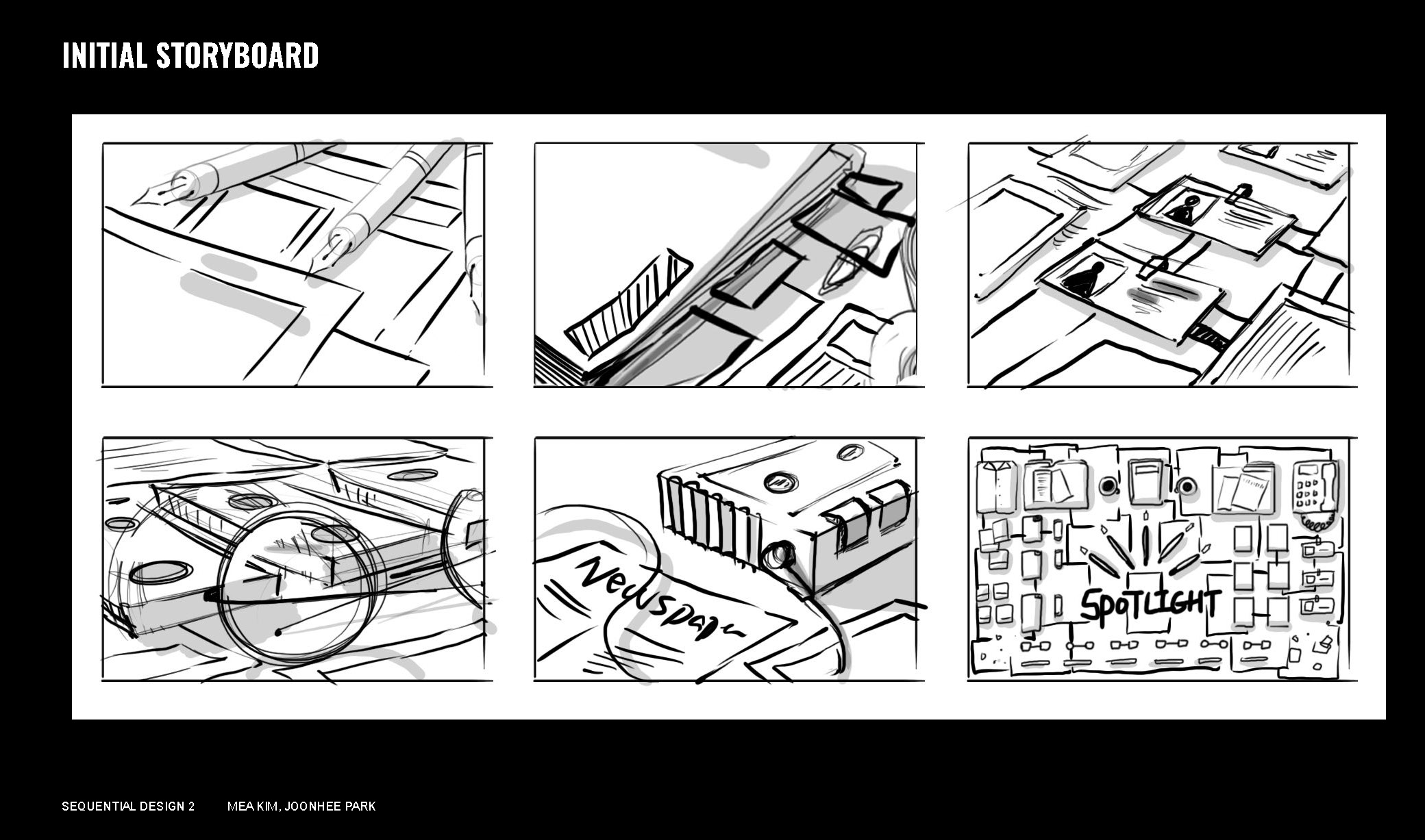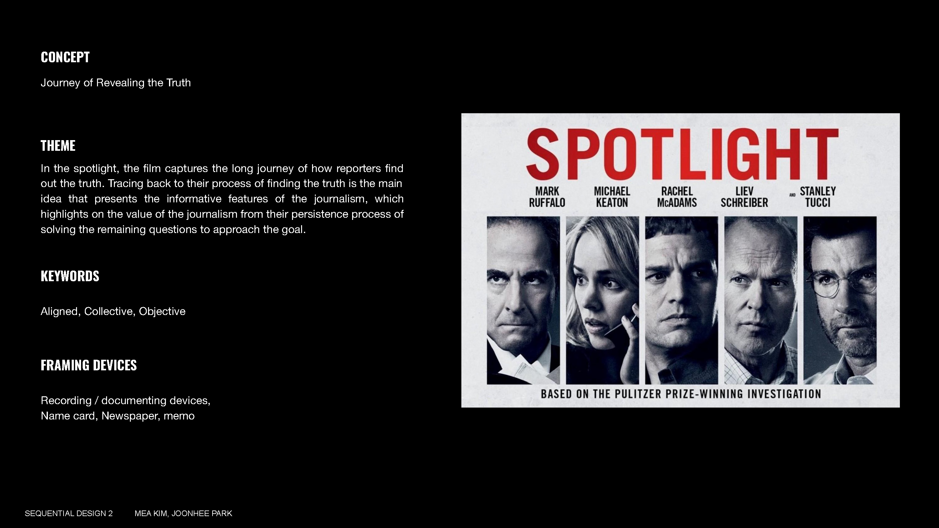 Spotlight captures the long journey of how journalists find out the truth. Tracing back to their process of finding the truth is the main idea that presents the informative features of the journalism, which highlights on the value of the journalism from their persistence process of solving the remaining questions to approach the goal. By slowly revealing and observing the objects that journalist documenting tools, the sequence emphasizes on the process of journalism and its relevance.