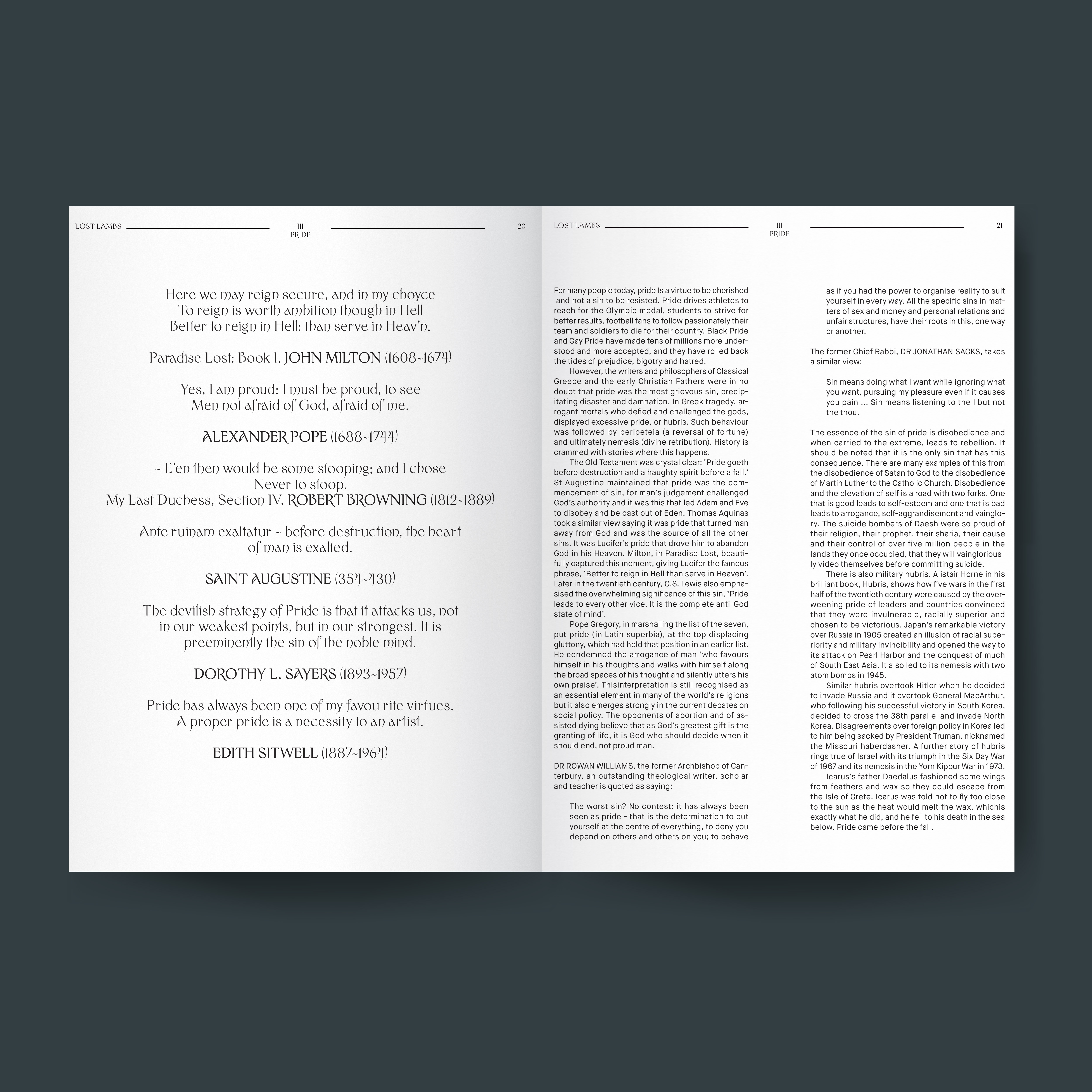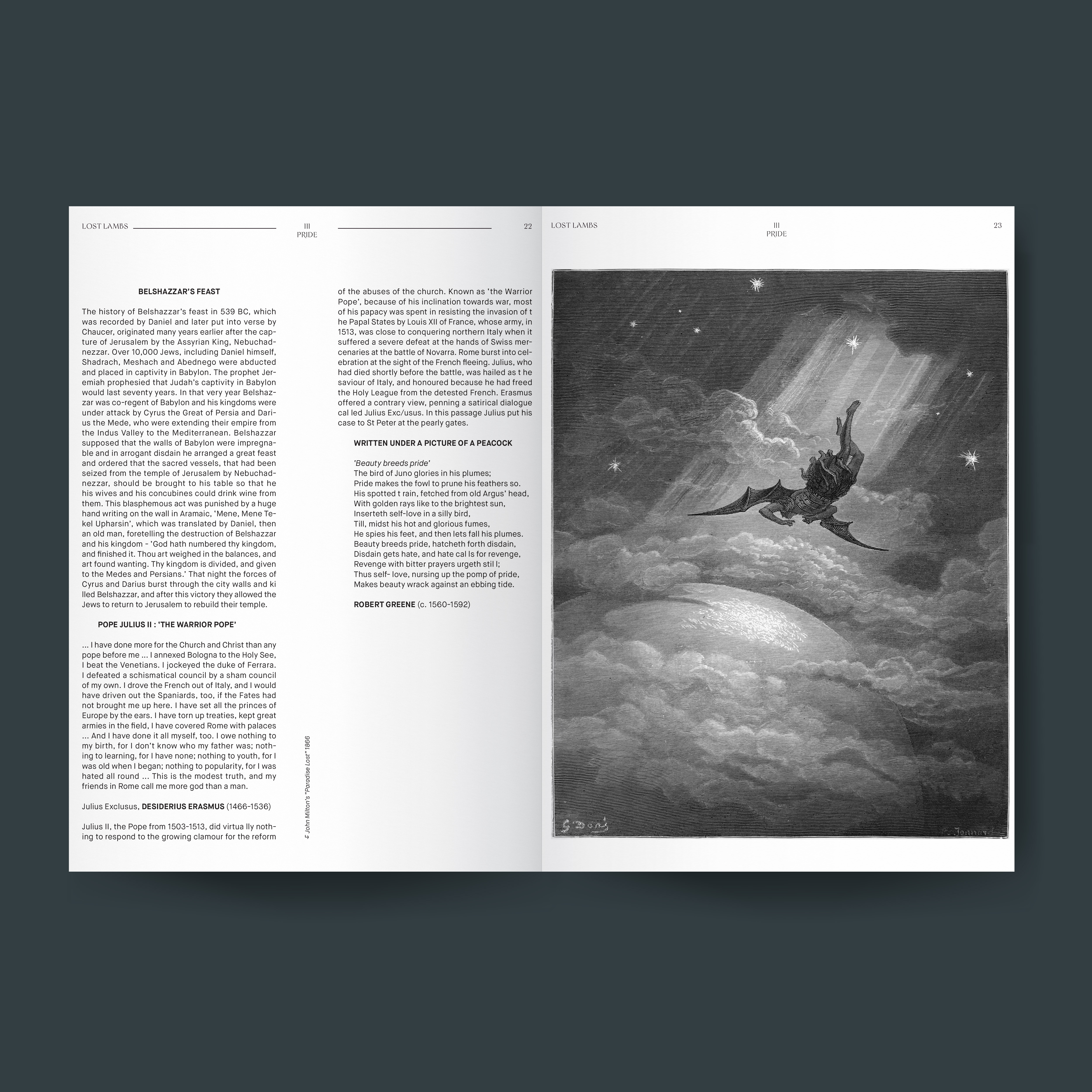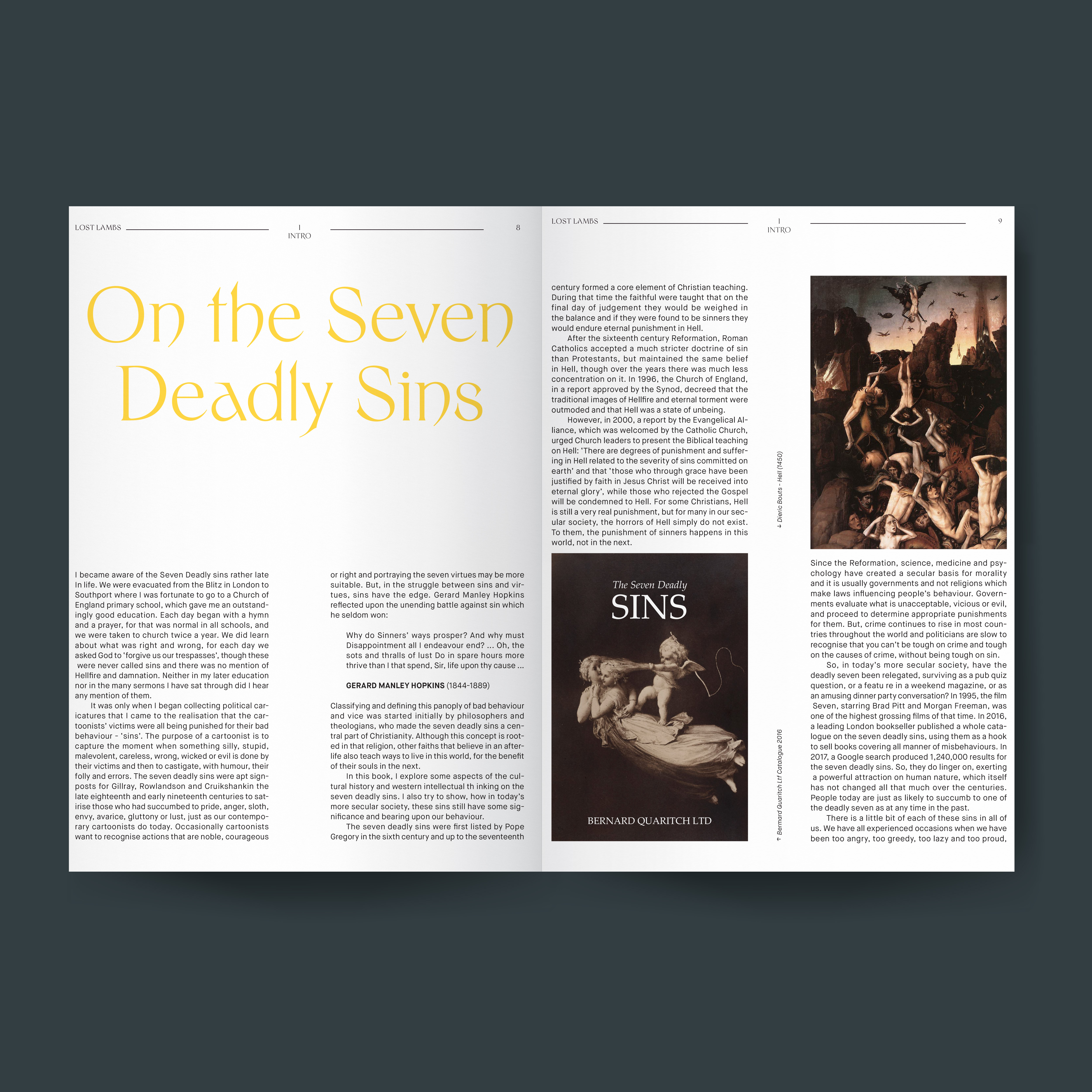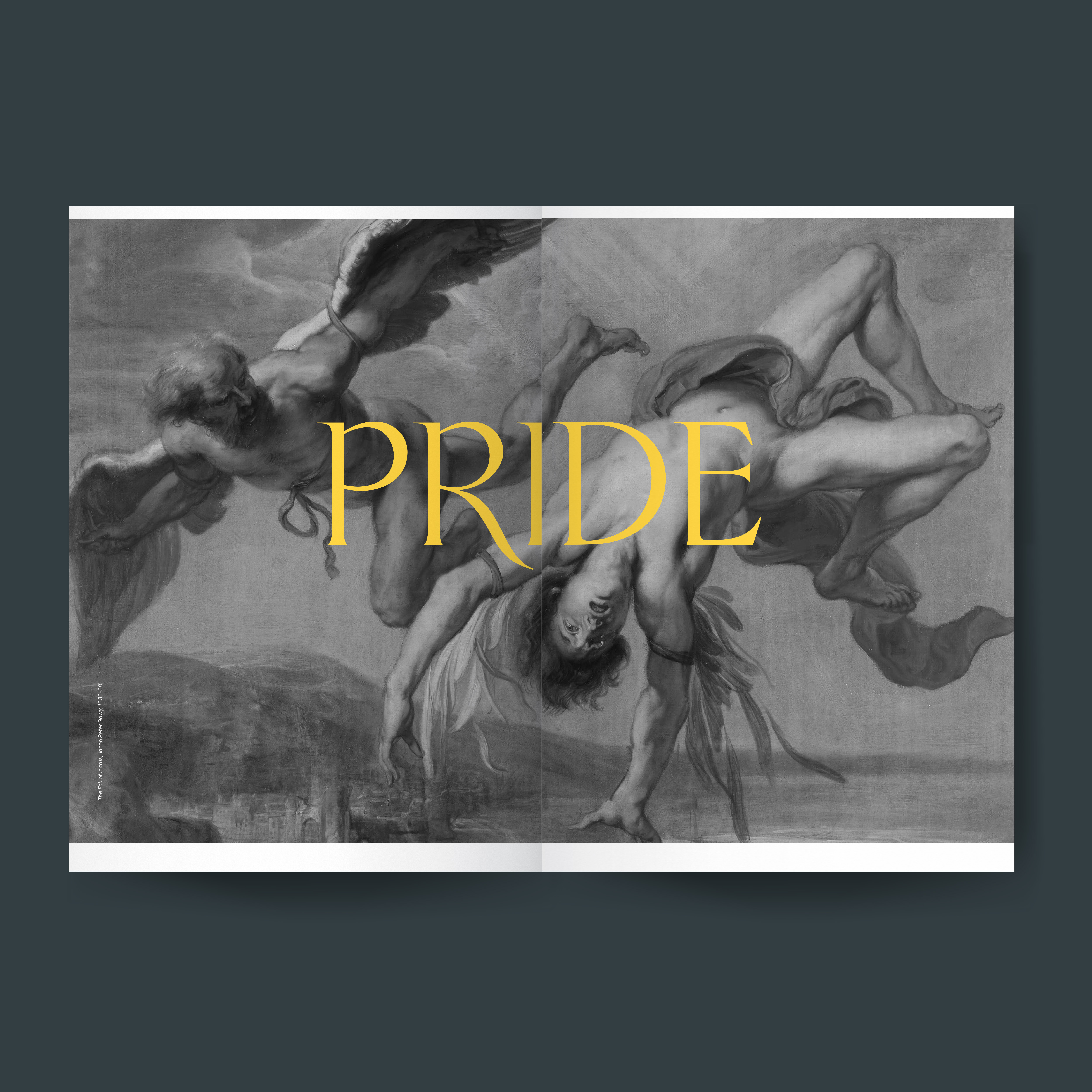 For this book design, I came up with the concept of the seven deadly sins in art. Partnered with SF MOMA this book showcases the work of artists present in the museum. Each chapter in the book goes over each sin and where the artwork of the artist falls in their relative sin such as Pride. I drew a majority of my inspiration from my parent's bible.
