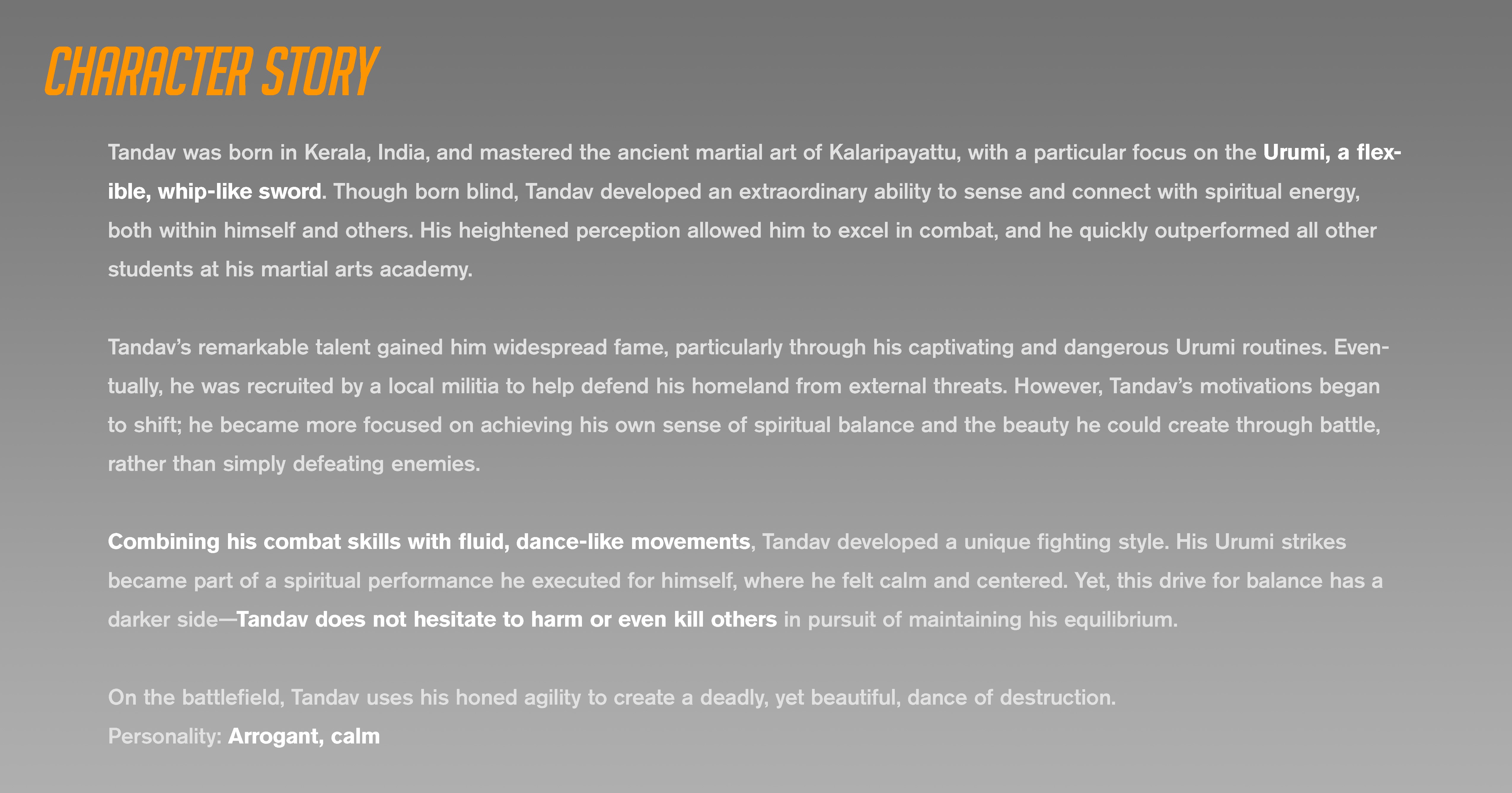 Tandav is a fan-made Offense hero concept for Overwatch, imagined as a fast and fluid fighter who wields the Urumi, a flexible, whip-like sword.