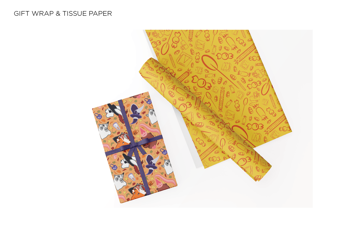 The wrapping paper and tissue paper for the halloween gift set. I wanted the main cast (plot A) to be on the wrapping paper, and to have the cheese mouse (plot B) to be on the tissue paper.