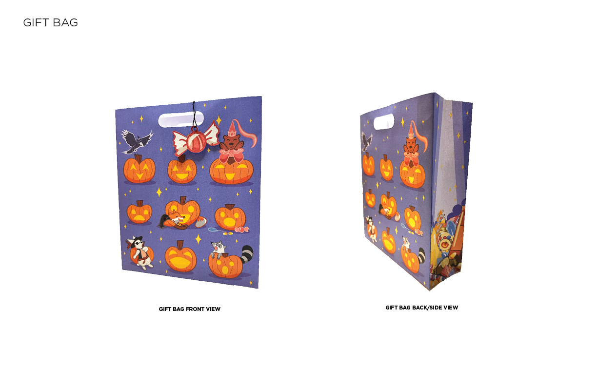 The gift bag for the halloween gift set. I had a lot of fun designing and illustrating the side of the bag, which depicts the inside of a bag of candy on halloween. But the cheese mouse has made it into the bag, and is enjoying the candy.