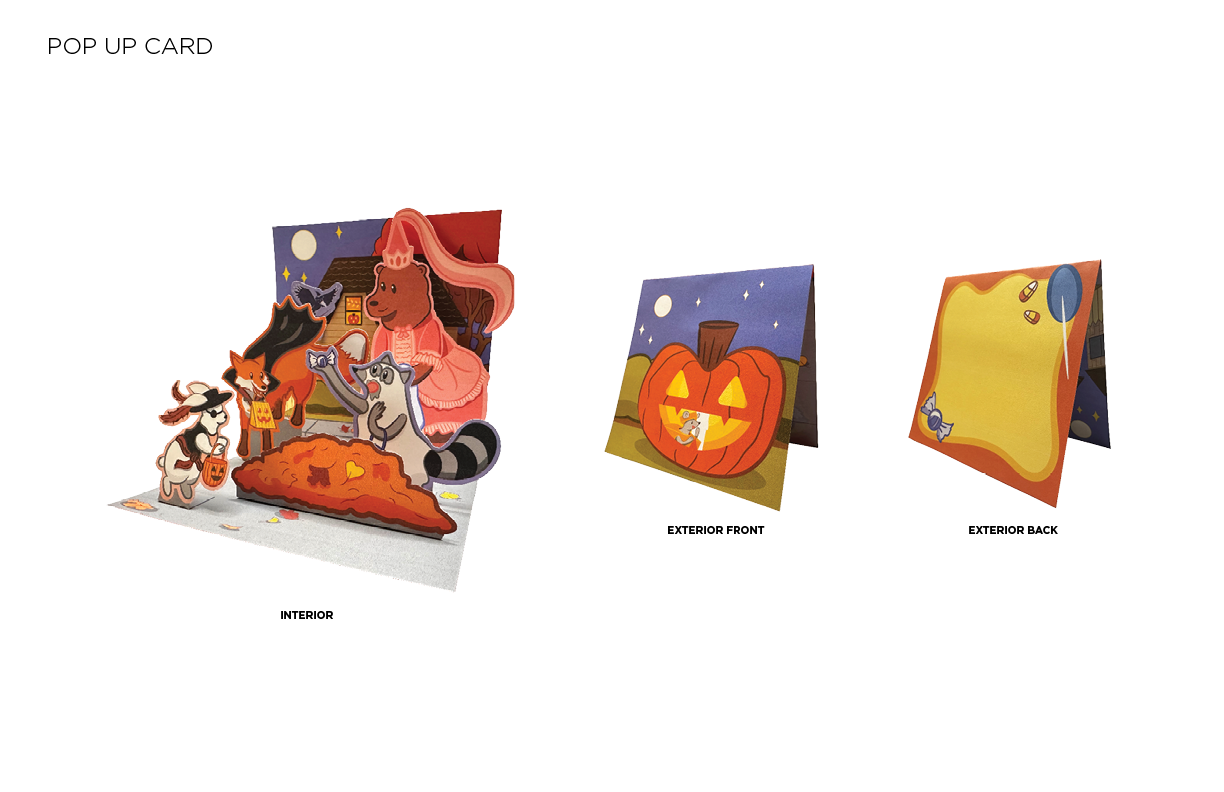 The pop-up card for the halloween gift set. I wanted to depict the trick or treating animals having fun going from house to house. It was a bit of a challenge to get the sizes of animals to read in pop-up form. But It all came together in the end.