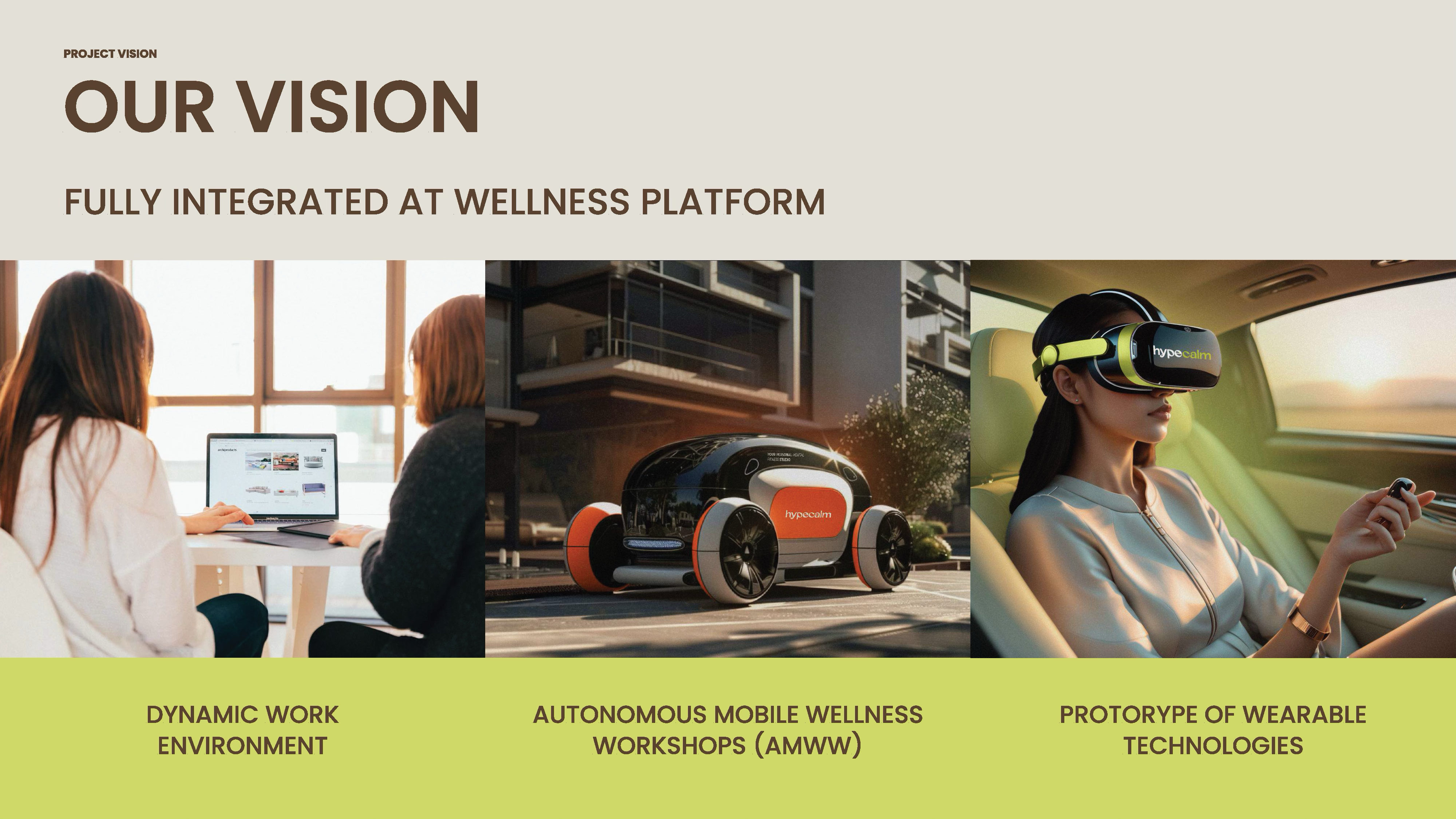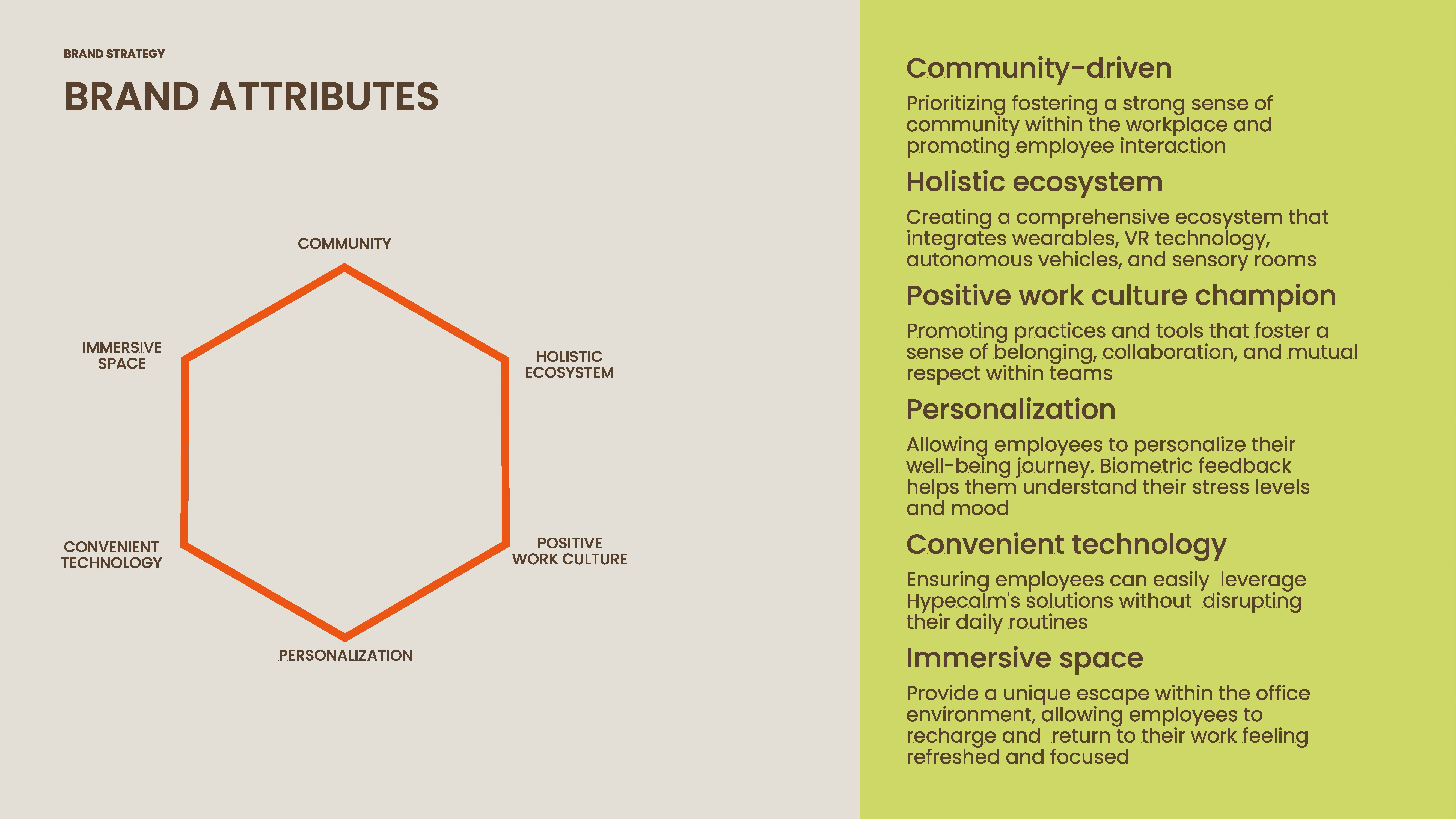 In the HypeCalm project, developed with three other brand strategists, we aimed to integrate workplace wellness into corporate culture. Our ecosystem empowered employees to manage their well-being with wearable tech and immersive programs, offering real-time insights and personalized guidance for accessible and tailored wellness.