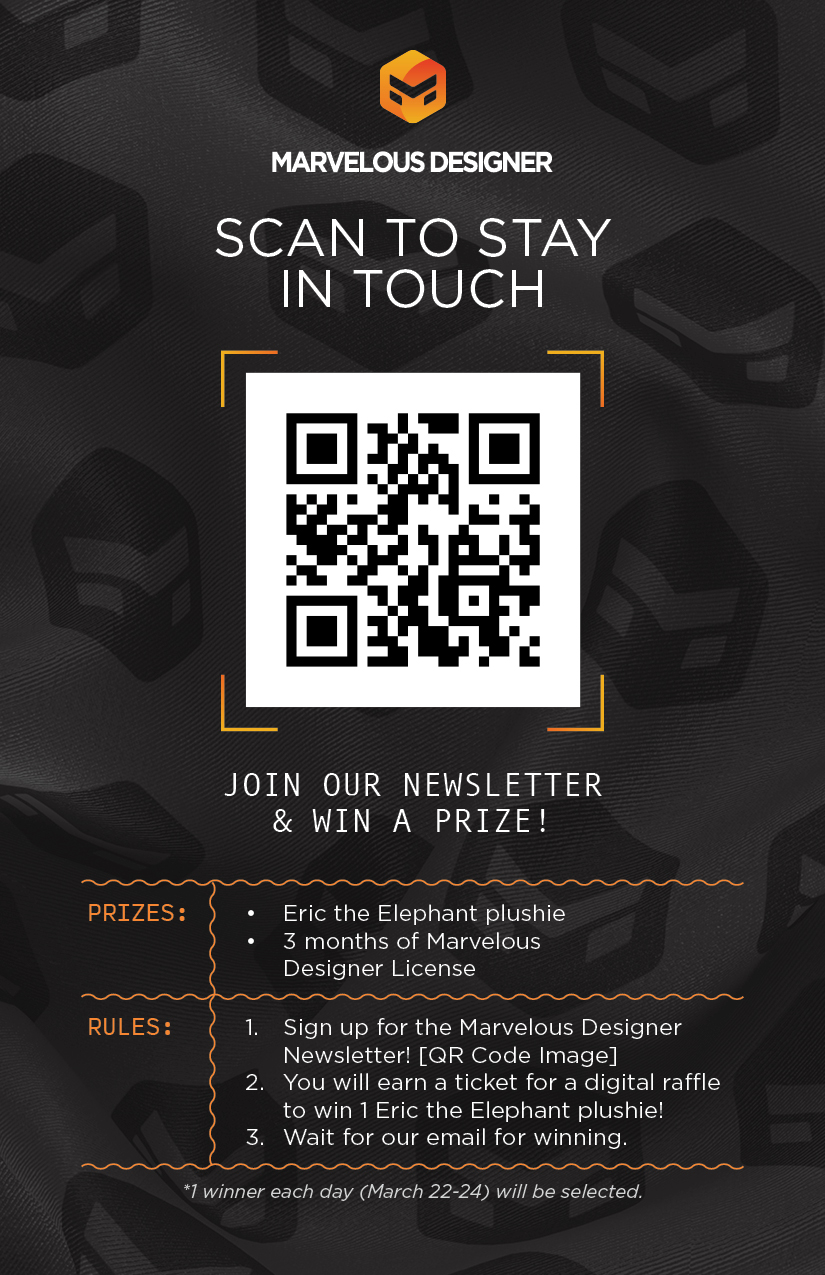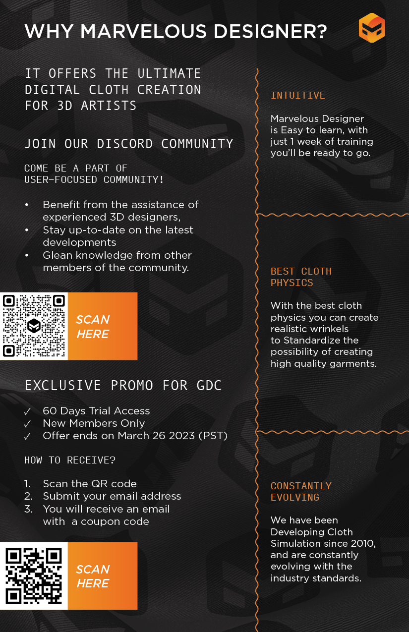 Elevate Your Design Reality: Marvelous Designer at GDC 2023. As the nerve center of innovation and community in game development, the Game Developer's Conference is where we unveil a new echelon of user engagement. Our booth immerses you in an interactive panorama—live demos by our 3D design maestros, a curated gallery featuring our power users' art, and interactive stations that embody our core value: a relentless focus on our user base.