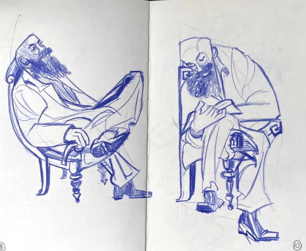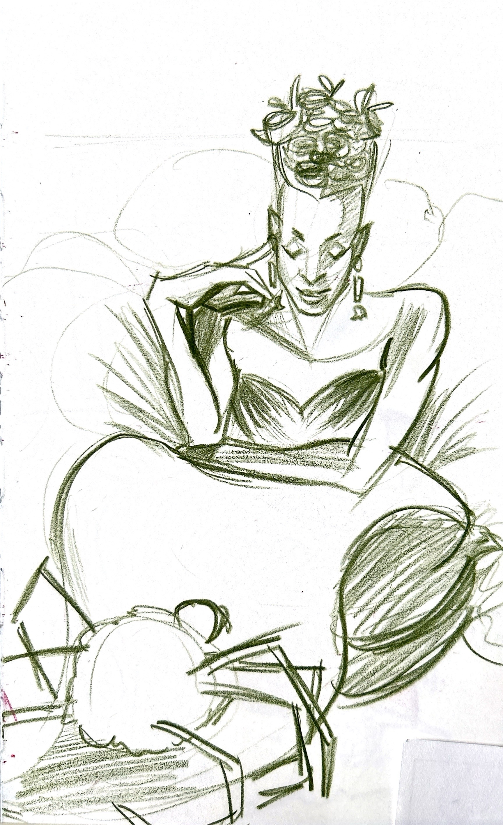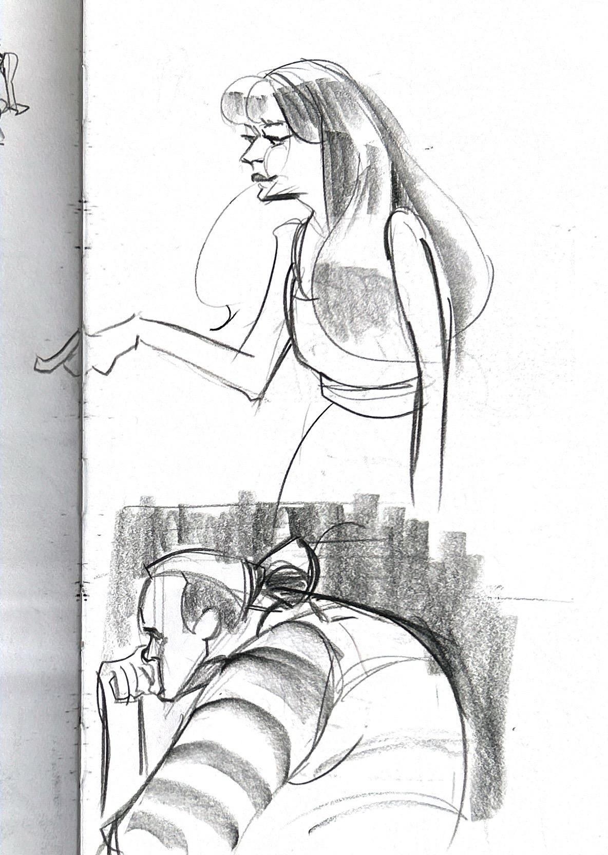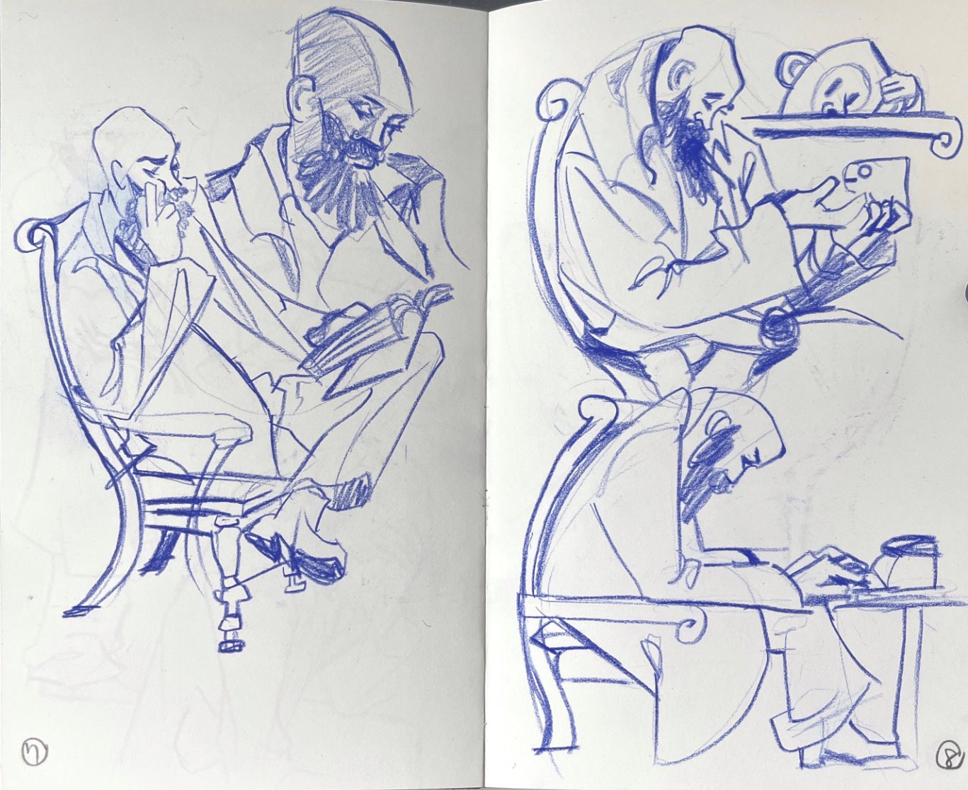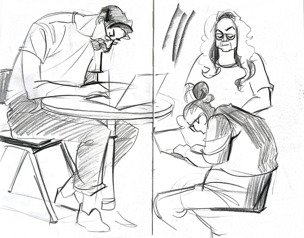 Experimental life drawings I did in cafés and life drawing workshops using colored pencils.